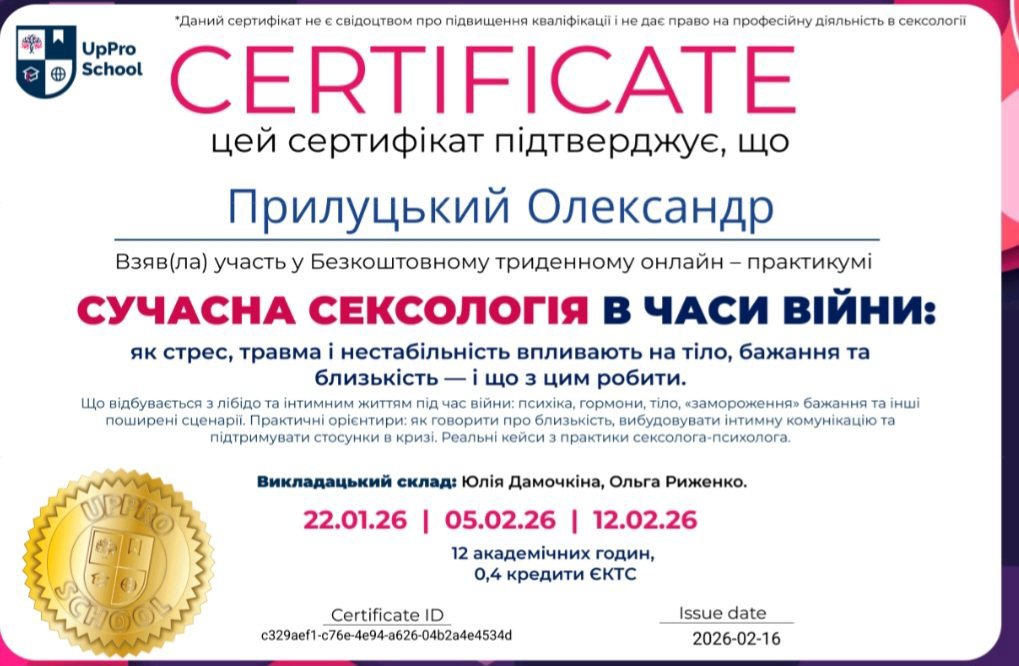 Сертификат Украинской ассоциации специалистов по преодолению последствий психотравмирующих событий