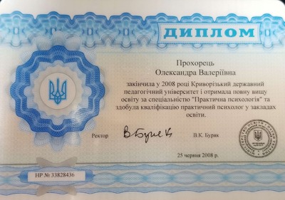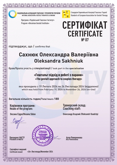 Сертифицирован как парный терапевт и семейный. НАГТУ (национальная ассоциация гештальт терапевтов Украины. Сертифицирована как телесно-ориентированный психотерапевт. Сертифицирована как гештальт терапевт.