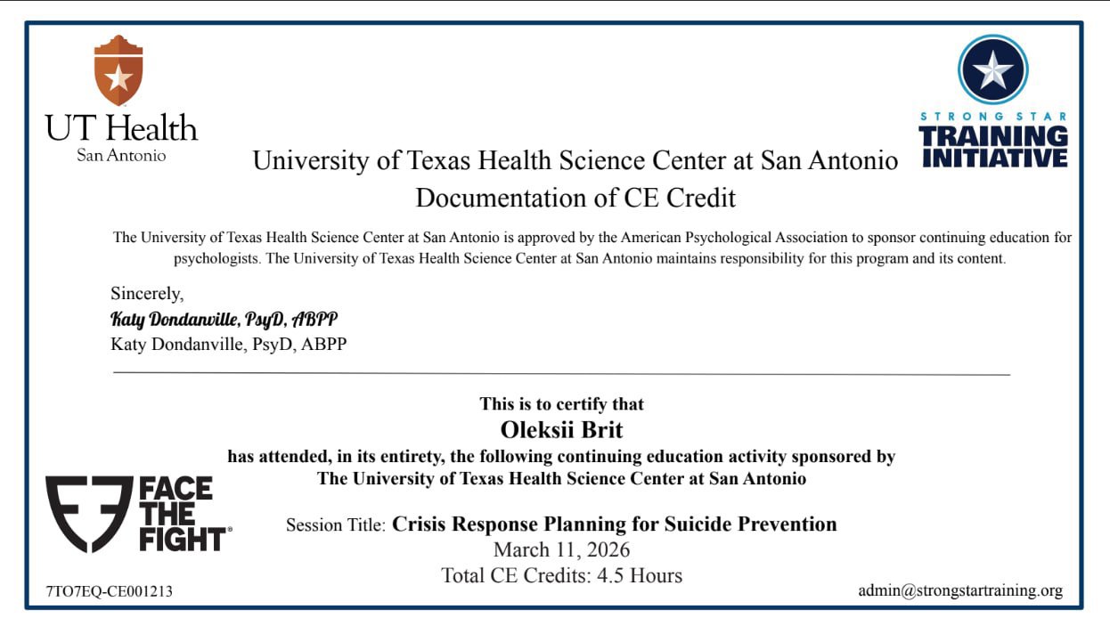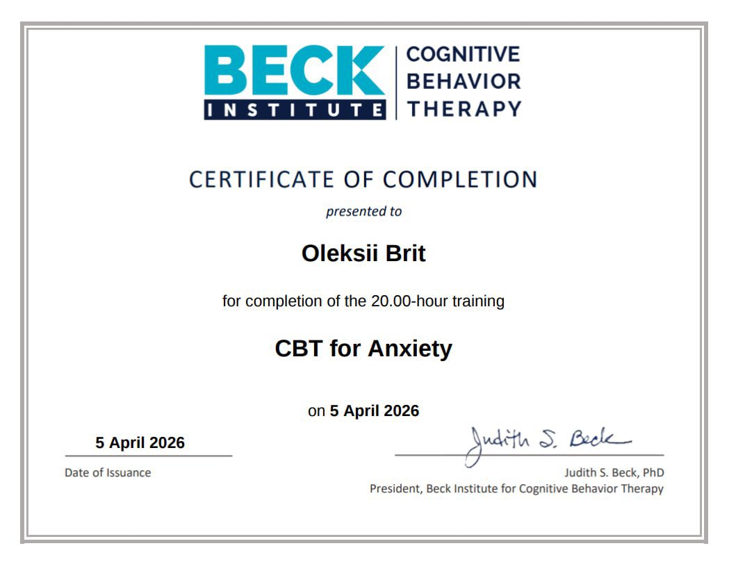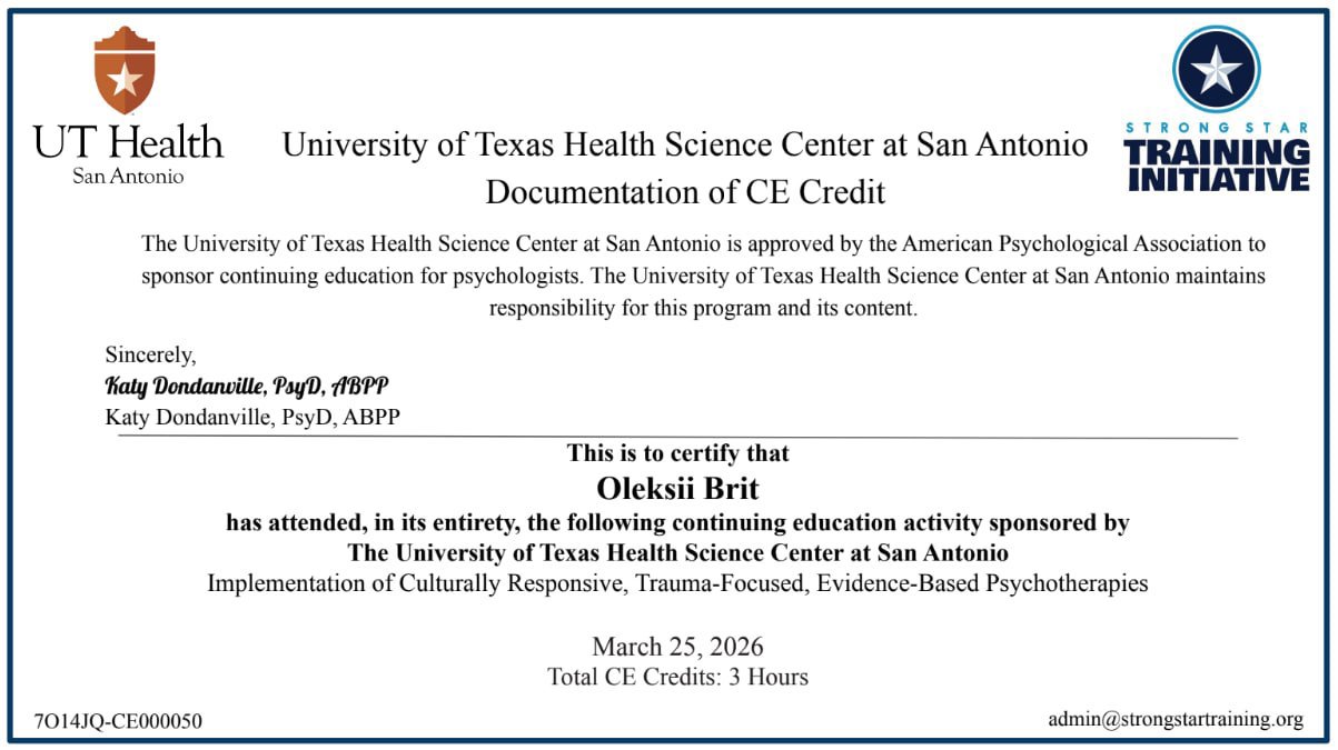 По своему второму образованию я преподаватель английского языка с большим опытом работы. Это дало мне возможность продолжить обучение в ведущих американских центрах подготовки специалистов по доказательным методам психотерапии – Когнитивно-поведенческой терапии (КПТ) и Когнитивно-процессуальной терапии – ее краткосрочным вариантом разработанным специально для работы с травмой и ПТСР.