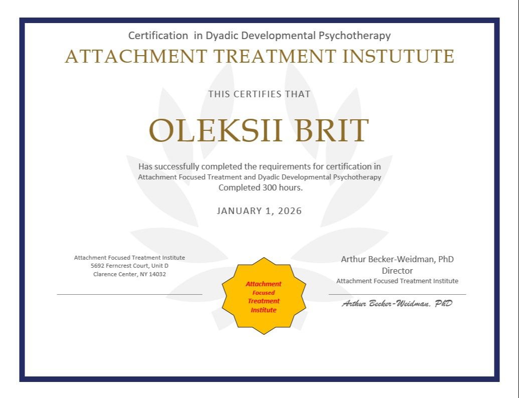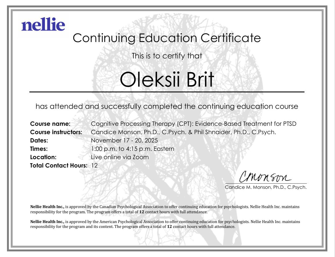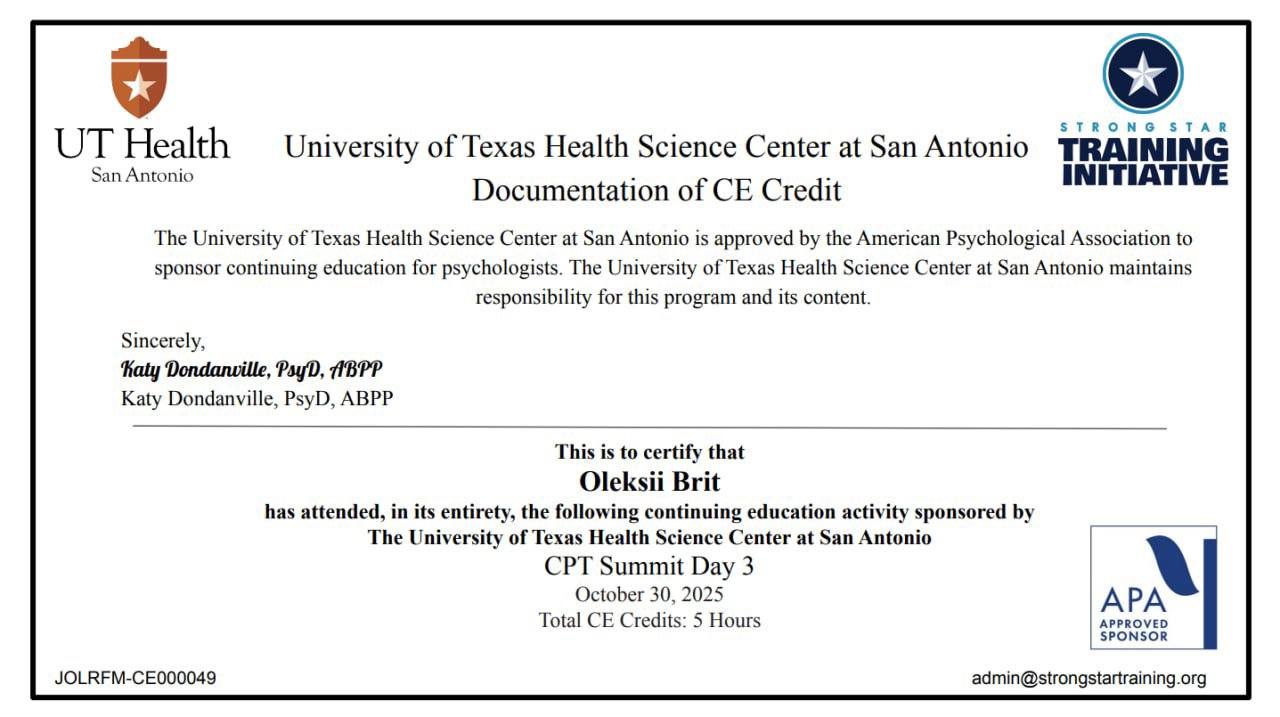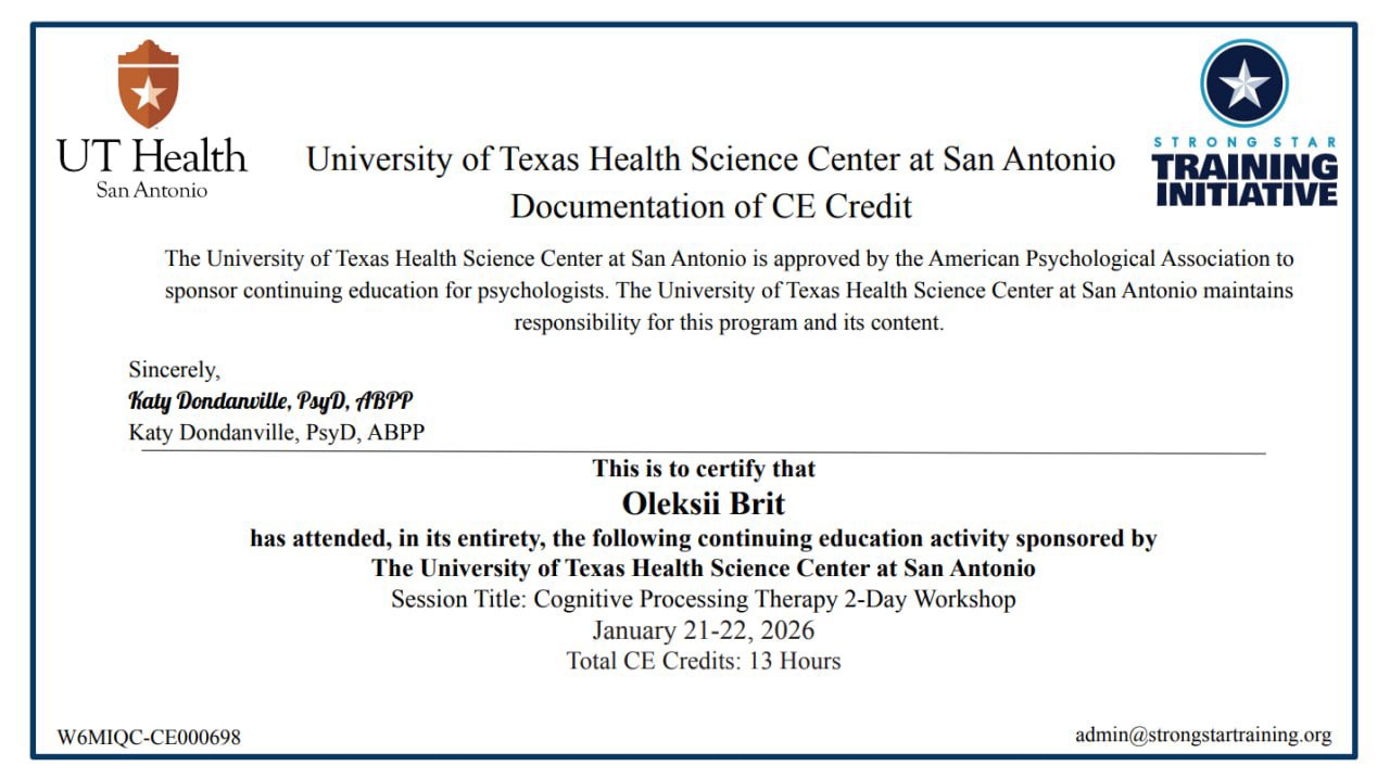 С 2025 года: учусь Когнитивно-процессуальной терапии (вариант КПТ для ПТСР) в STRONG STAR Training Initiative — одном из ведущих американских центров подготовки специалистов по доказательным методам лечения ПТСР.