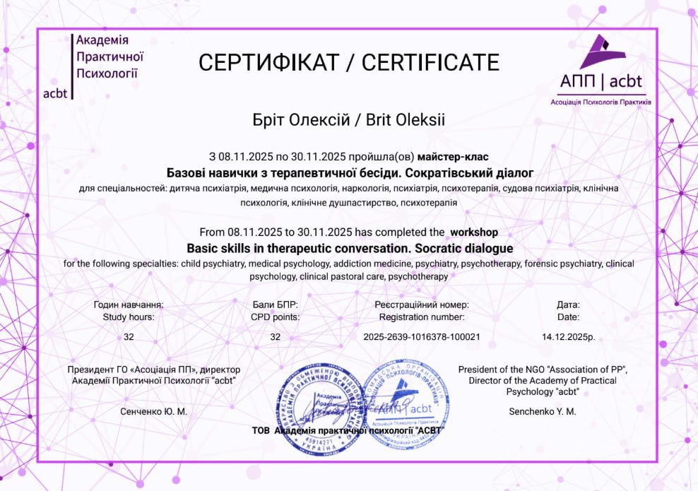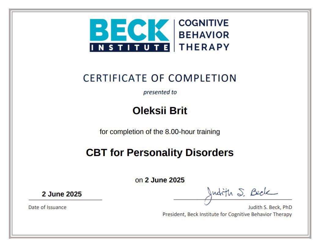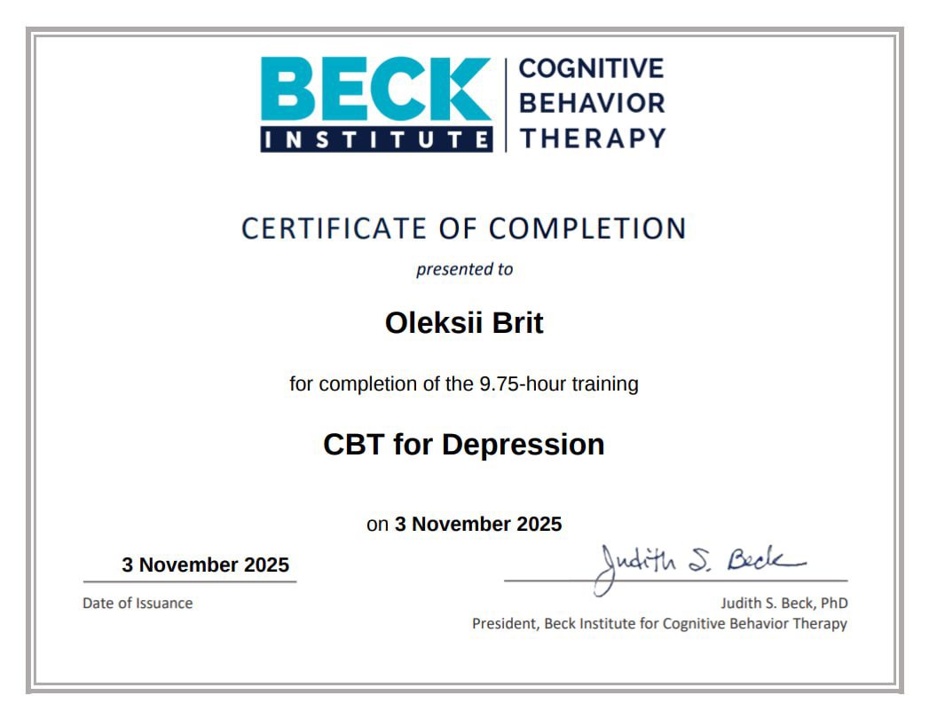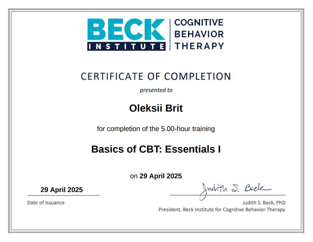 С 2025 года: учусь Когнитивно-процессуальной терапии (вариант КПТ для ПТСР) в STRONG STAR Training Initiative — одном из ведущих американских центров подготовки специалистов по доказательным методам лечения ПТСР.