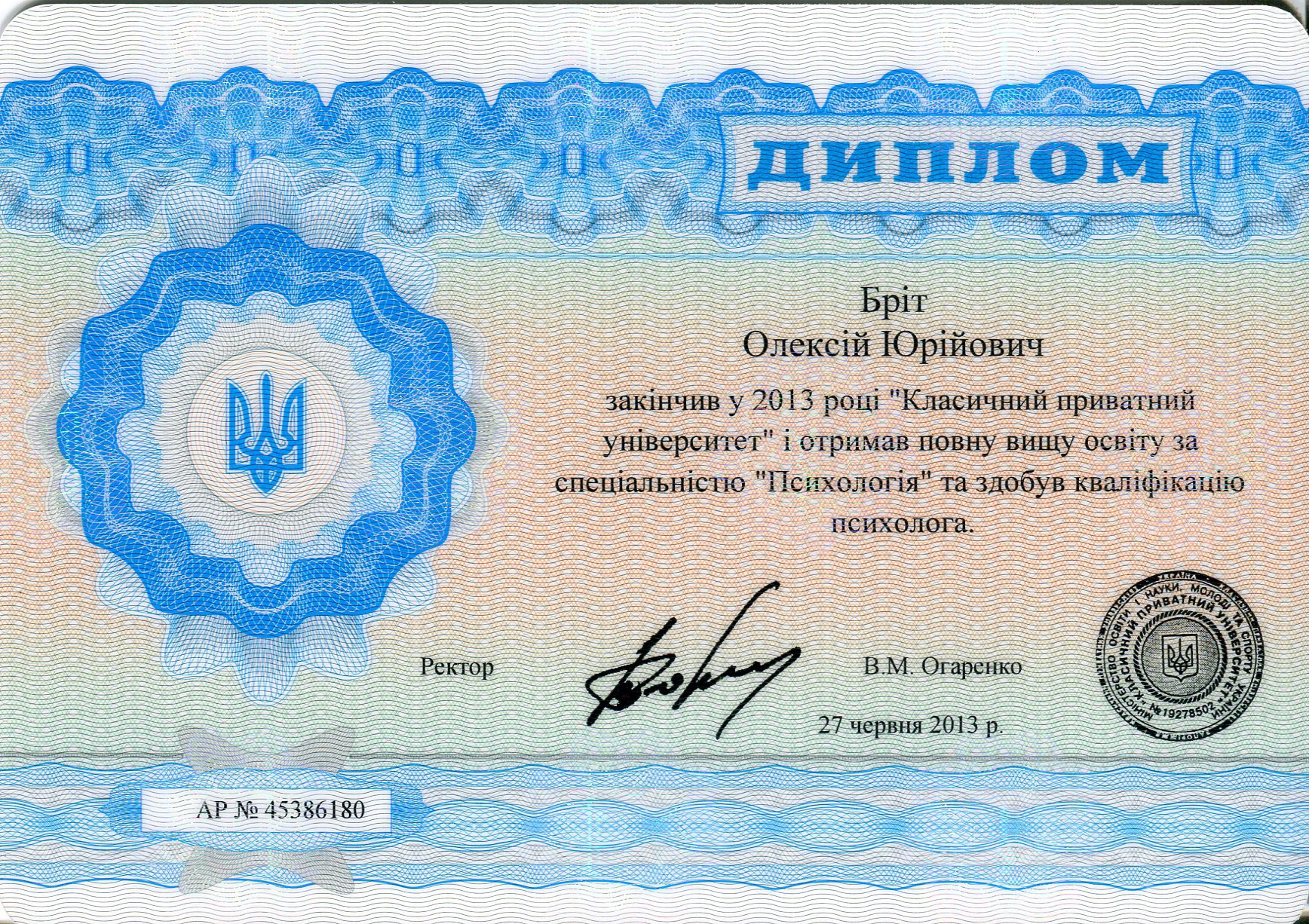 2013 год: Классический частный университет. Факультет психологии. Степень специалиста.