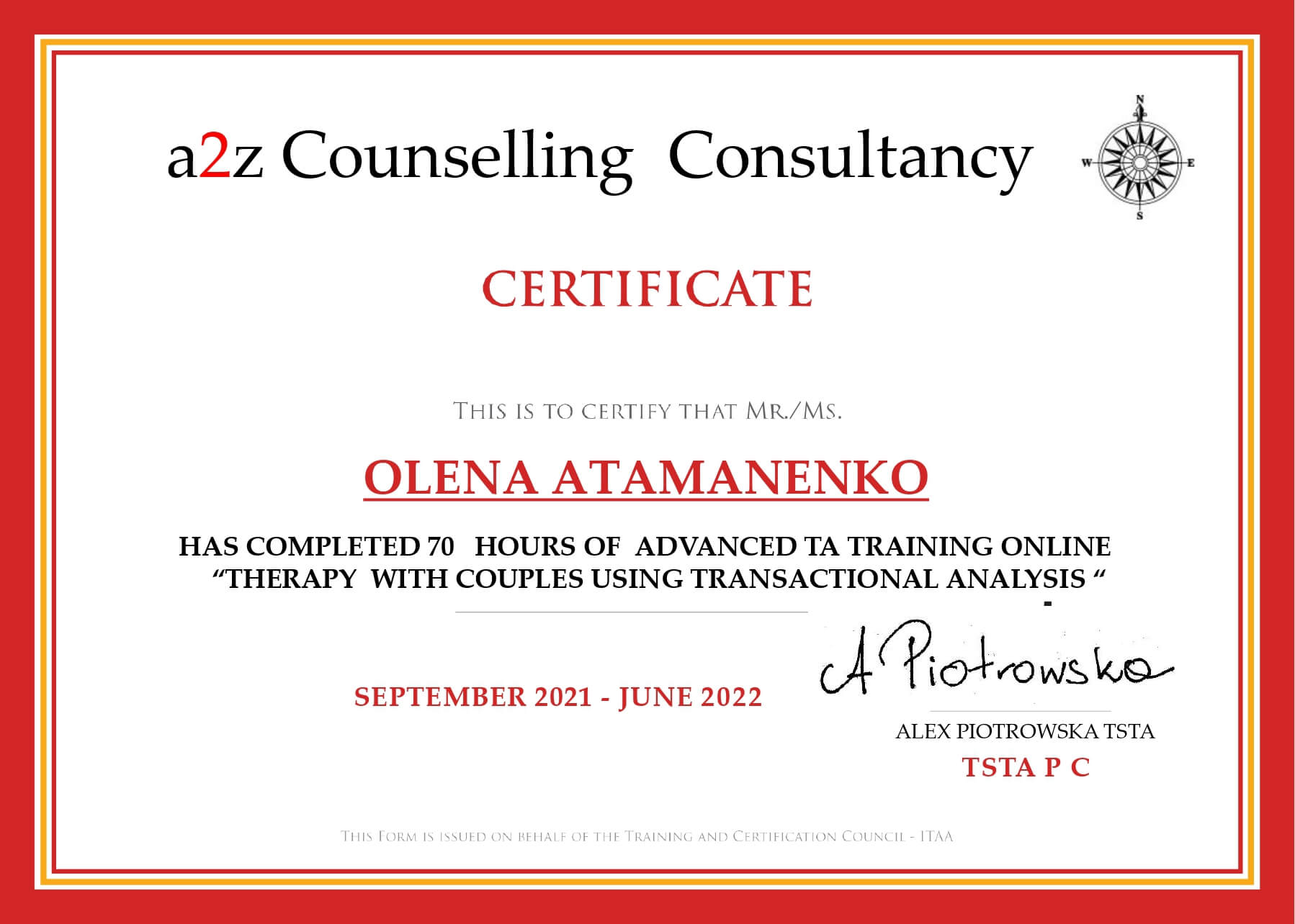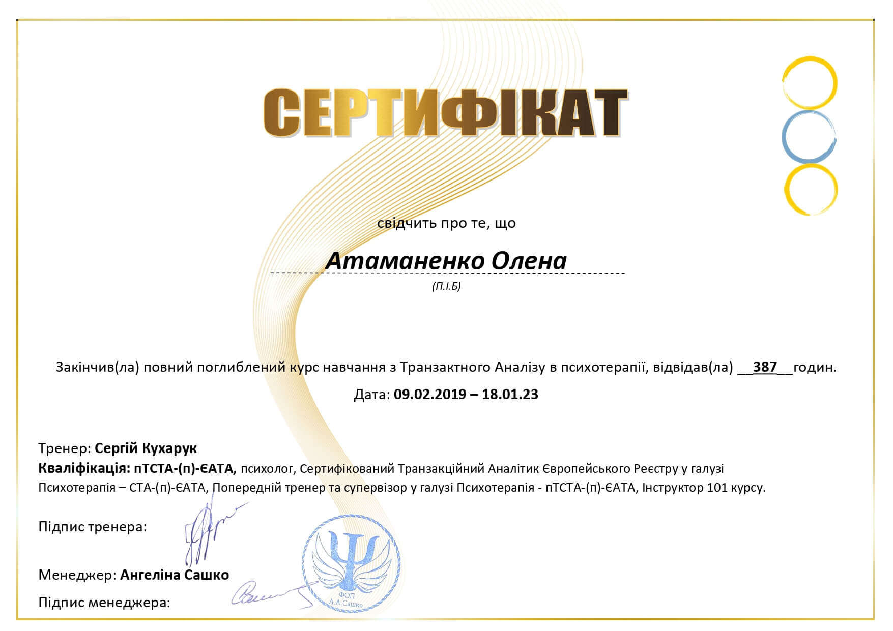 Привет, меня зовут Елена, я практикующий психолог, работаю в методе Транзактный анализ, магистр психологии, специалист по работе с метафорическими ассоциативными картами. Член УСТА (Українскої спільноти транзакційного аналізу) и EATA (European Association for Transactional Analysis).