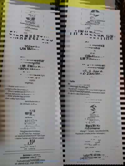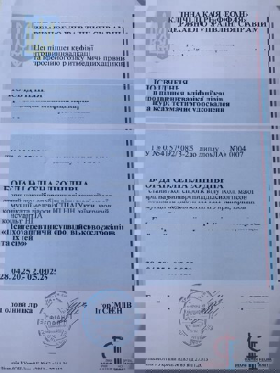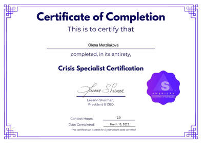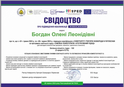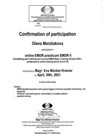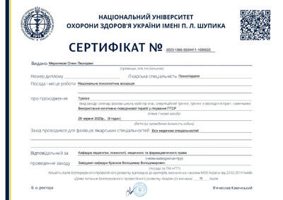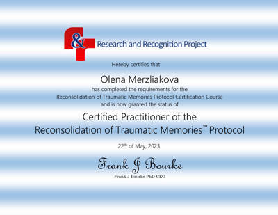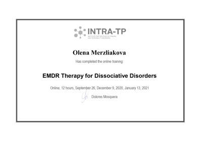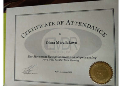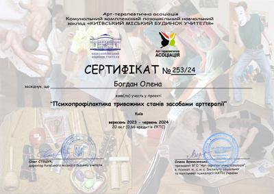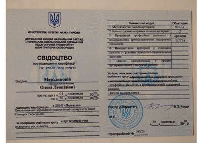 Арт-терапия (360 часов) Сертификат СП №154986; Арт-терапевтические оздоровительные технологии (90 часов). Свидетельство ТК 37.01.01 от 30.11.2020; EMDR1-2, Украина-Австрия, 2019-2021, 90 часов; Психосоматический подход к работе психолога, 90 часов, сертификат LAB20211228 от 30.08.2021; Первая психологическая помощь Сертификат ME128496 от 04.2022 г.; Психологическое сопровождение потери, 20 часов, 20-26.06.2020; Основы психологической травмы, 36 часов, ноябрь 2019 г., сопровождение лиц пострадавших от гендерного насилия (24 часа, декабрь 2022), Педагогика чрезвычайных состояний, травмопедагогика и арт-терапия (42 ч, июль 2023), PTM (рекон , май 2023)