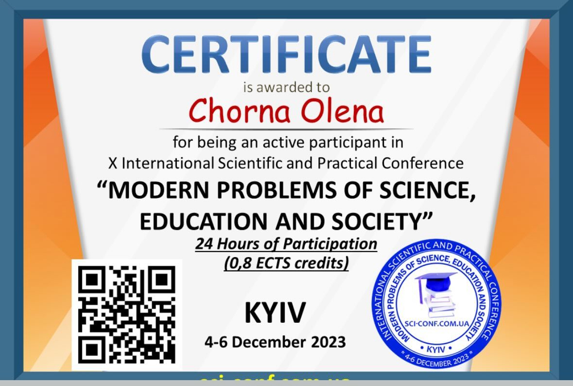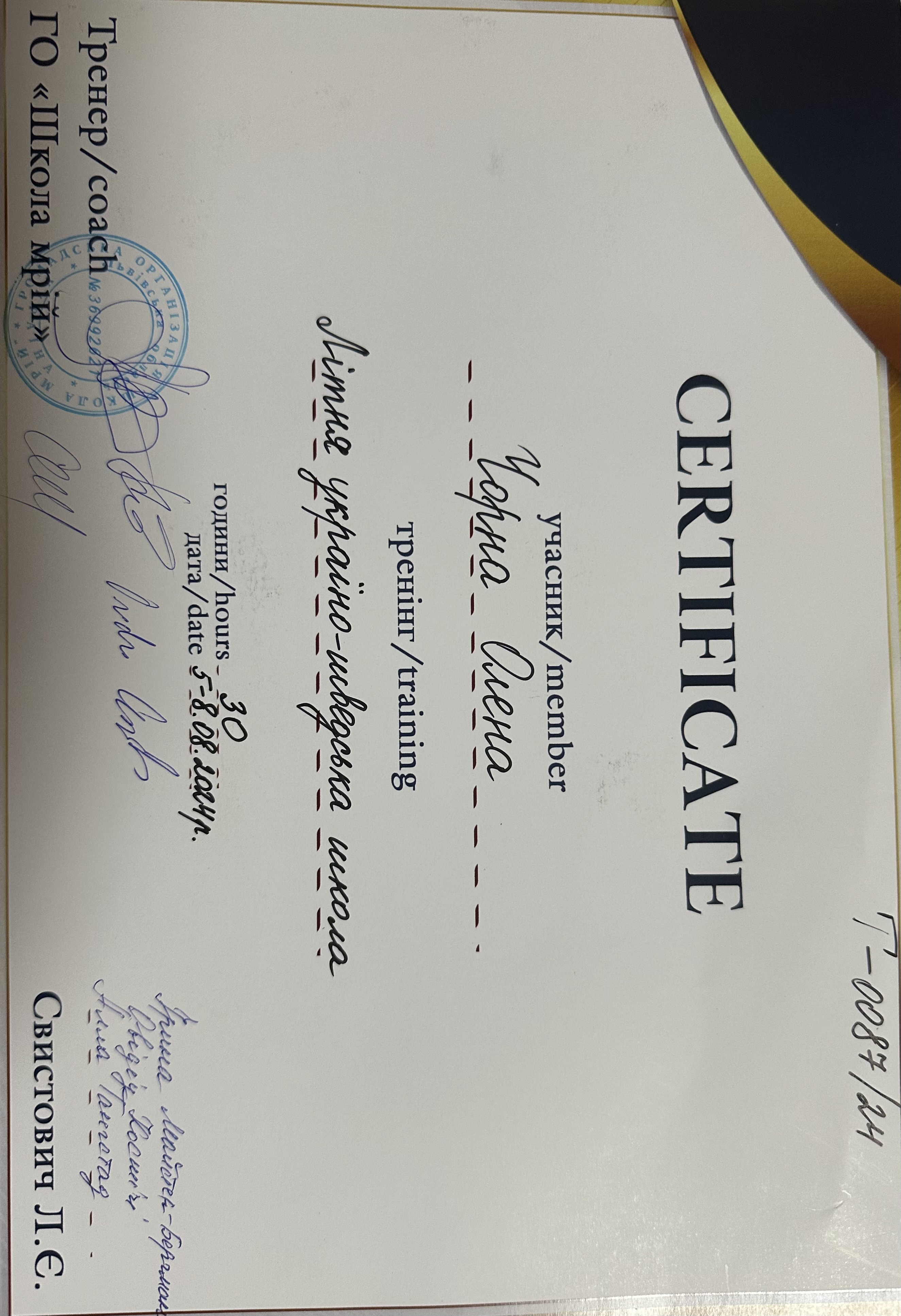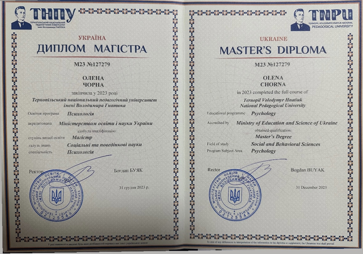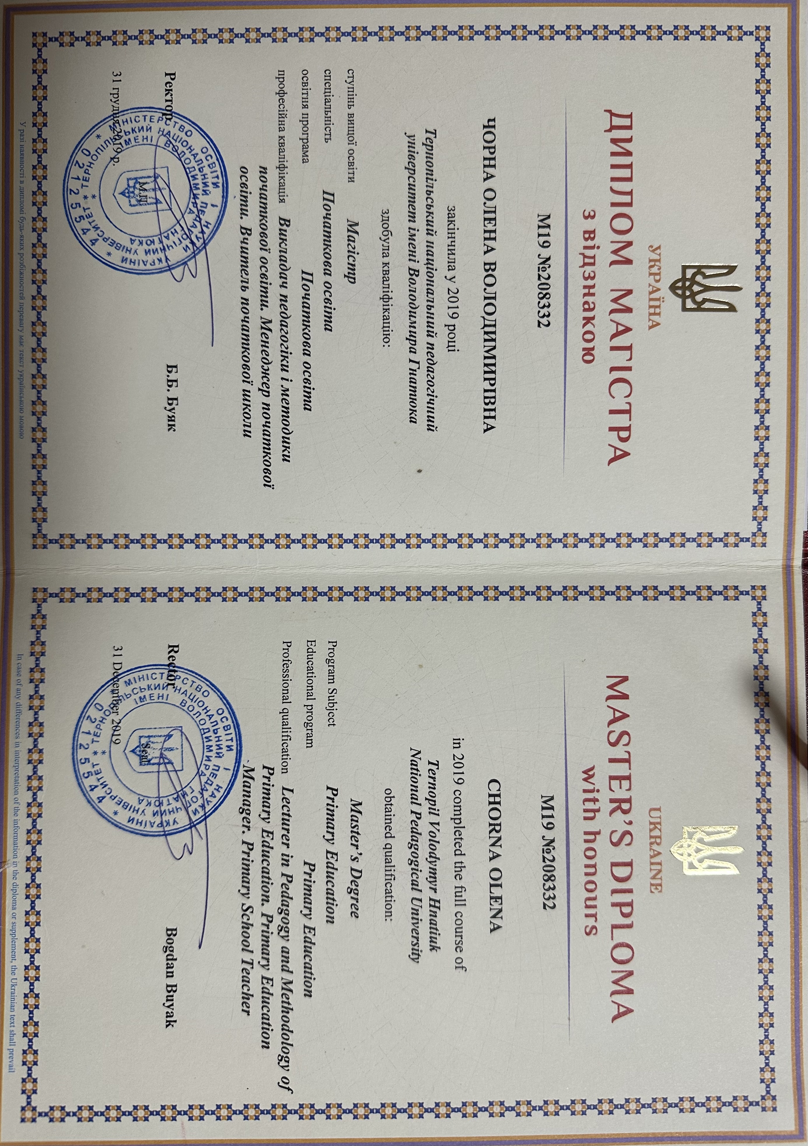 Окончила магистратуру ТНПУ, также пройдена масса курсов, а именно: