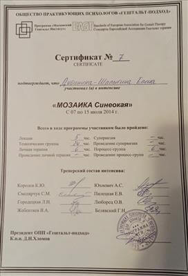 Как специалист: я - гештальт-терапевт, в работе использую арттерапевтические методы, телесно-ориентированные методы терапии, все зависит от запроса и проблемы человека. Эмпатичная, внимательная, тактичная, принимающая, поддерживающая, если нужно. Стаж работы 5 лет. Работаю со взрослыми. С родительскими запросами, с проблемами в отношениях в семье, с противоположным полом, с отношениями с повзрослевшими детьми, с состарившимися родителями.
