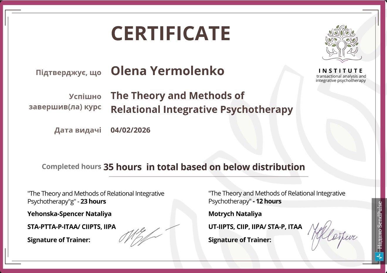 - Национальный Педагогический Университет им. М.П. Драгоманова. Университет классической и современной психологии, психотерапии и коучинга. Квалификация: