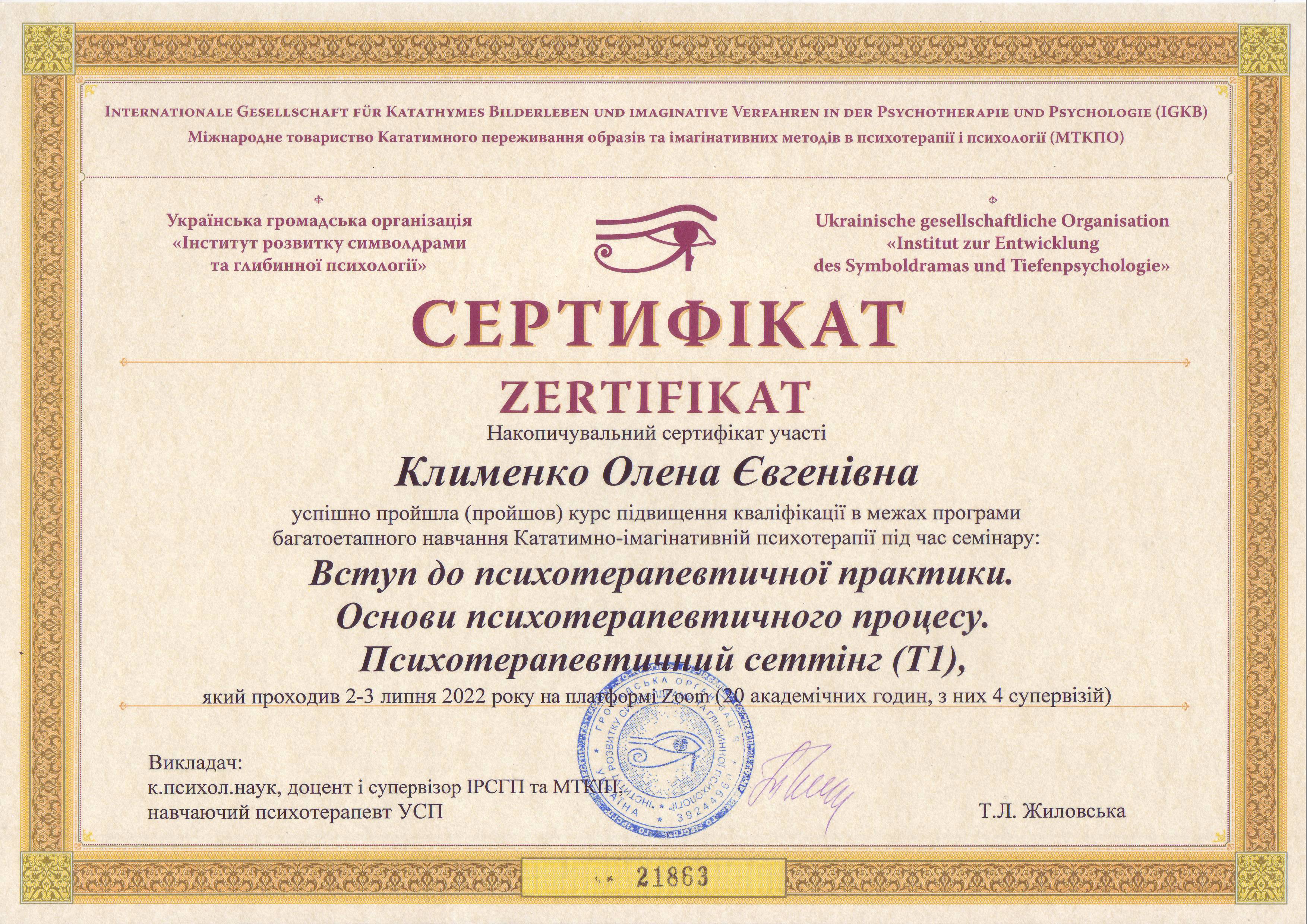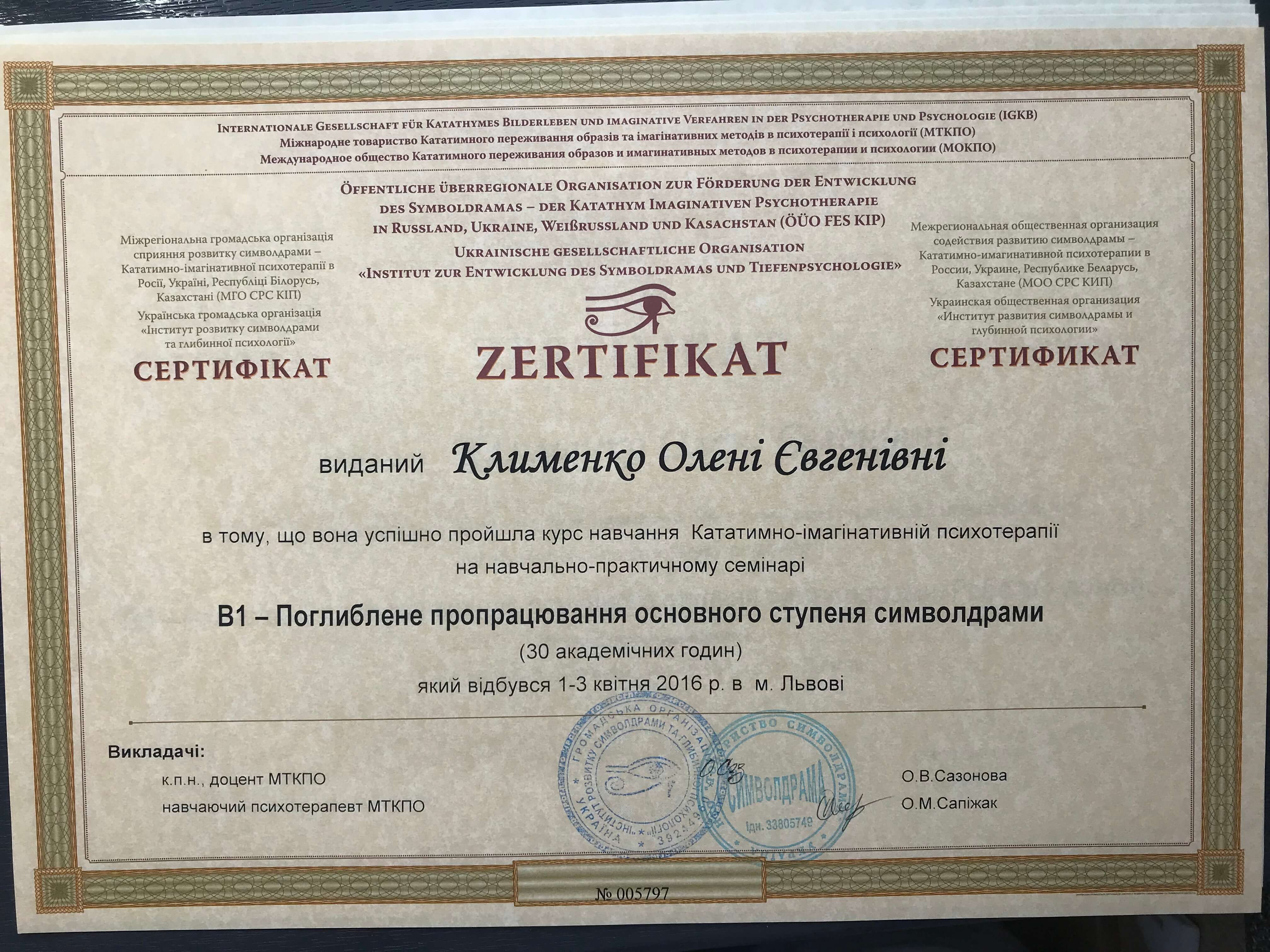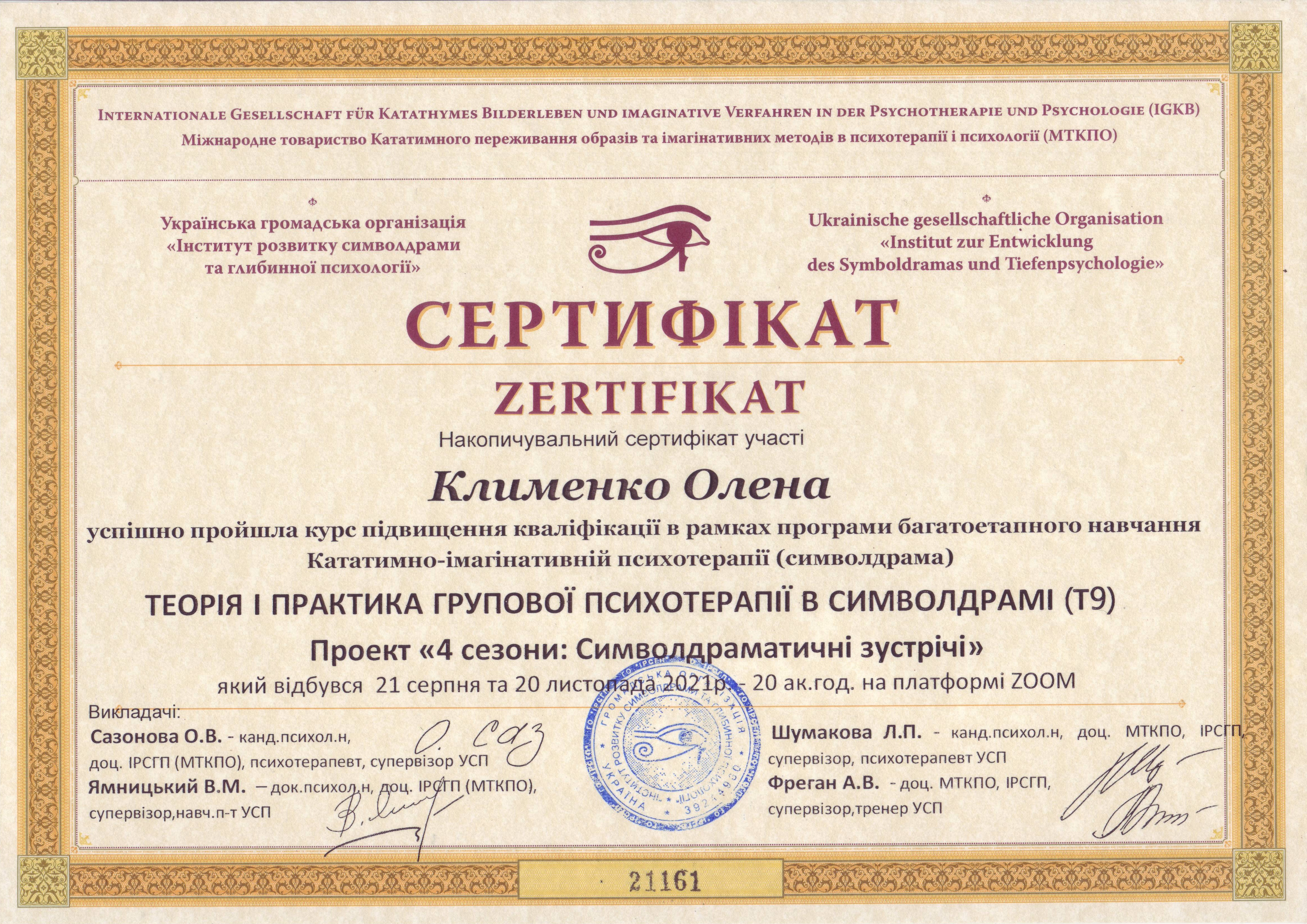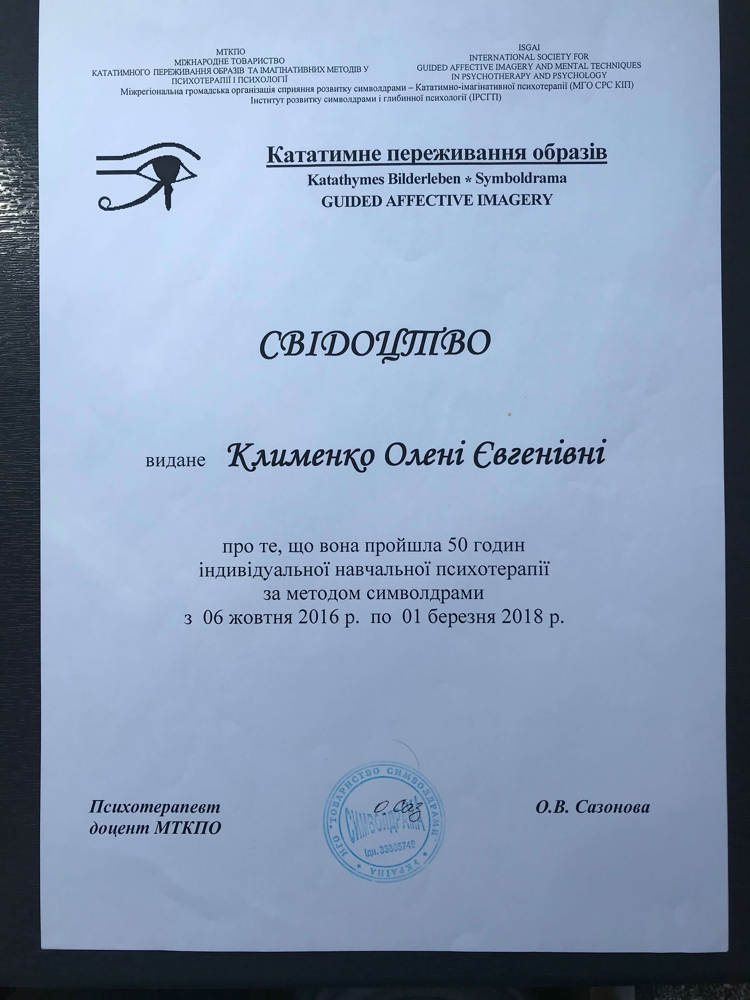 Сетрифицировалась как психотерапевт в ГО Институт развития символдрамы и глубинной психологии. Завершила курс