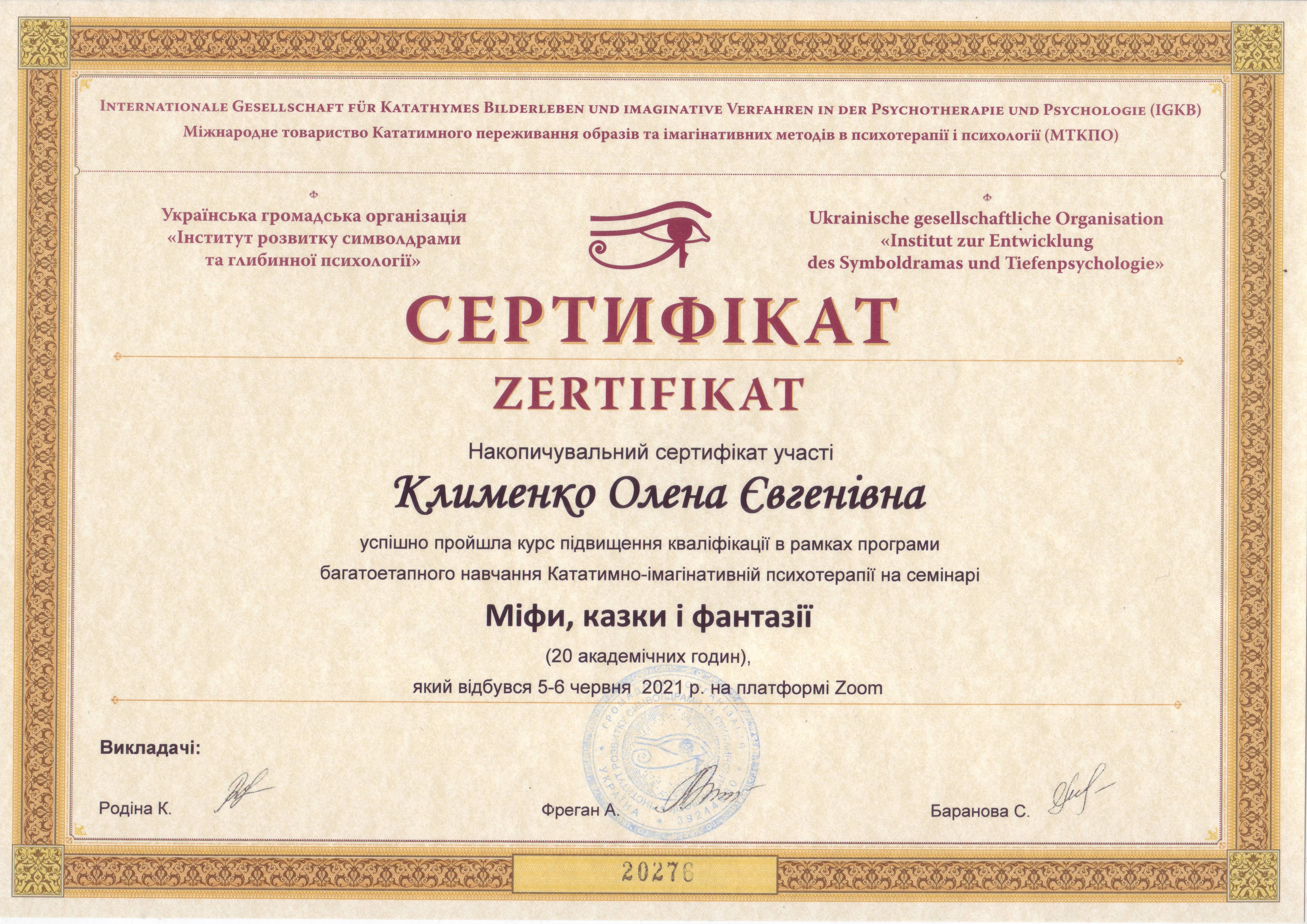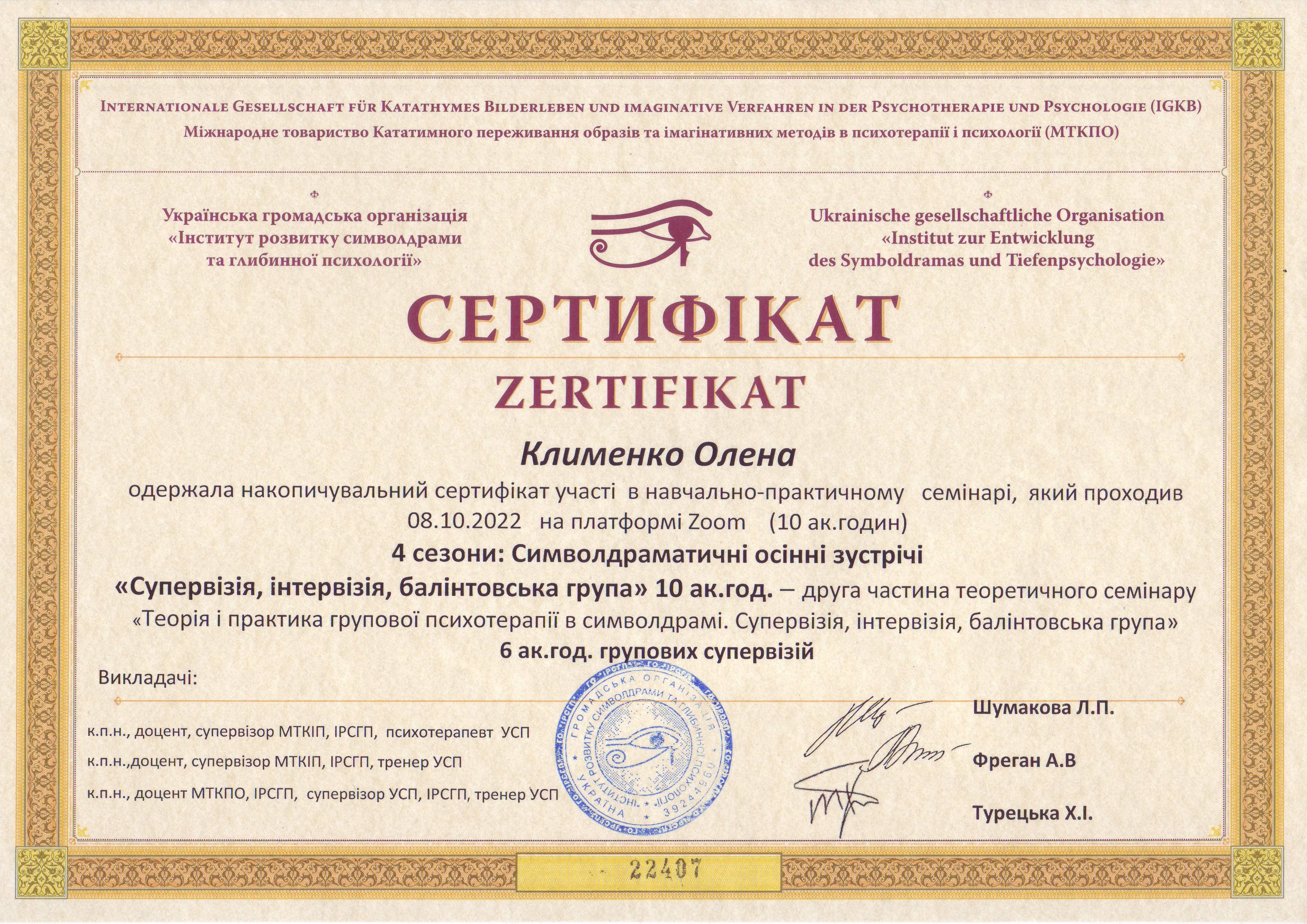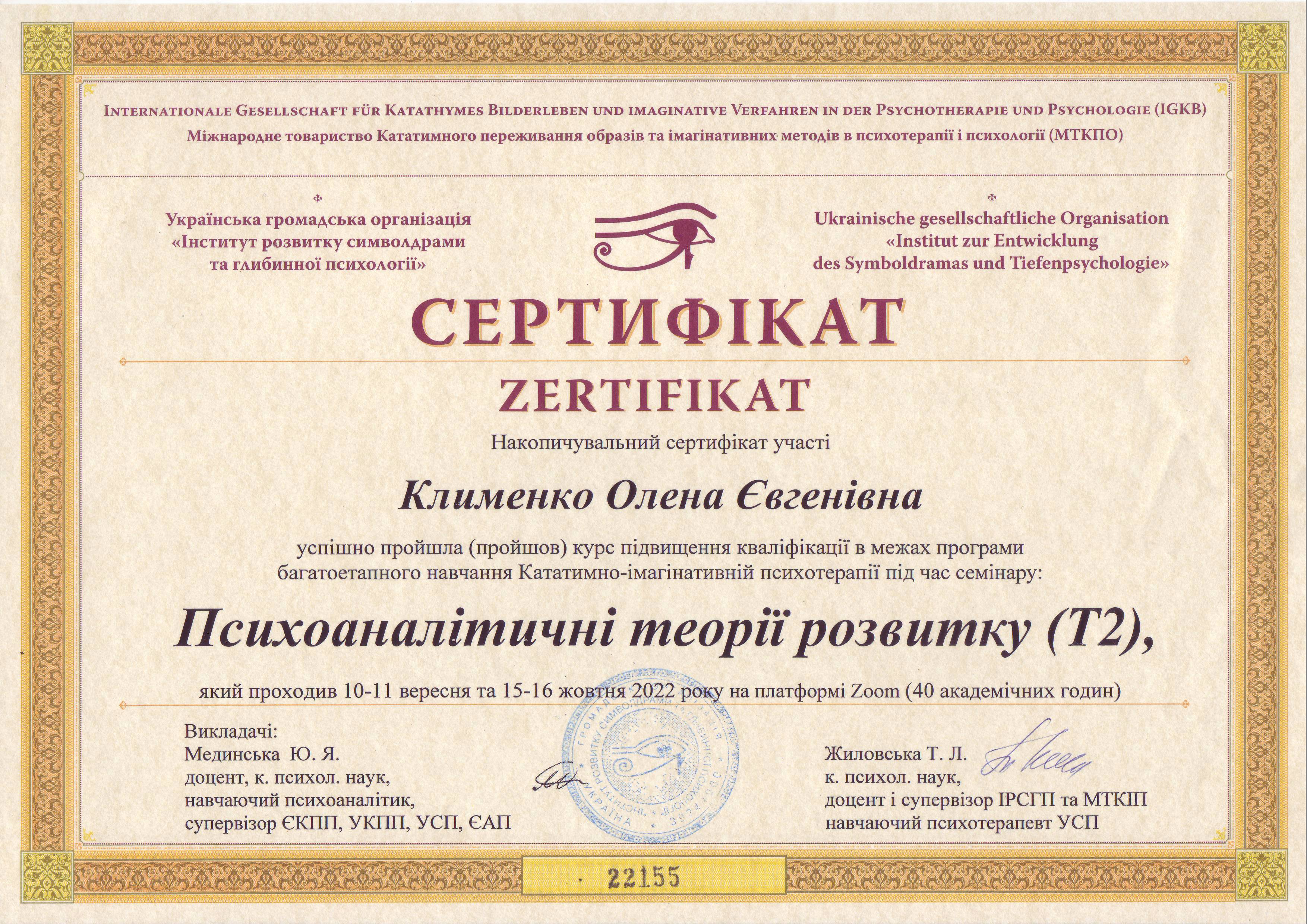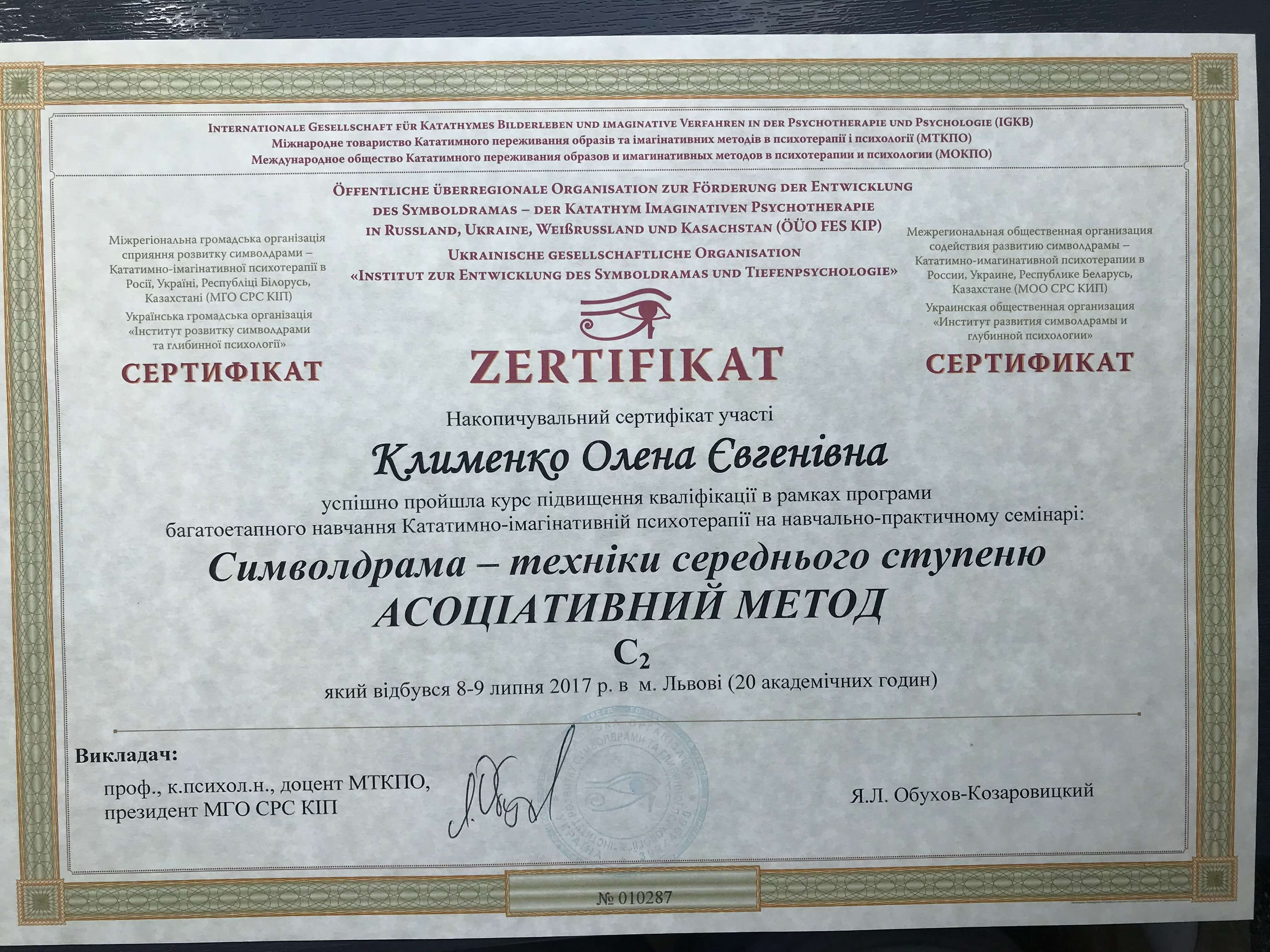 Сетрифицировалась как психотерапевт в ГО Институт развития символдрамы и глубинной психологии. Завершила курс