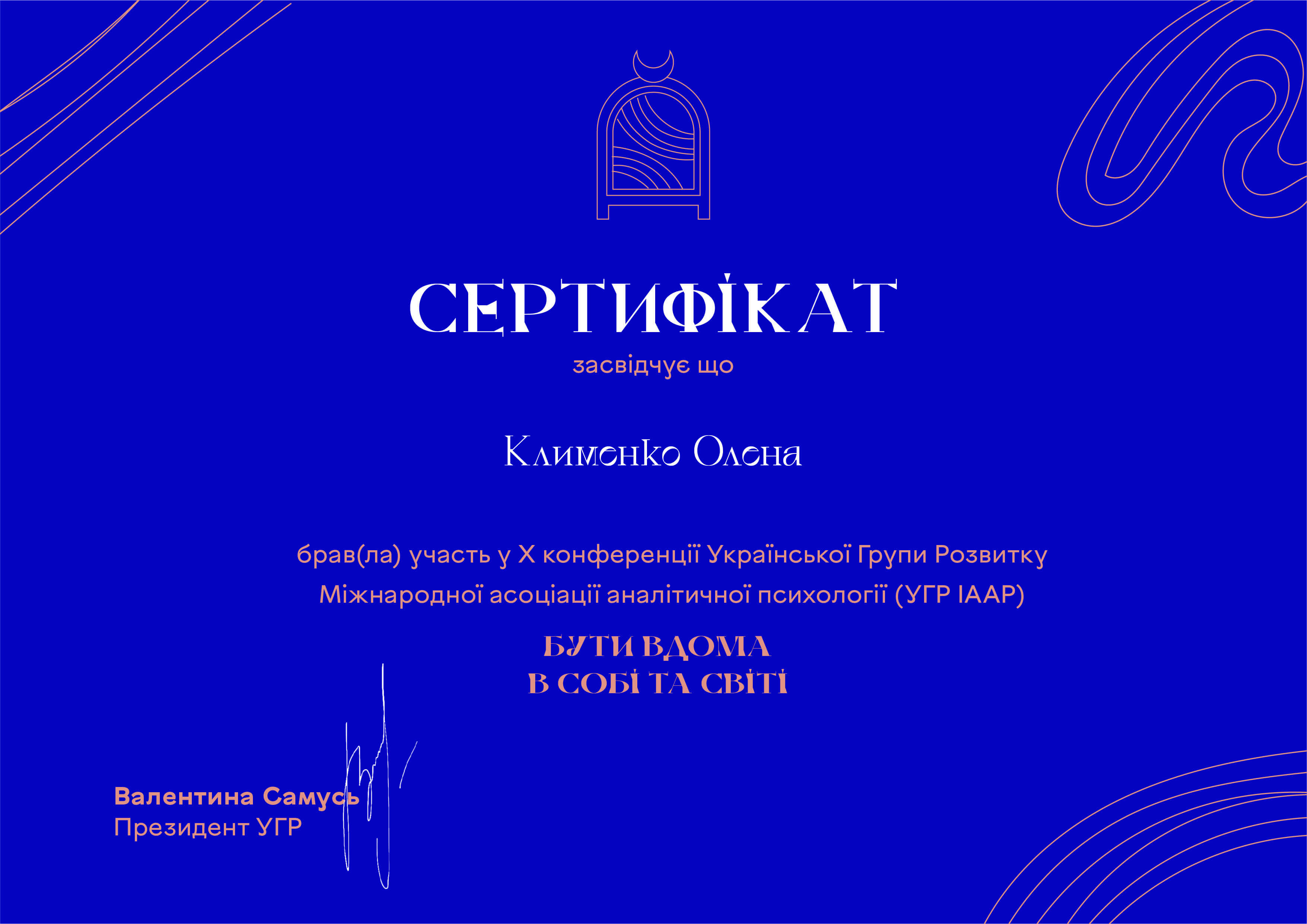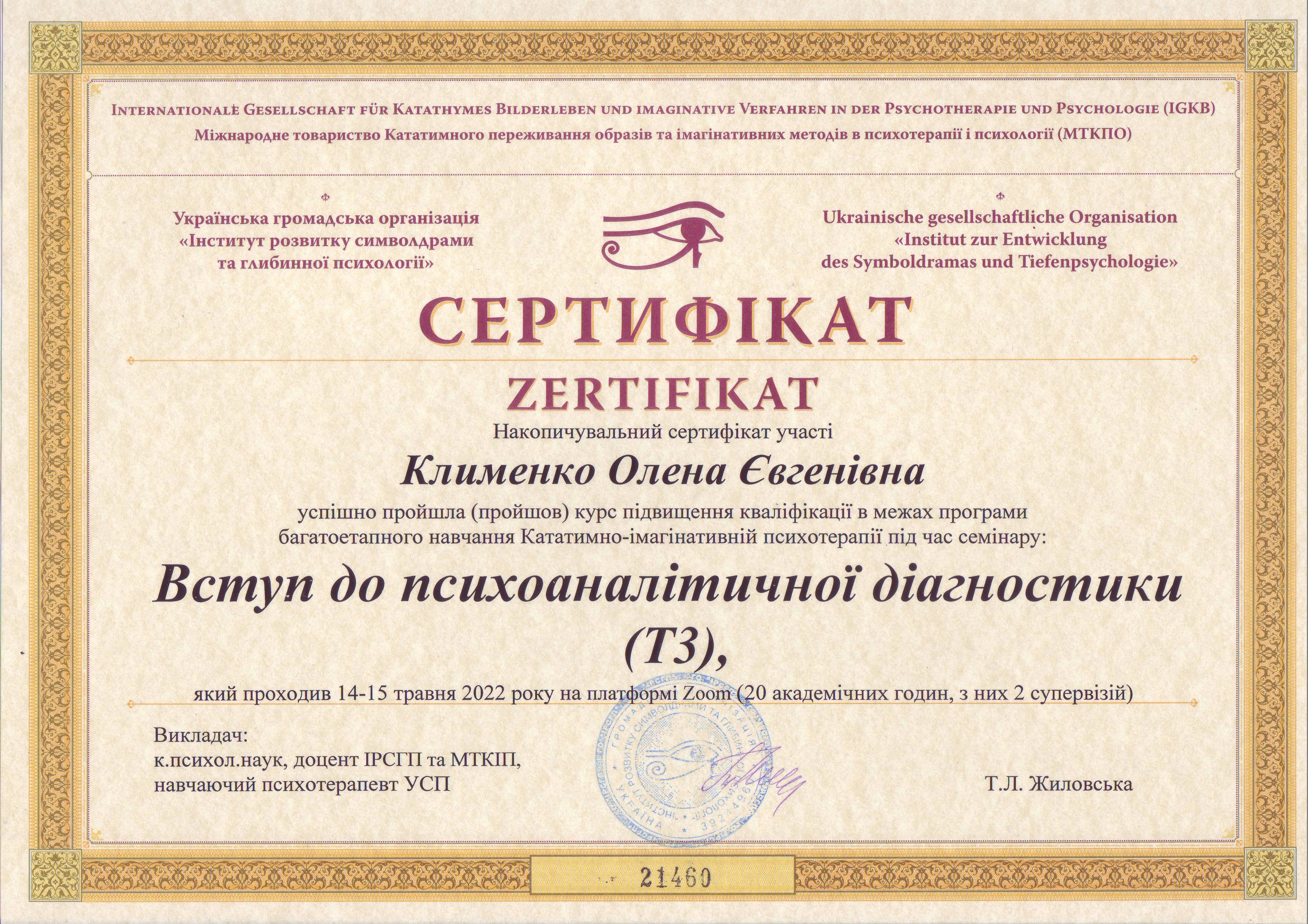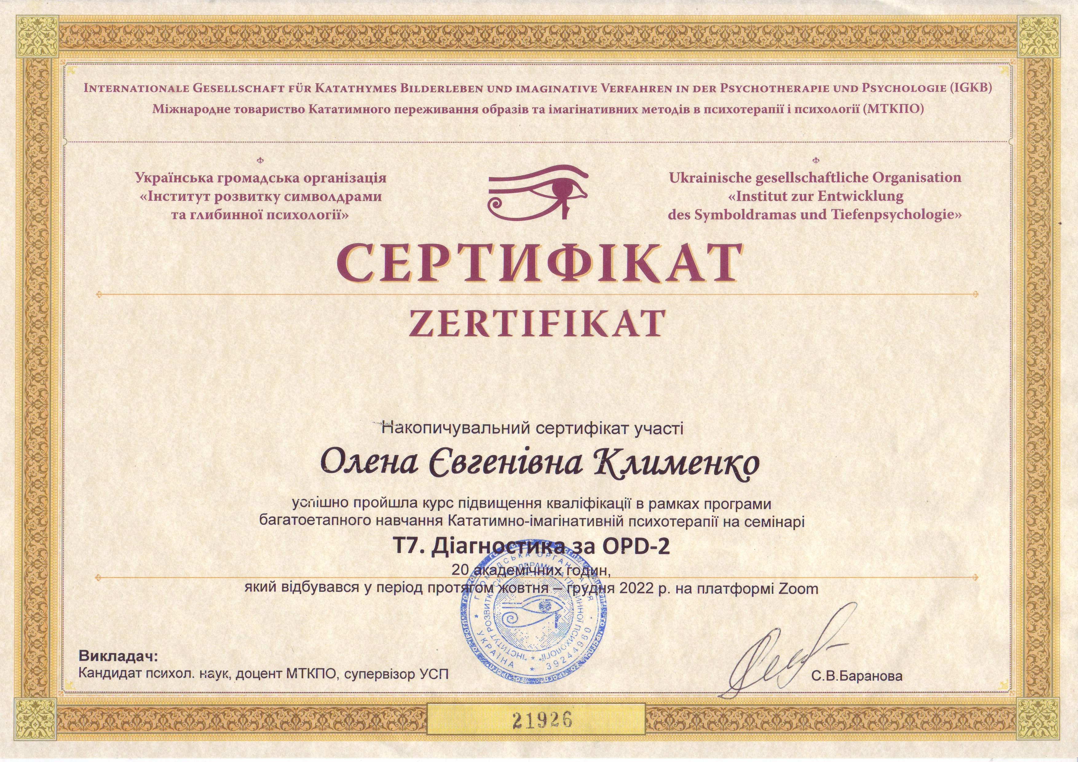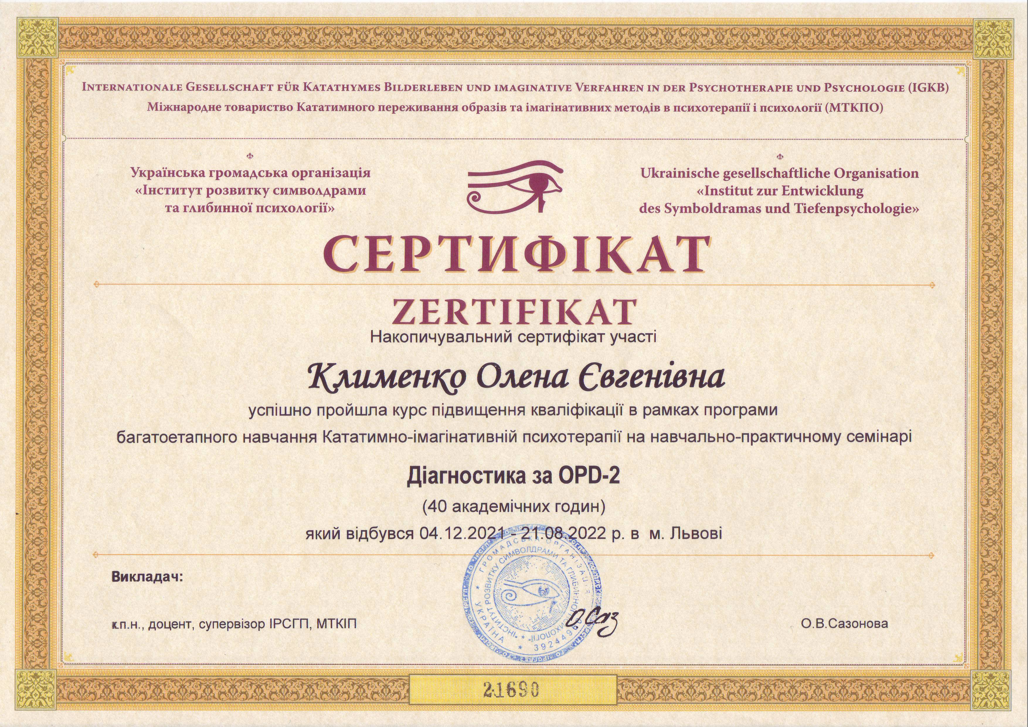 Сетрифицировалась как психотерапевт в ГО Институт развития символдрамы и глубинной психологии. Завершила курс