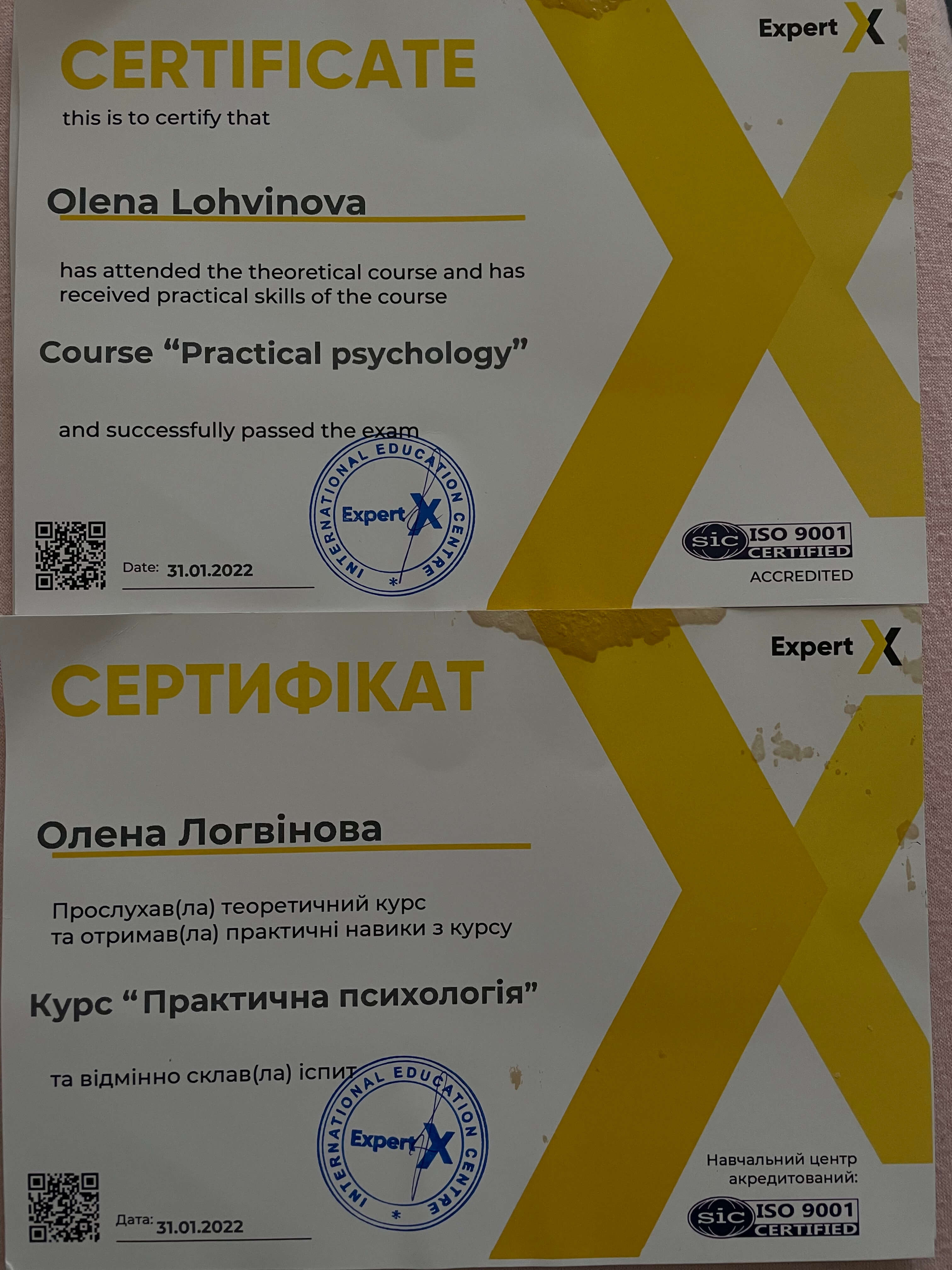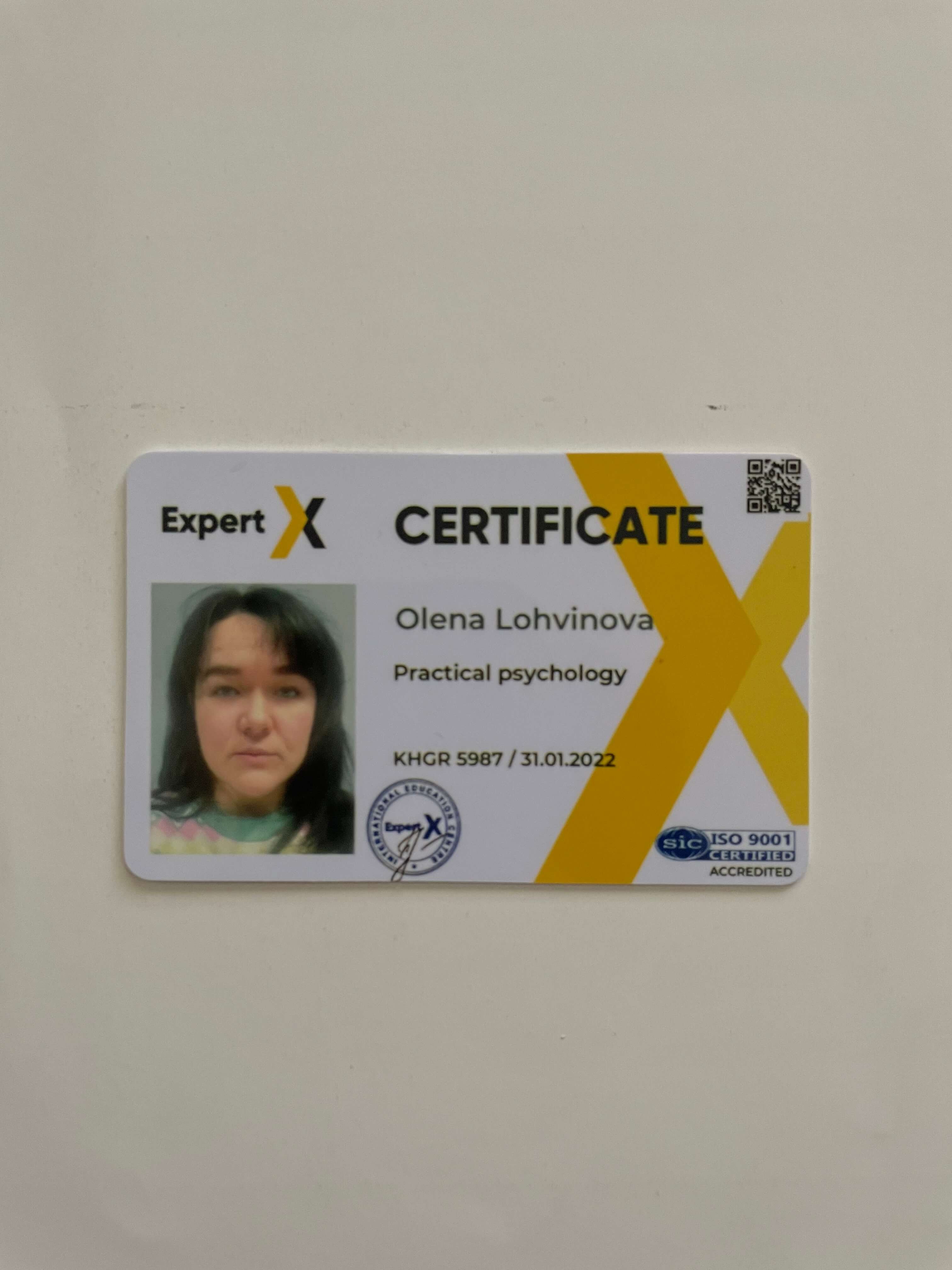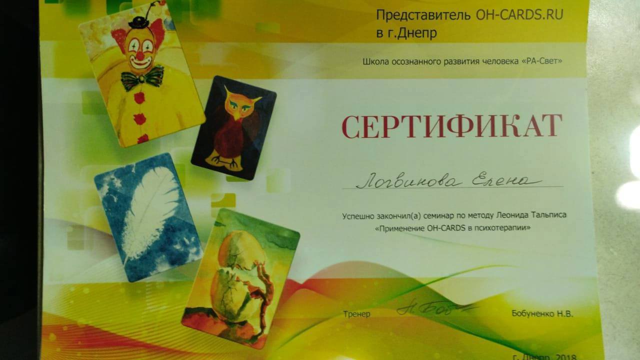 Я имею степень магистра психологии и диплом о высшем образовании. Также я окончила курс по работе с МАК, Арт-терапией. Имею сертификат практикующего псизолога от международной школы Expert. Успешно прошла курсы повышения квалификации в Польше.