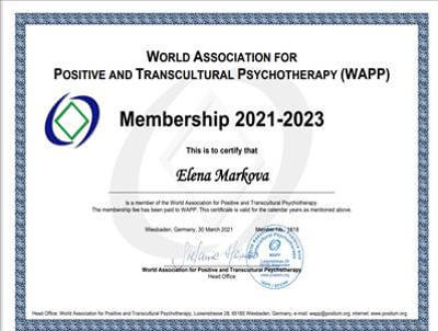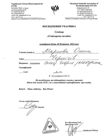 Член Украинского Союза психотерапевтов. Член Всемирной ассоциации Позитивной Психотерапии.