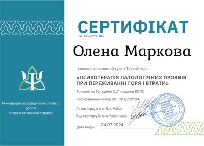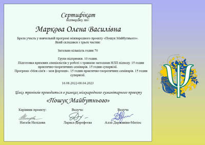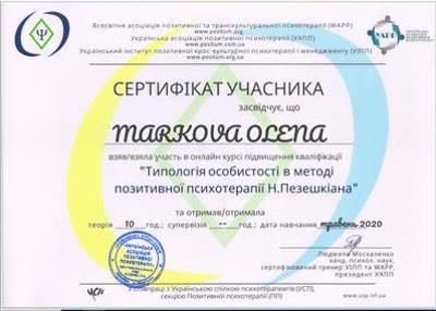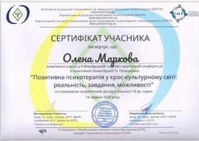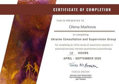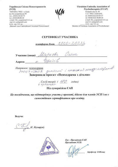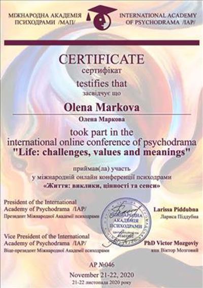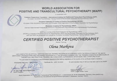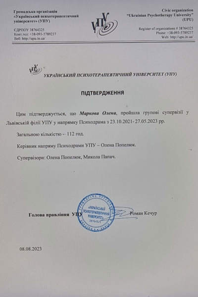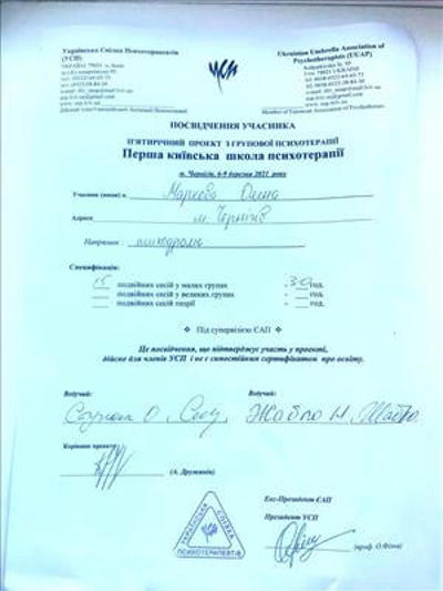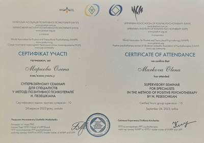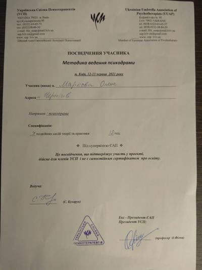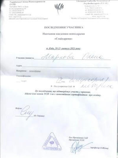 Два высших образования, продолжаю повышать свою квалификацию на мастер курсе в методе Позитивной Психотерапии Н. Пезешкиана и Украинском психотерапевтическом университете в методе Я. Морено.