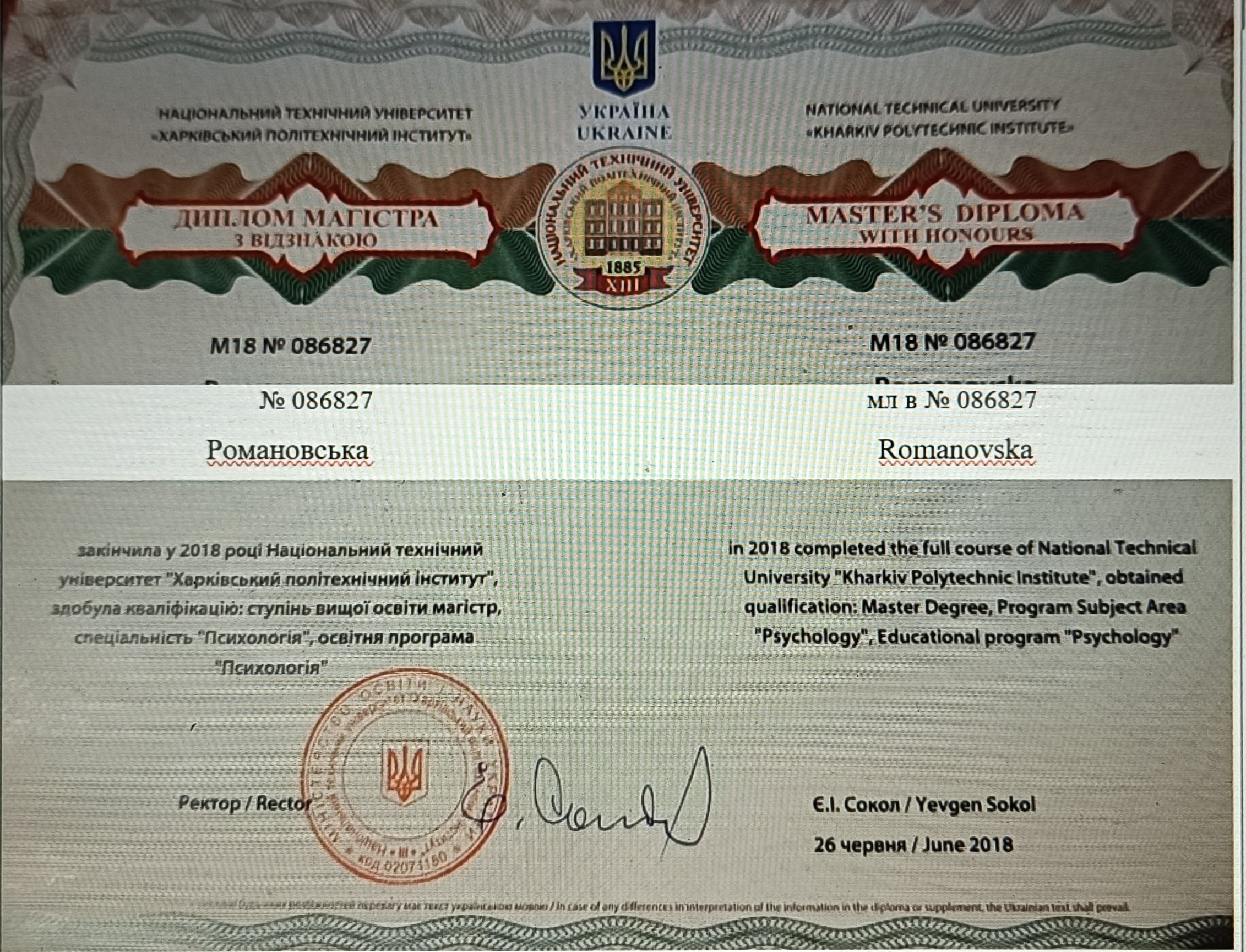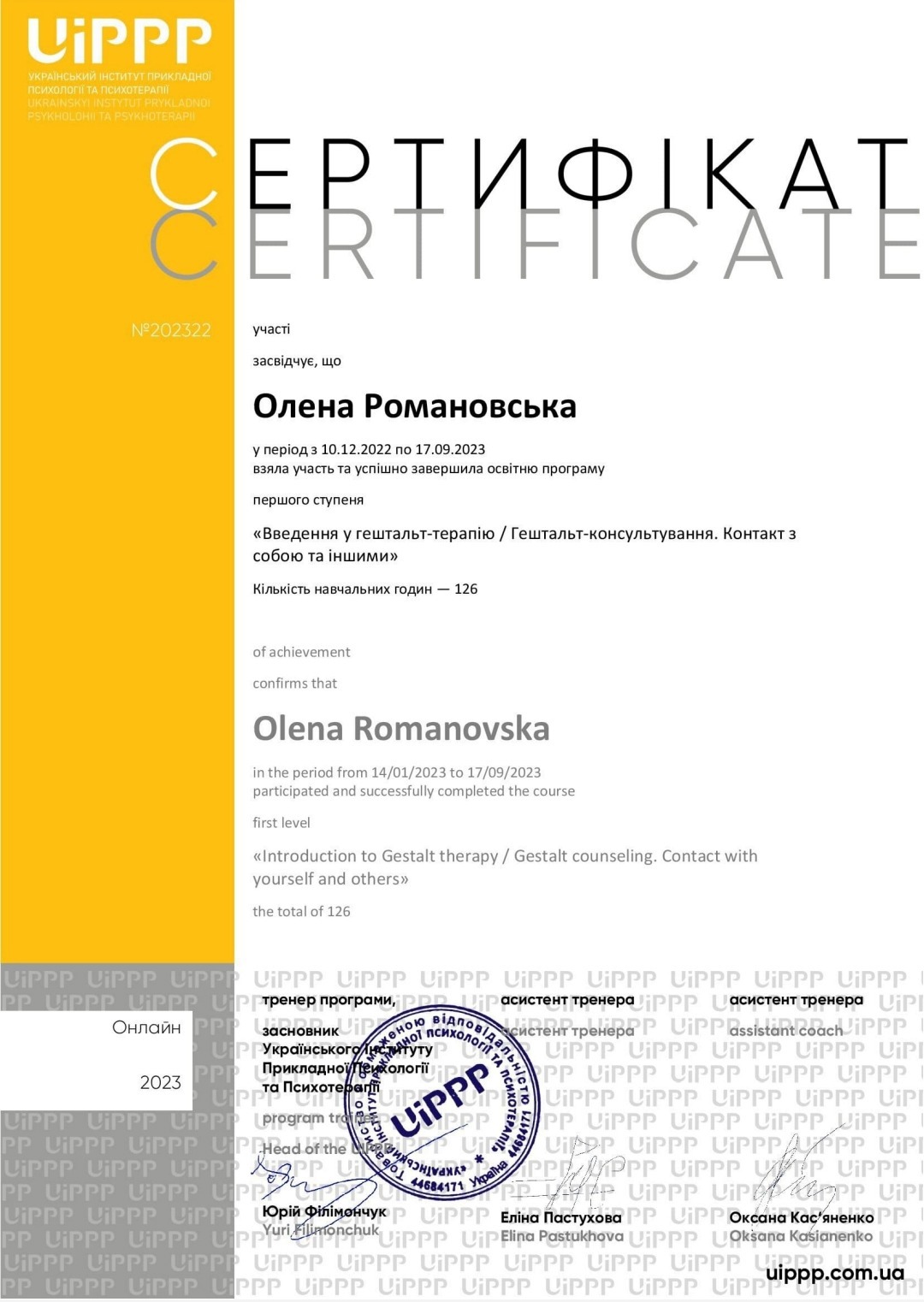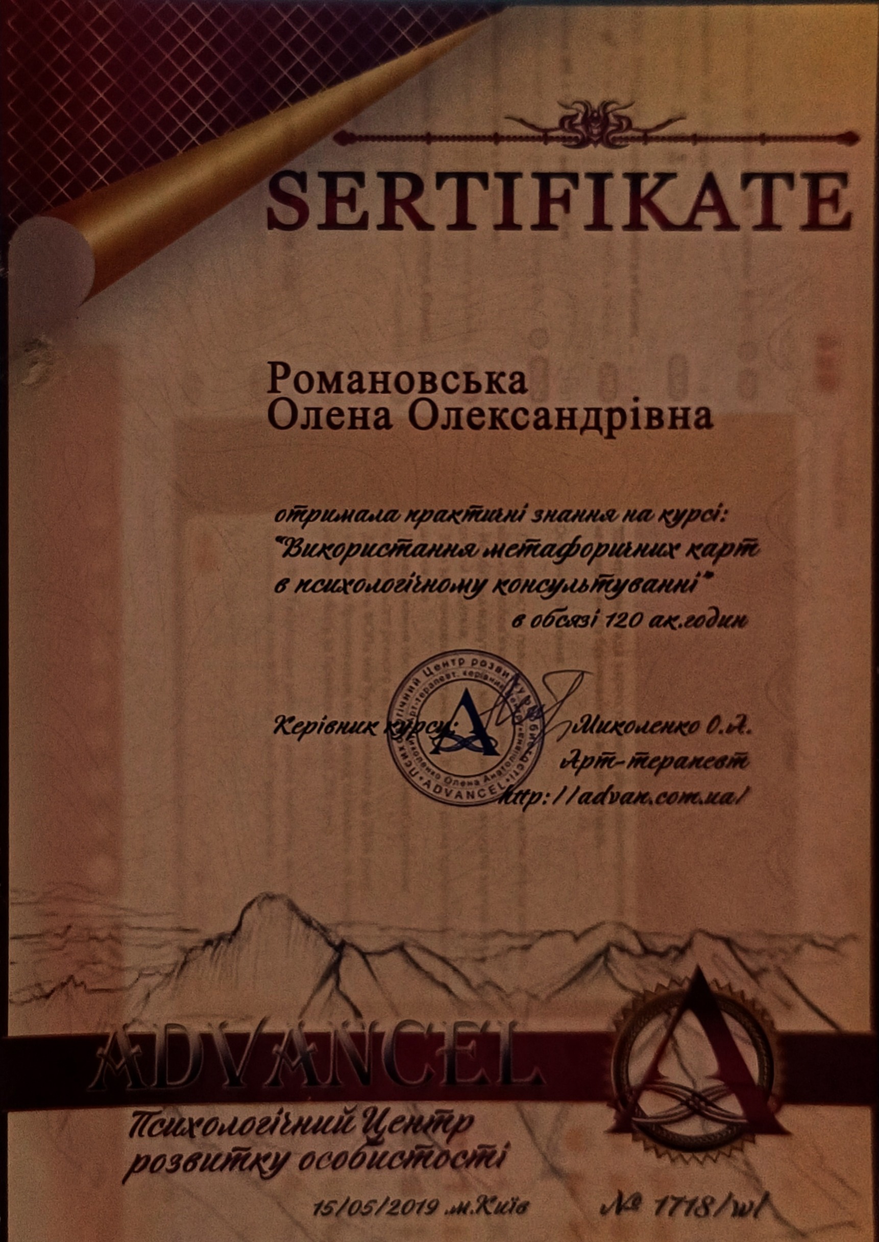 Украинский институт прикладной психологии и психотерапии- Гештальт, 1 ступень, Харьковский институт гештальта и психодрамы - Психологическое консультирование 1 год обучения, НТУ "ХПИ" - магистр психологии, психологический центр развития личности Адвансел-МАК, Восточноукраинская ассоциация арт терапии- Интеллект отношений