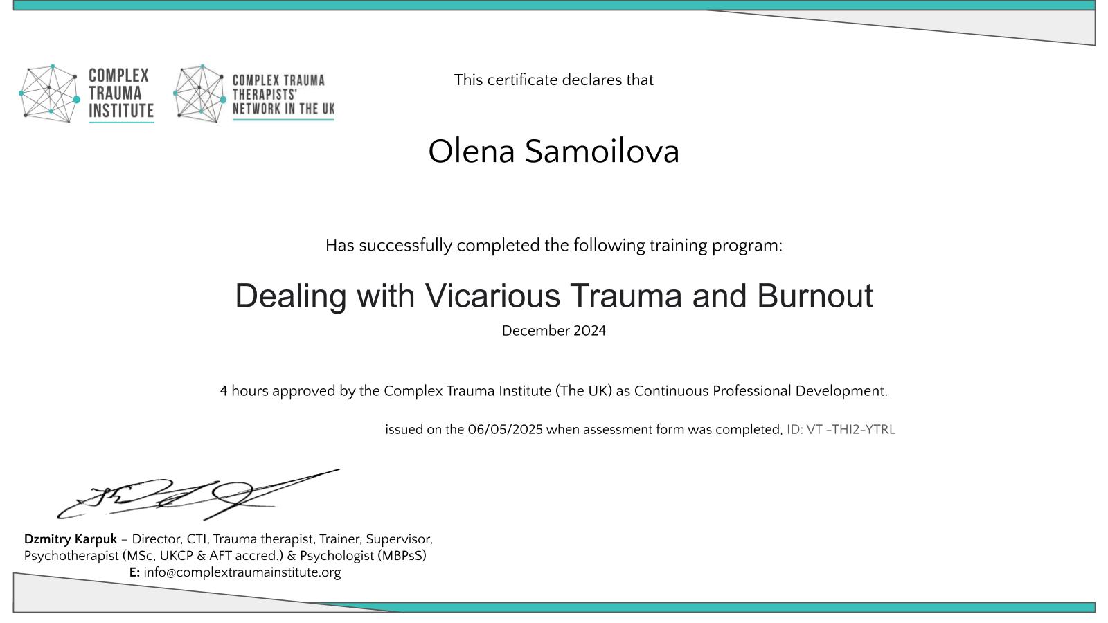 Окончила Запорожский Национальный Технический Университет, специальность "Психология", диплом магистра. Киевский Гештальт Университет. Повышение квалификации в области практической психологии и психотерапии и специализированная программа "Работа с травмами и потерями в подходе гештальт". Институт психологии здоровья "8-ми пробковая программа по работе с потерей для взрослых, детей и подростков". Курс "Интегративные инструменты освобождения напряжения в теле". Курс по работе с военными и ветеранами "Техники травмафокусированной КПТ-терапии в работе с ПТСР", "Техники травмафокусированной терапии принятия и ответственности". Недавно окончила курс "Основы когнитивно-поведенческой терапии" и сейчас прохожу расширенный курс по кризисной поддержке и стабилизации от Complex Trauma Institute.