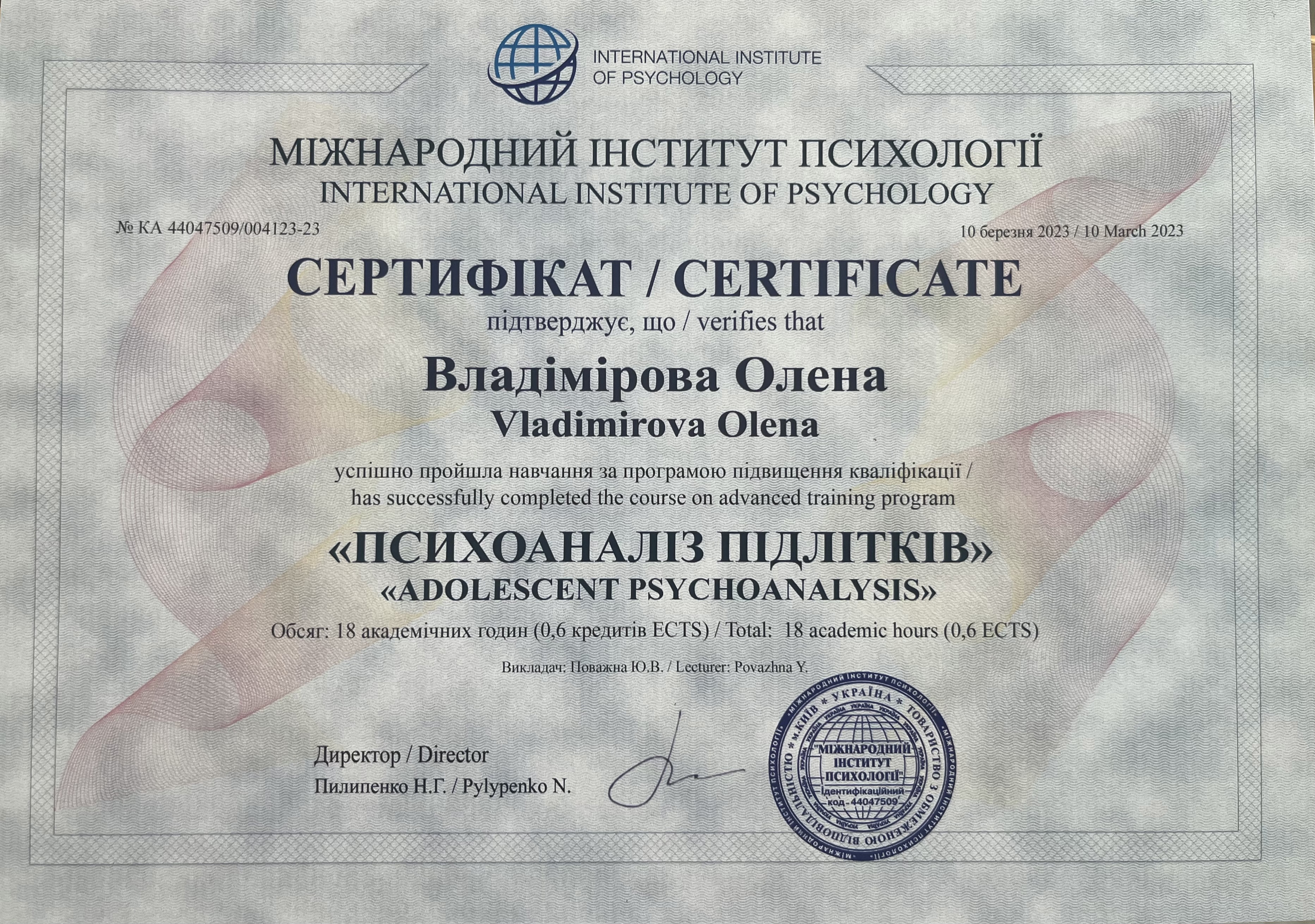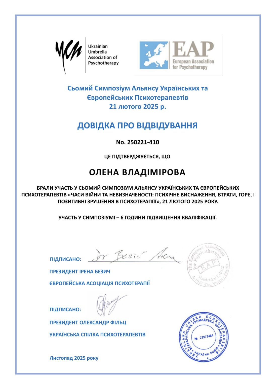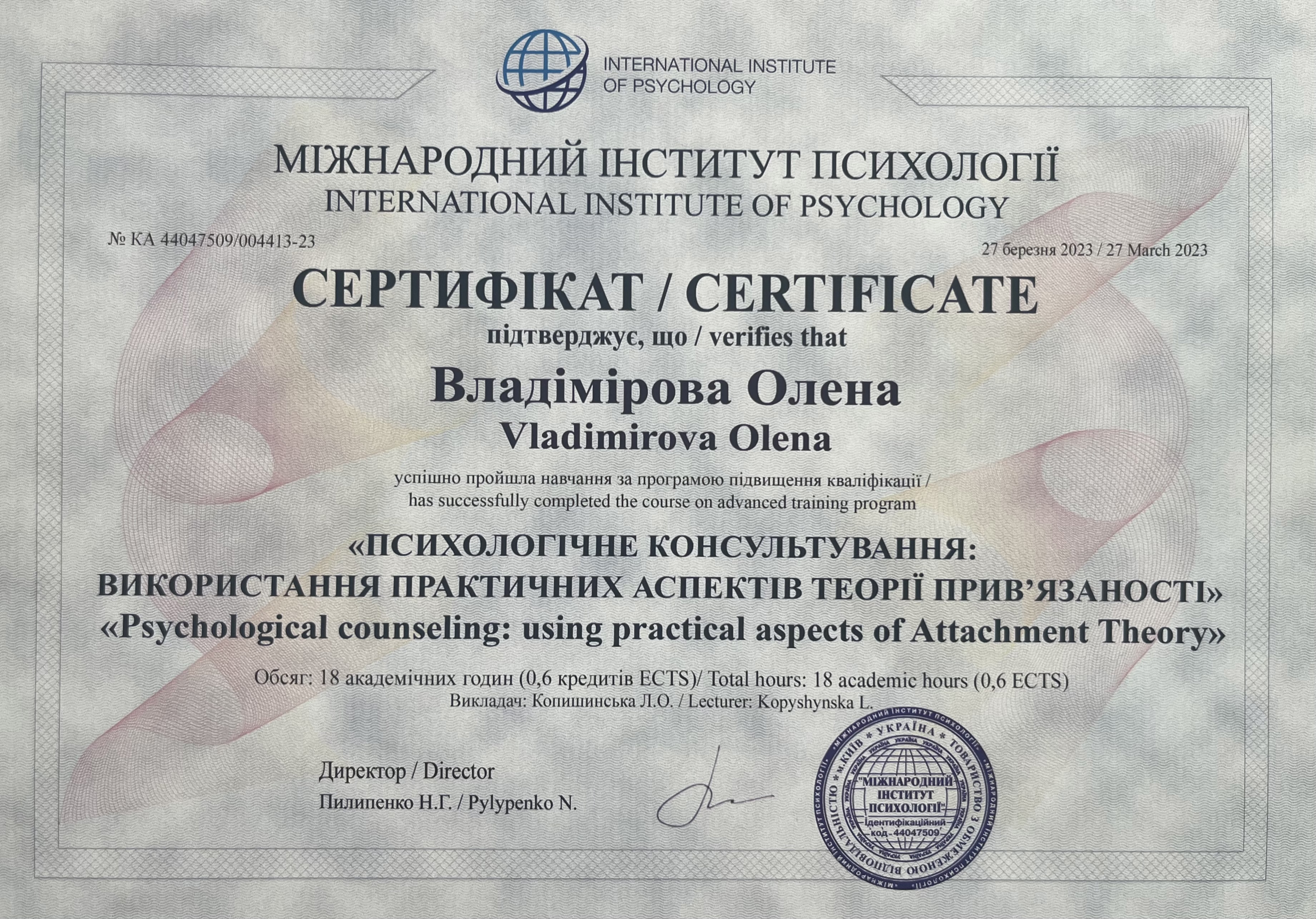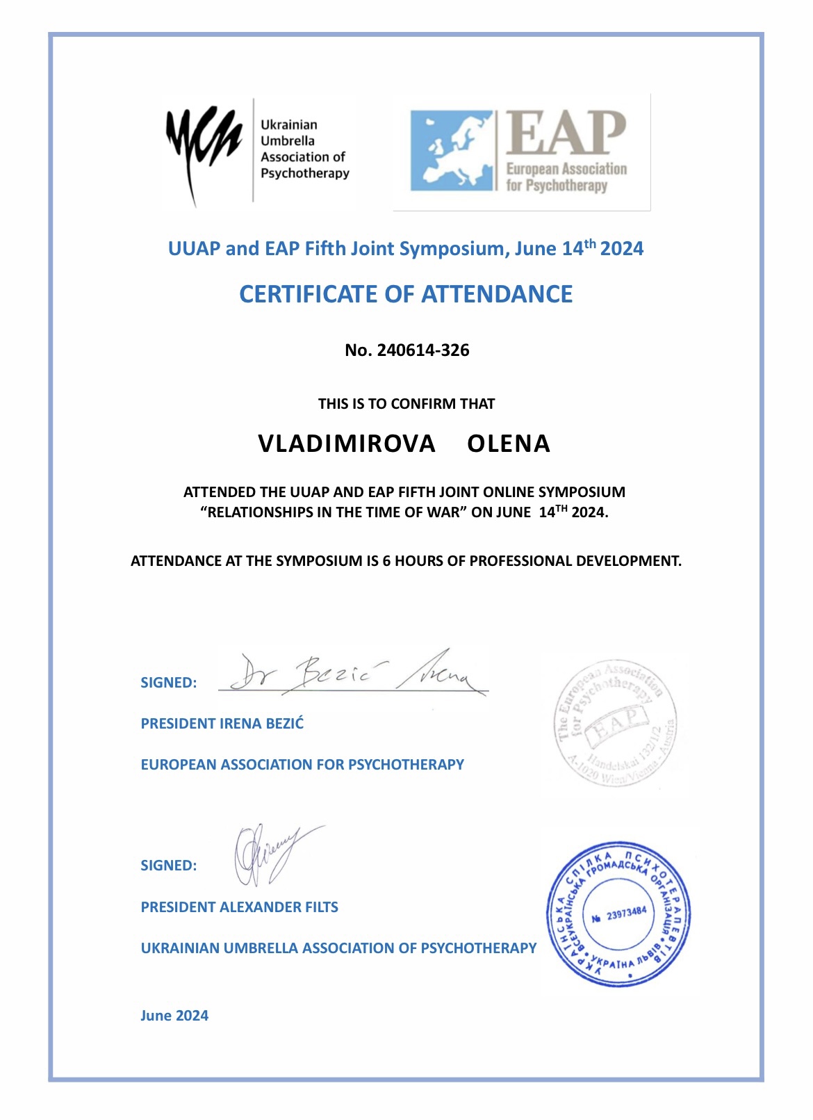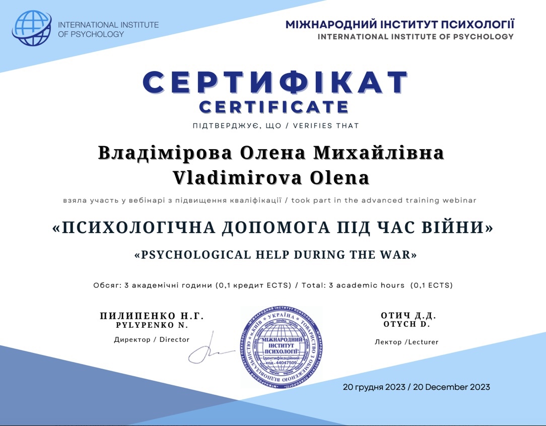 УУБП и ЕАП "Отношения во время войны", VII симпозиум альянса украинских и европейских психотерапевтов «Времена войны и неопределенности: психическое истощение, потери, горе и положительные сдвиги в психотерапии». Прошла обучение и является волонтером на линии психологической помощи военным и их семьям (ОО «Фонд Янины Соколовой» Стоит ЖИТЬ)