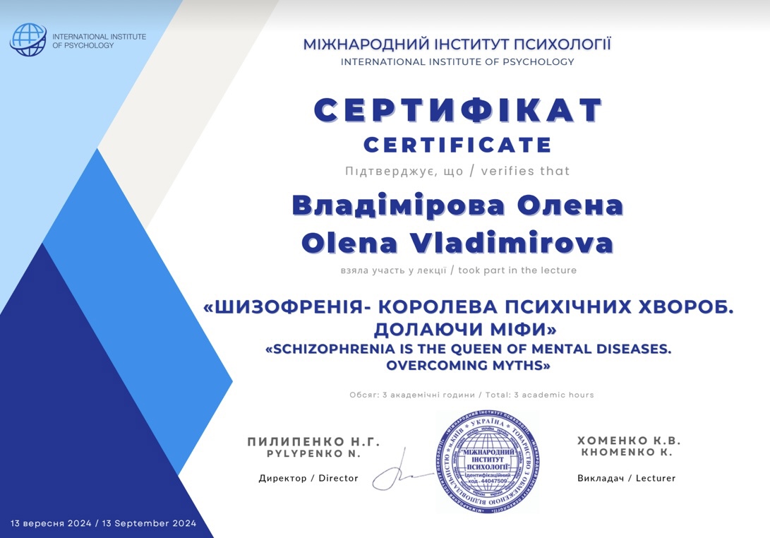 Я дипломированный психолог, гештальт-терапевт в обучении КГУ и опыт работы с детьми, подростками, семьями и парами. Мой подход сочетает в себе профессиональные знания, чувствительность к уникальности каждого человека и искреннее стремление помочь. Окончила специализацию «Работа с детьми, подростками и семьей в гештальтном подходе», в процессе получения «Работа с парами и семьями». Прошла следующие обучение и семинары: «Пропедевтика психиатрии», «Психология эффективного общения», «Психологическое консультирование с фокусом на теорию привязанности», «Основы психоанализа и современной психосоматики», «Психоанализ подростков», «Психологическая помощь в условиях