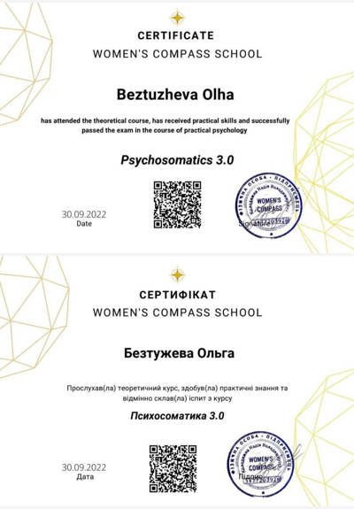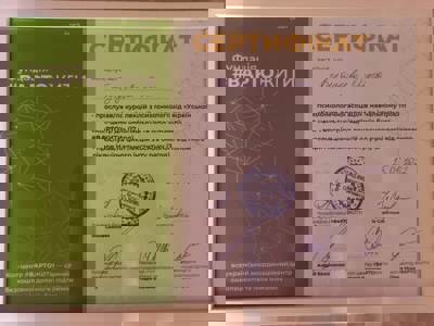 2. Введение в гештальт-терапию, консультирование, Украинский институт современной гештальт-терапии, 1 степень, с февраля по декабрь 2020 г., 120 часов.