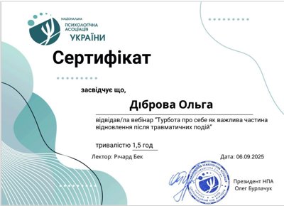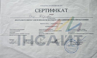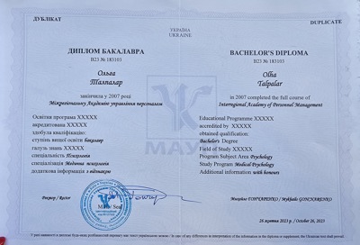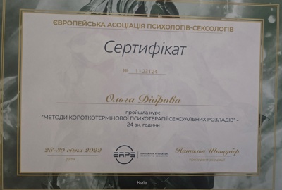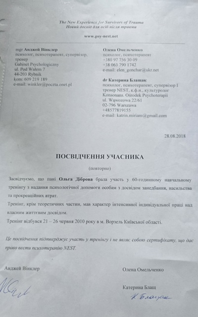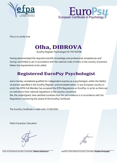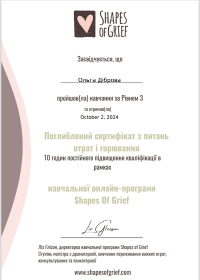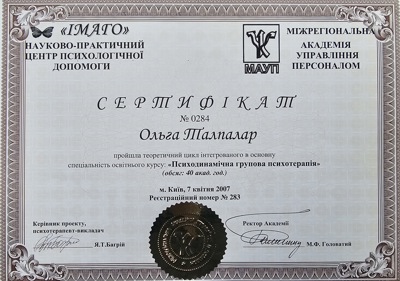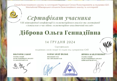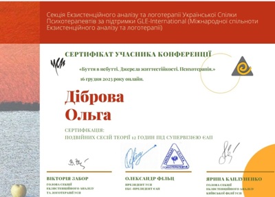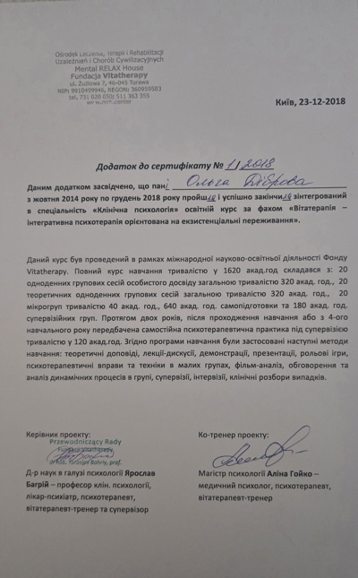 Курс психодинамической психотерапии. Школа Vitatherapy, подход, запатентованный в Польше. Заканчиваю обучение по логотерапии и экзистенциальному анализу в GLE International (Вена, Австрия).