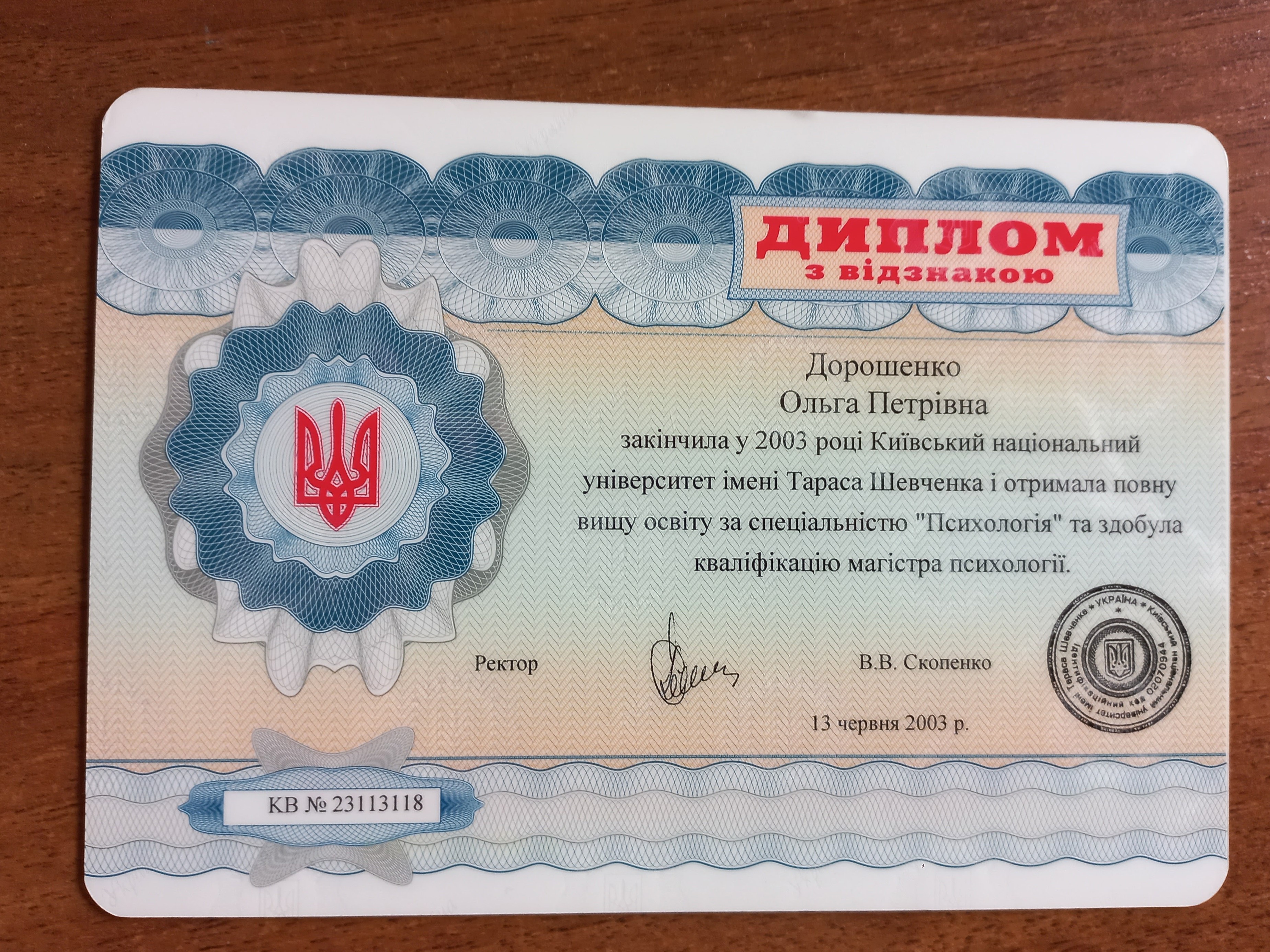 Киевский национальный университет имени Тараса Шевченко, направление подготовки "Психология", бакалавр психологии, 2002 г., магистр психологии, 2003 г.