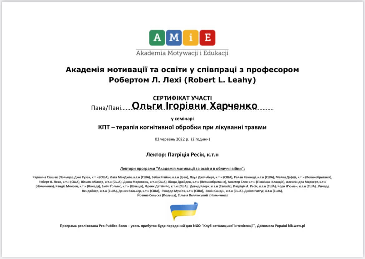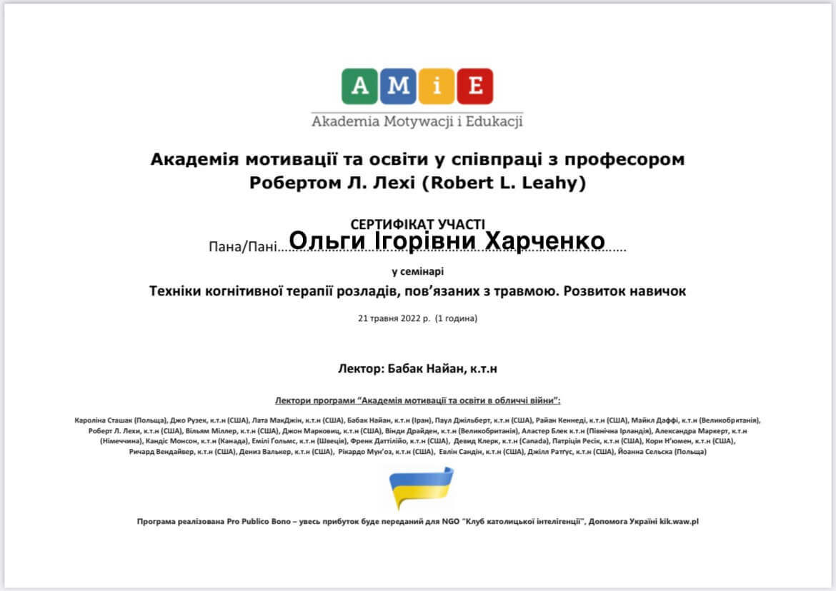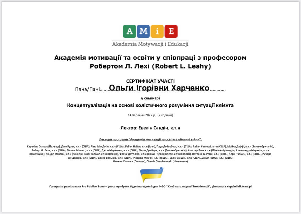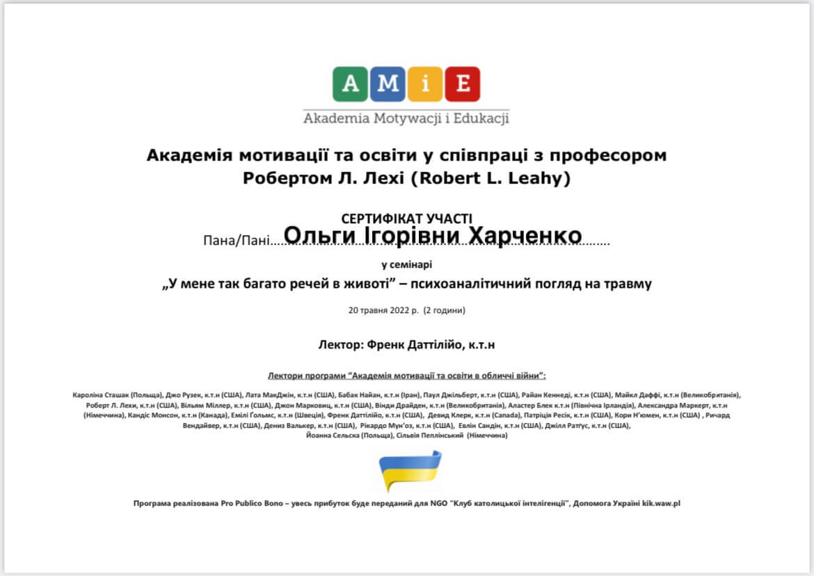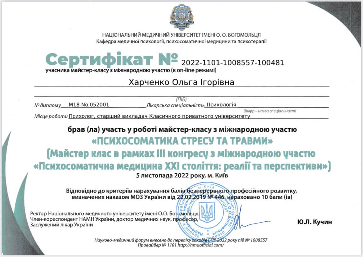 Магистр психологии, Классический приватный университет; Киевский Гештальт Университет; Межрегиональный институт Гештальта и Искусств. Уже много лет прохожу множество курсов и постоянно посещаю конференции по различным направлениям психотерапии.