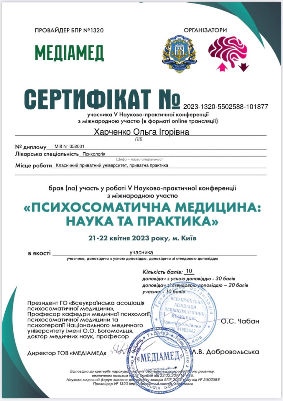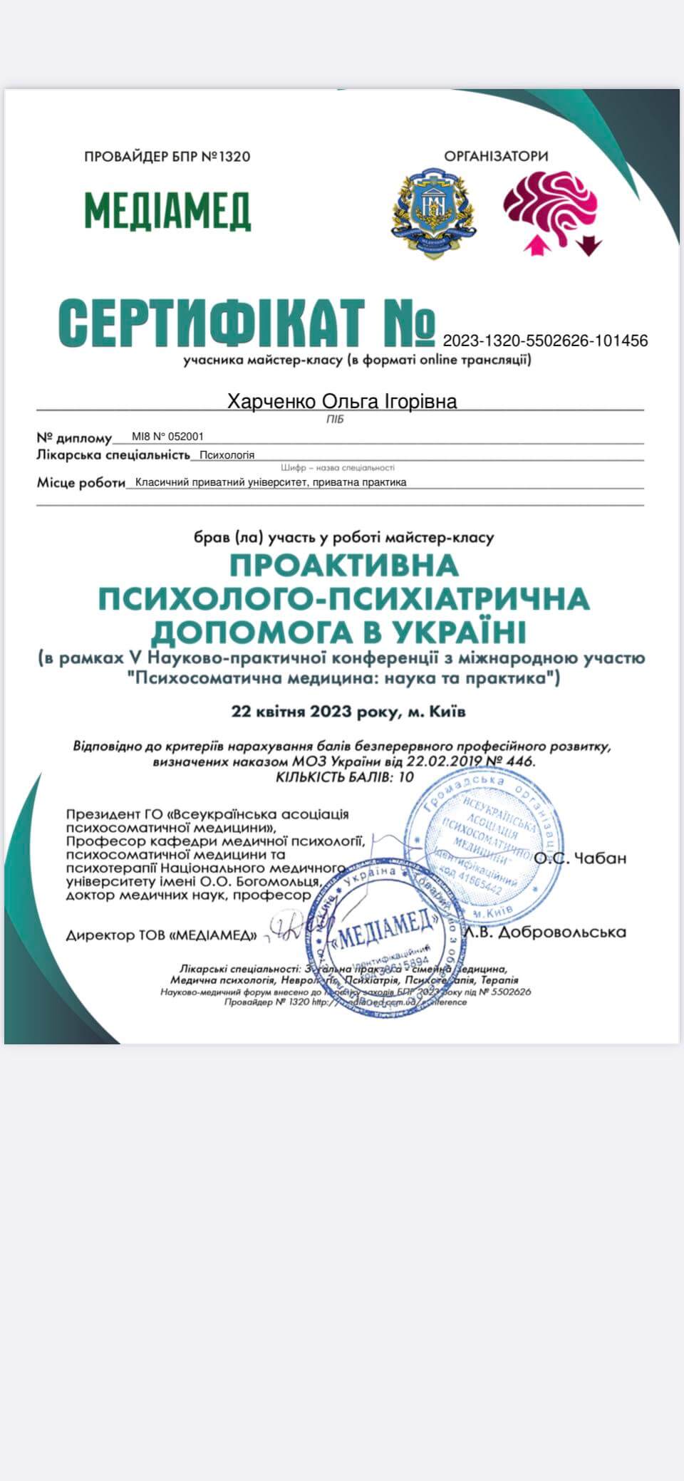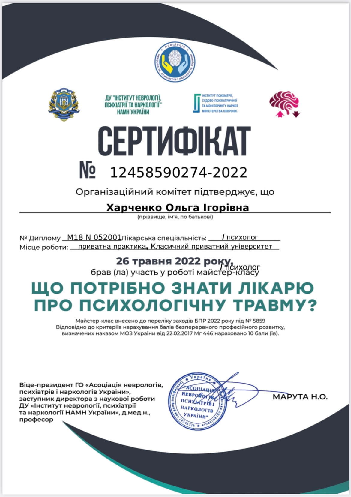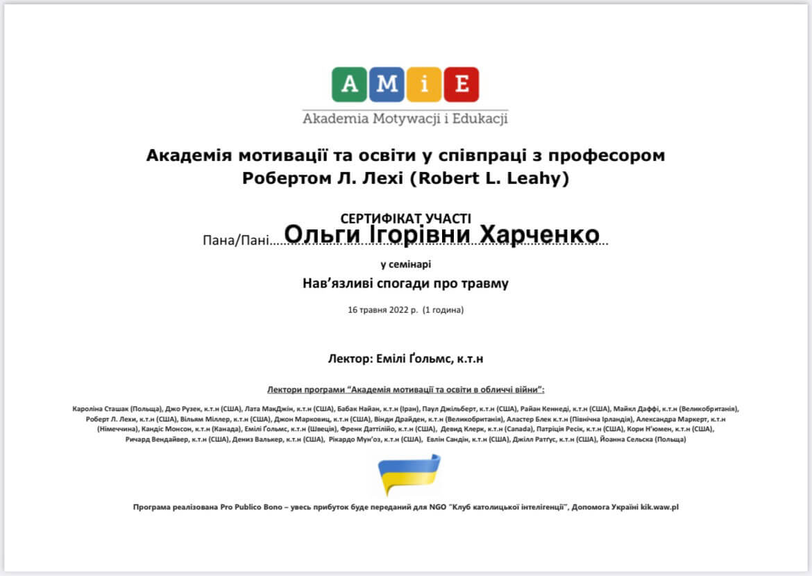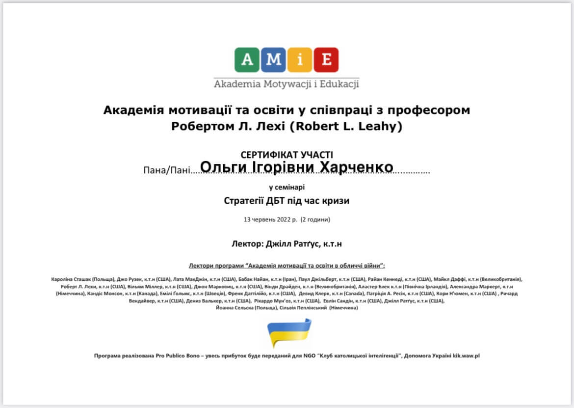 Магистр психологии, Классический приватный университет; Киевский Гештальт Университет; Межрегиональный институт Гештальта и Искусств. Уже много лет прохожу множество курсов и постоянно посещаю конференции по различным направлениям психотерапии.