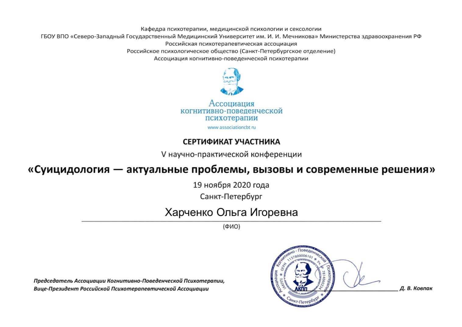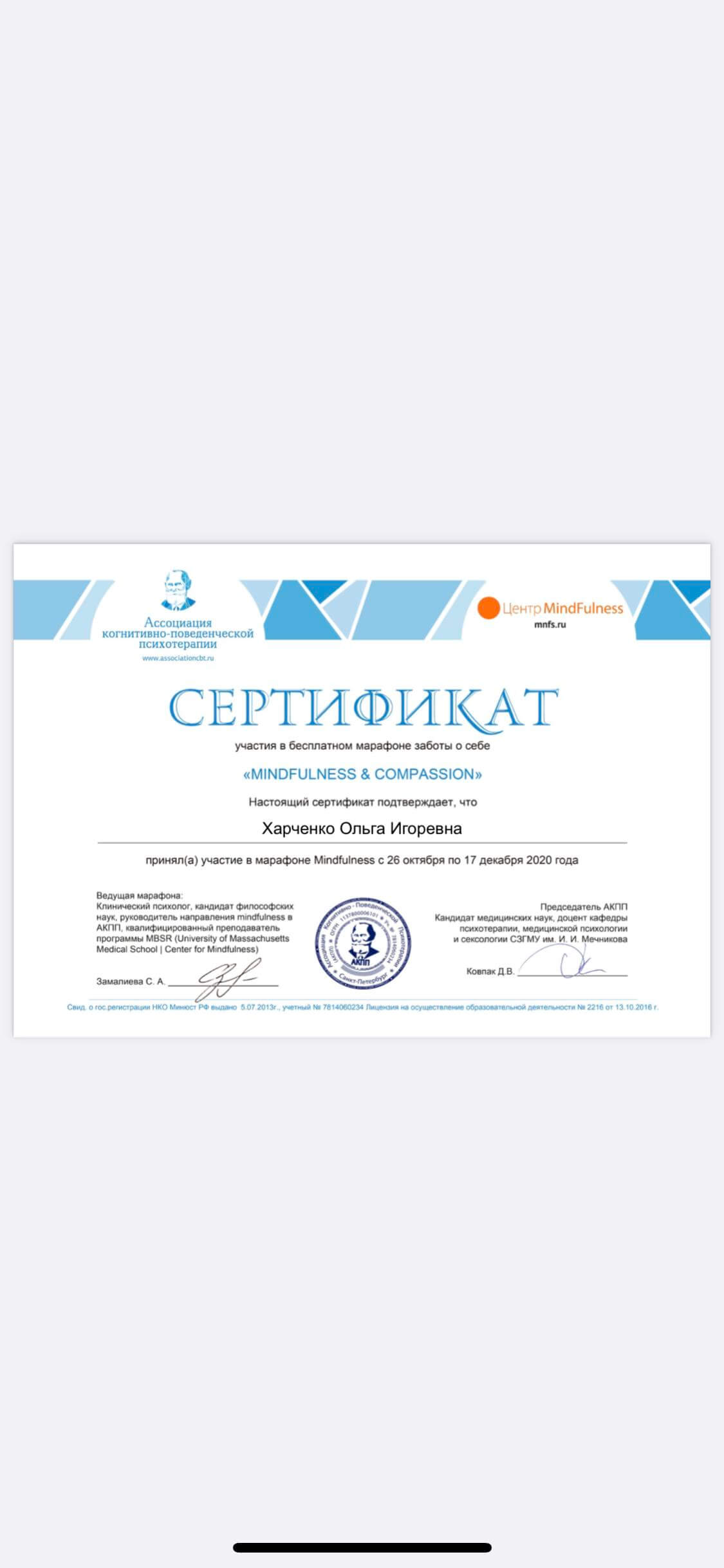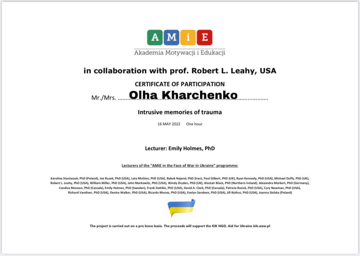 Постоянно учусь, специализация по терапии зависимых отношений, созависимости, зависимостей вообще. Регулярно посещаю научные и практические конференции и семинары. Хожу на супервидении, интервизии.
