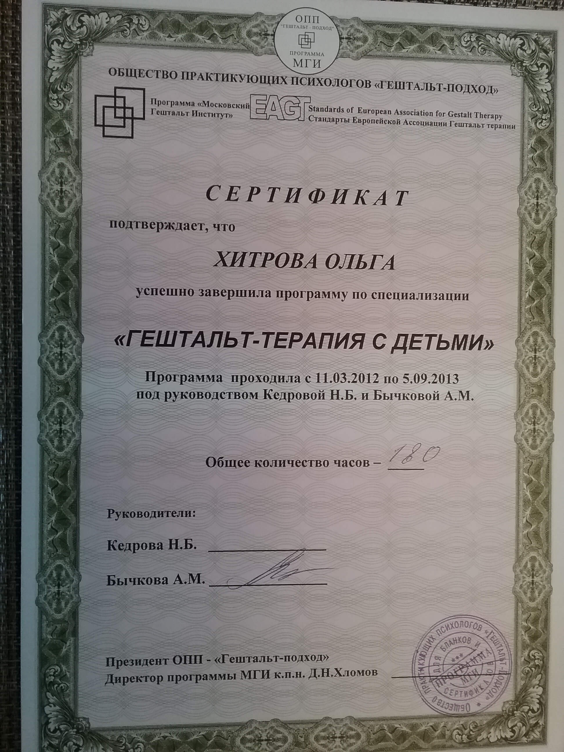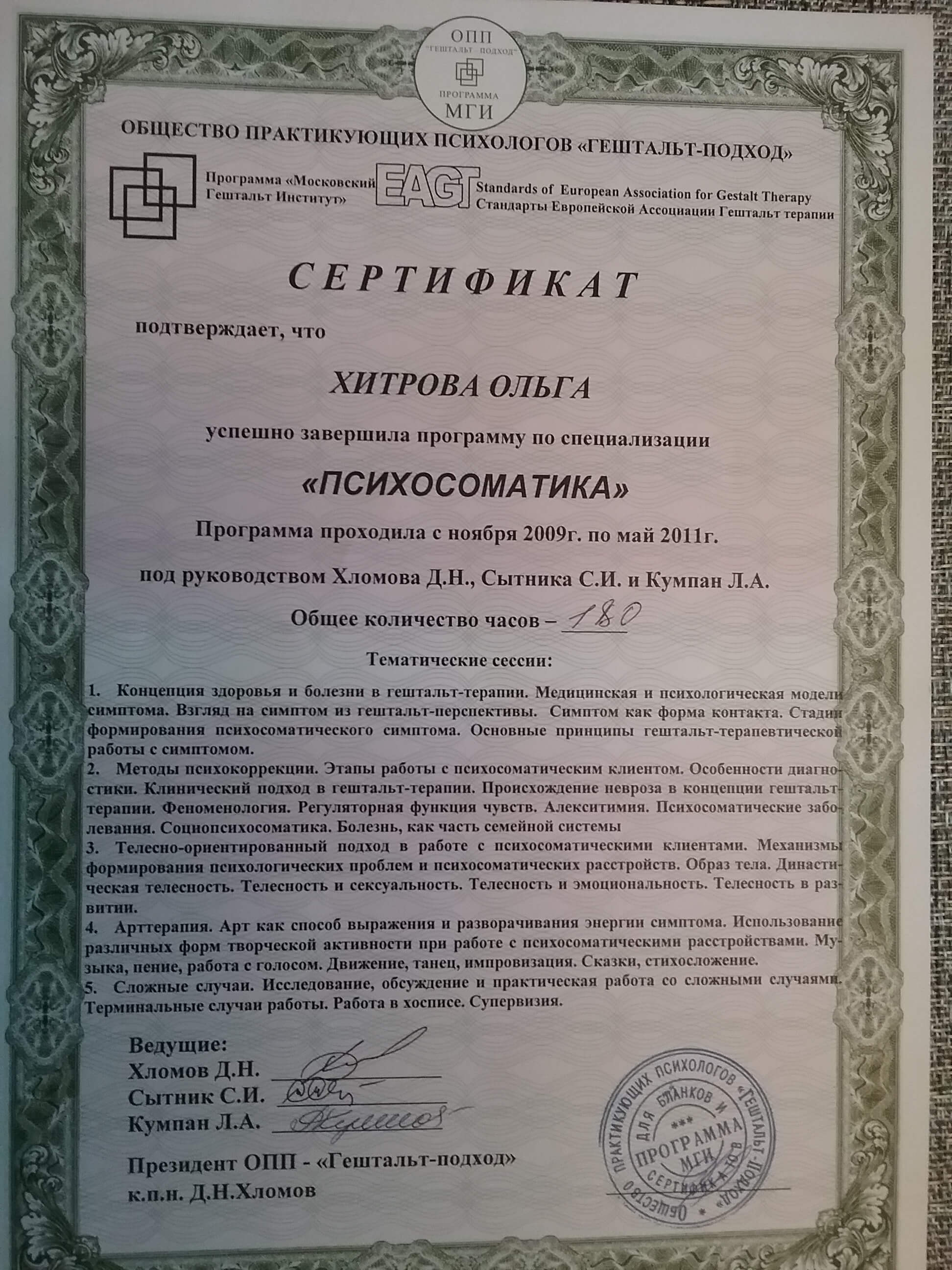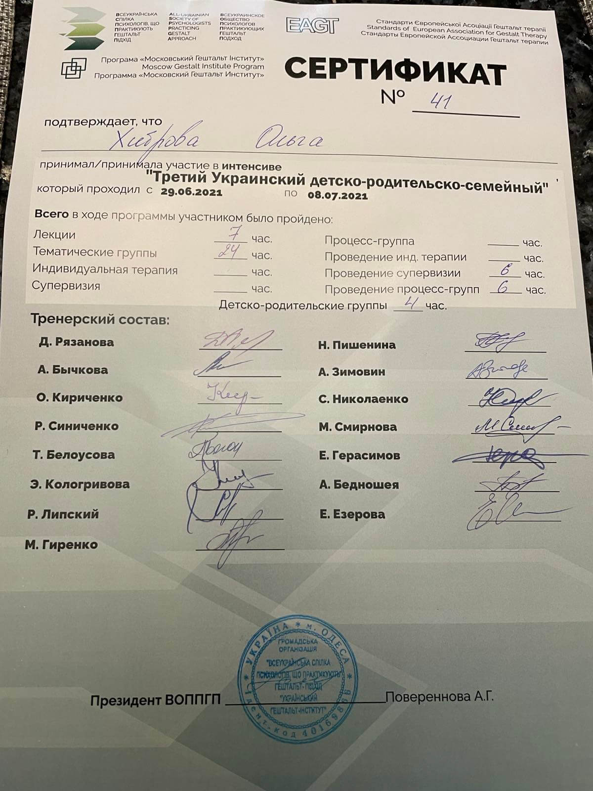 Я окончила педагогический институт, Киевский филиал МГИ - гештальт институт, 3 ступень. Сертифицированный супервизор.