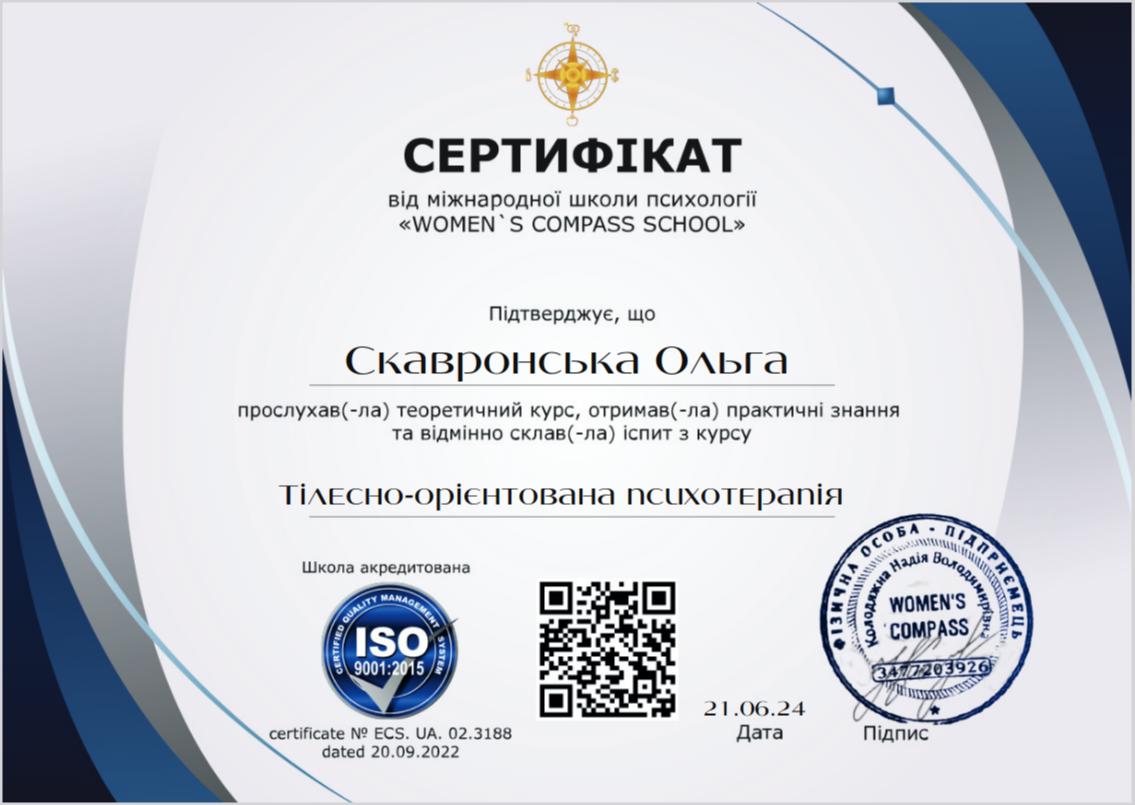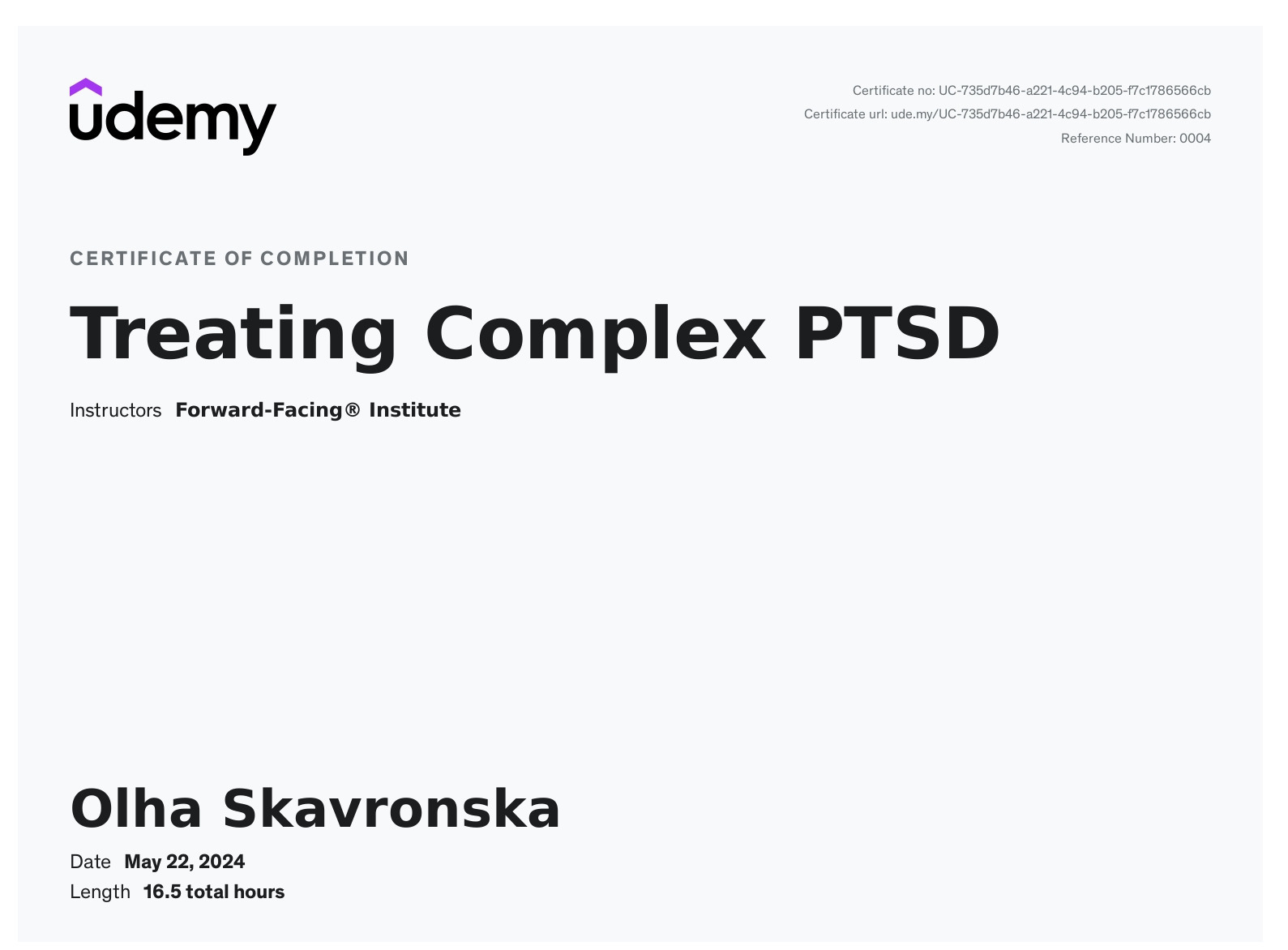 Магистратура психологии в ДНУ им. О.Гончара, обучение на гештальт-терапевта в МИГиС, курсы по КПТ в Women compass school, Treating complex PTSD(кПТСР) in Forward-facing institute
