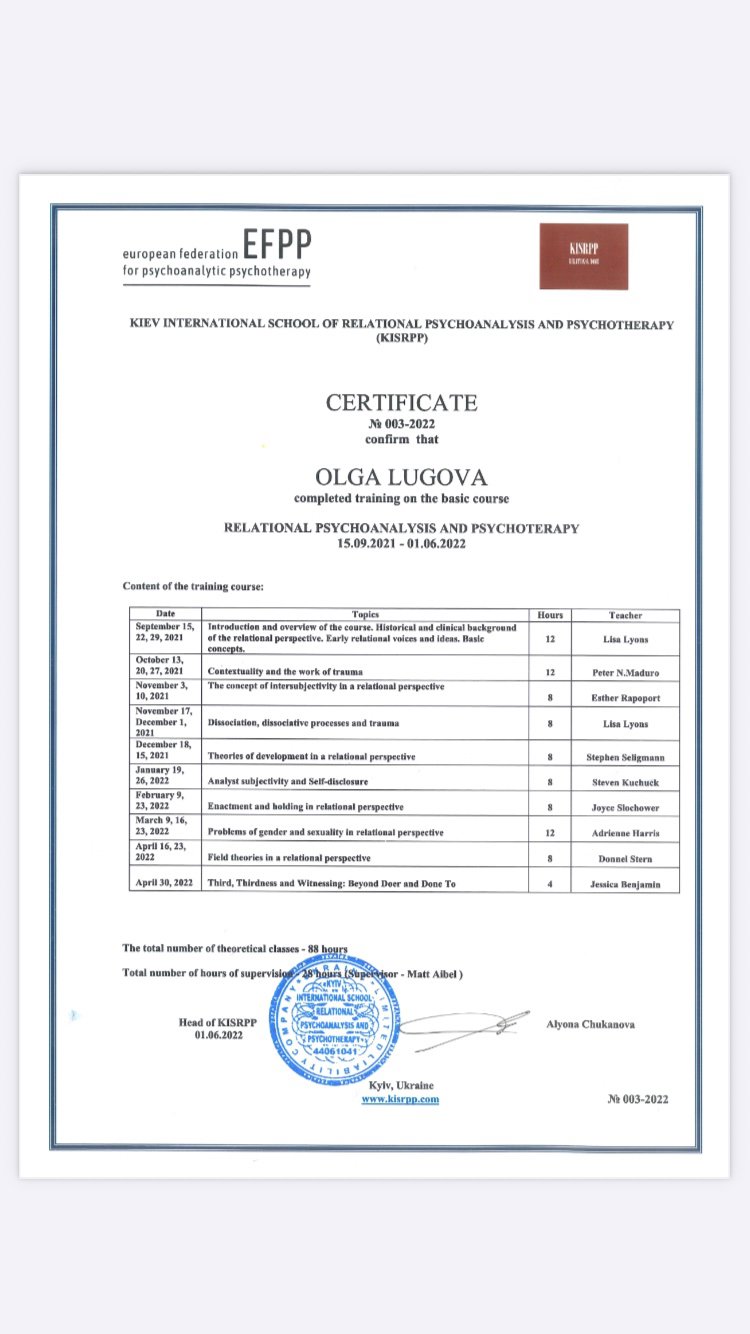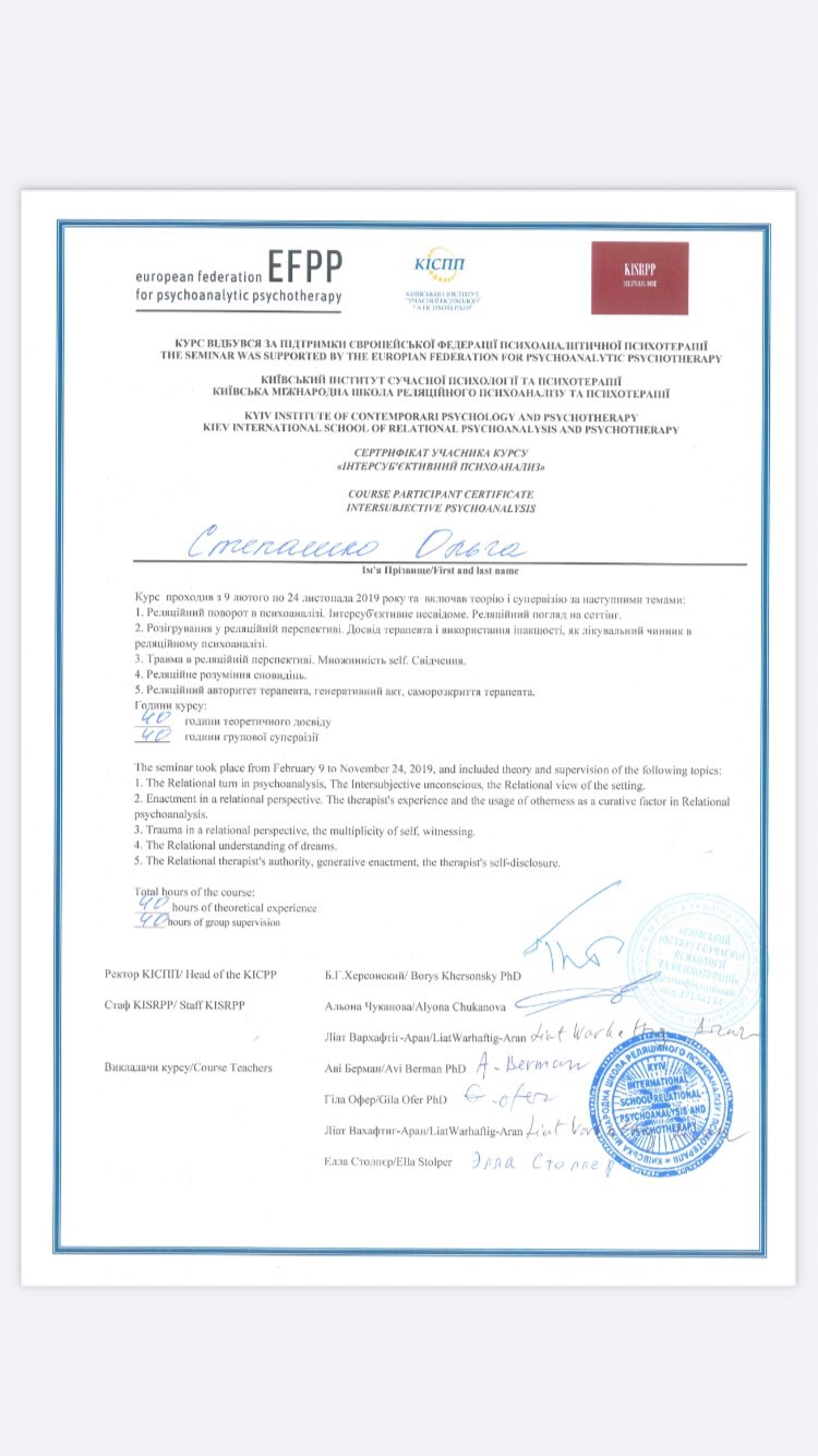 KIEV INTERNATIONAL SCHOOL OF RELATIONAL PSYCHOANALYSIS AND PSYCHOTHERAPY (KISRPP)
