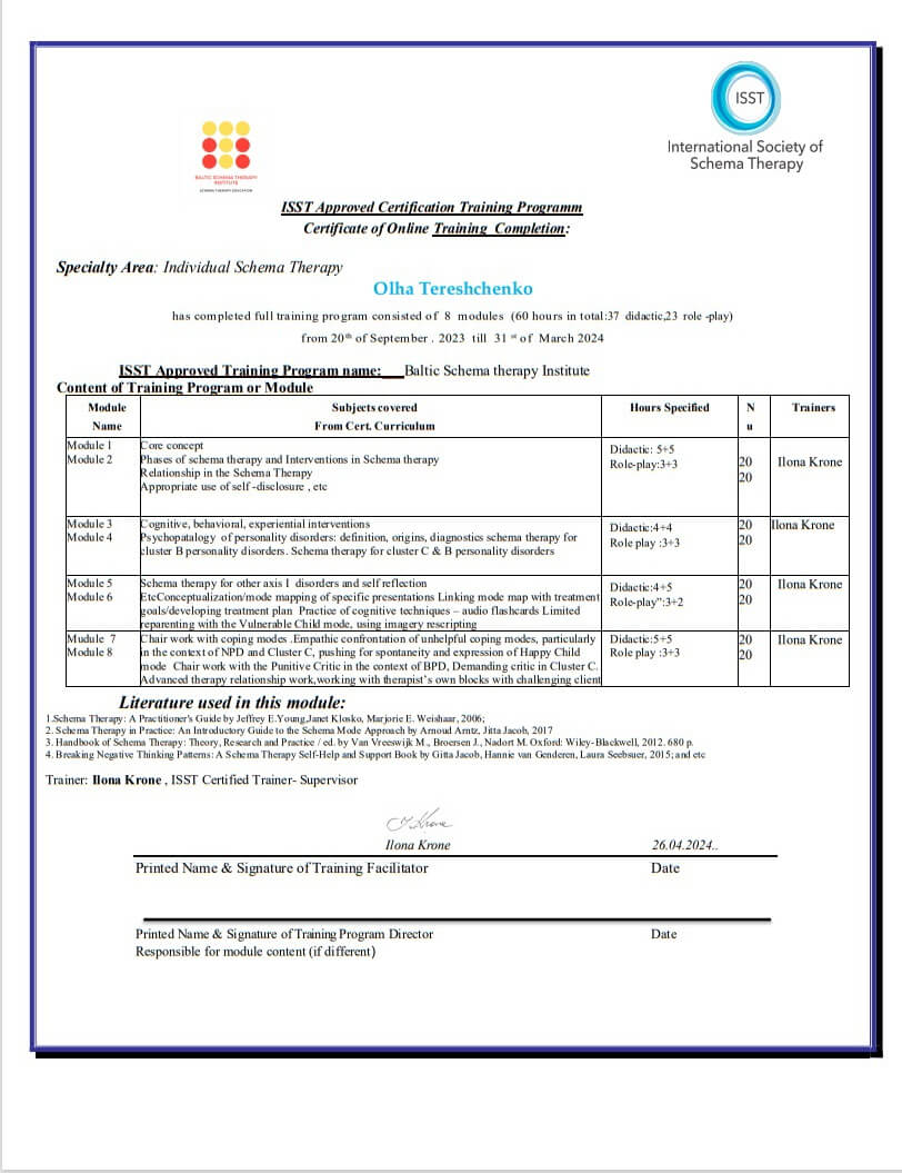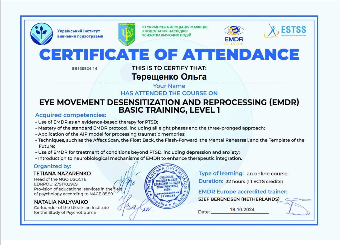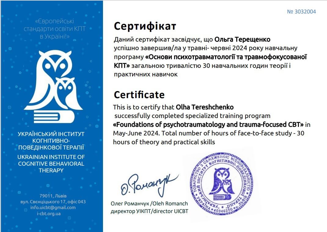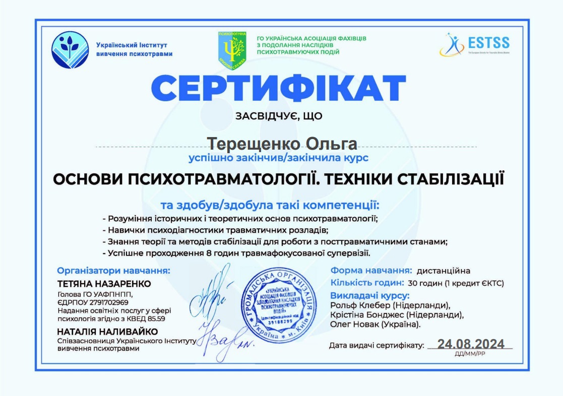 Южноукраинский институт психологии, психотерапии и управления, Международная академия позитивной психотерапии ИАРР, сертифицированный психотерапевт в методе положительной психотерапии (2019-2023 гг)