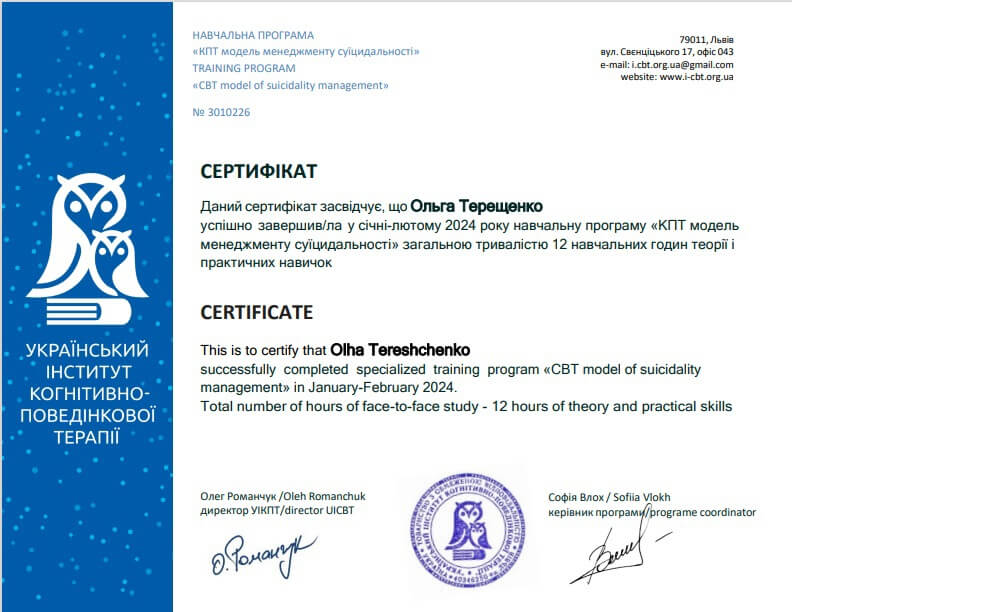 Южноукраинский институт психологии, психотерапии и управления 2019 года по настоящее время. Психотерапевт в методе положительная психотерапия (окончание курса весна 2023 года)