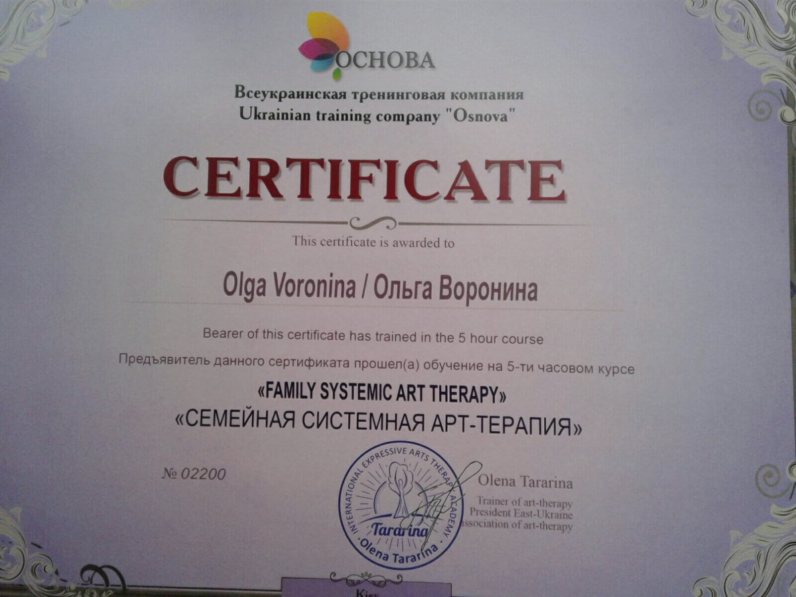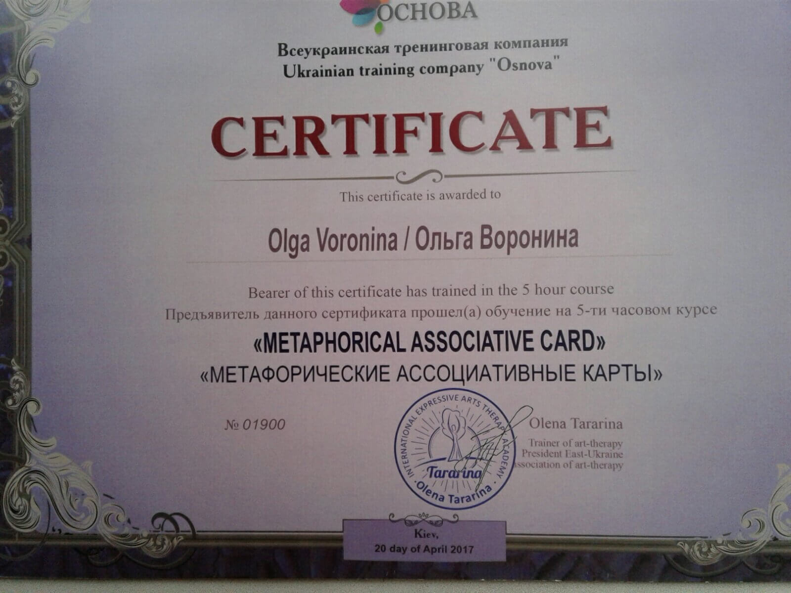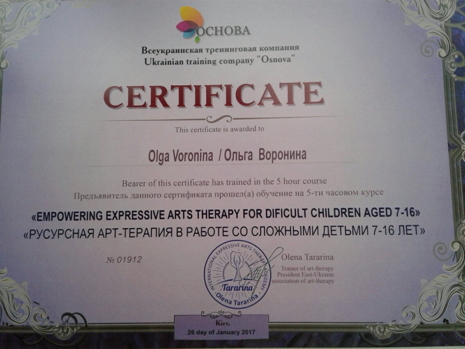 МГИ, ВСеукраинская тренинговая компания основа" РАбота с МАК"" РЕсурсная арт-терапия со сложными детьми", институт по повышению квалификации курс " Семейный психолог", международный цент по подготовке сказкотерапевтов