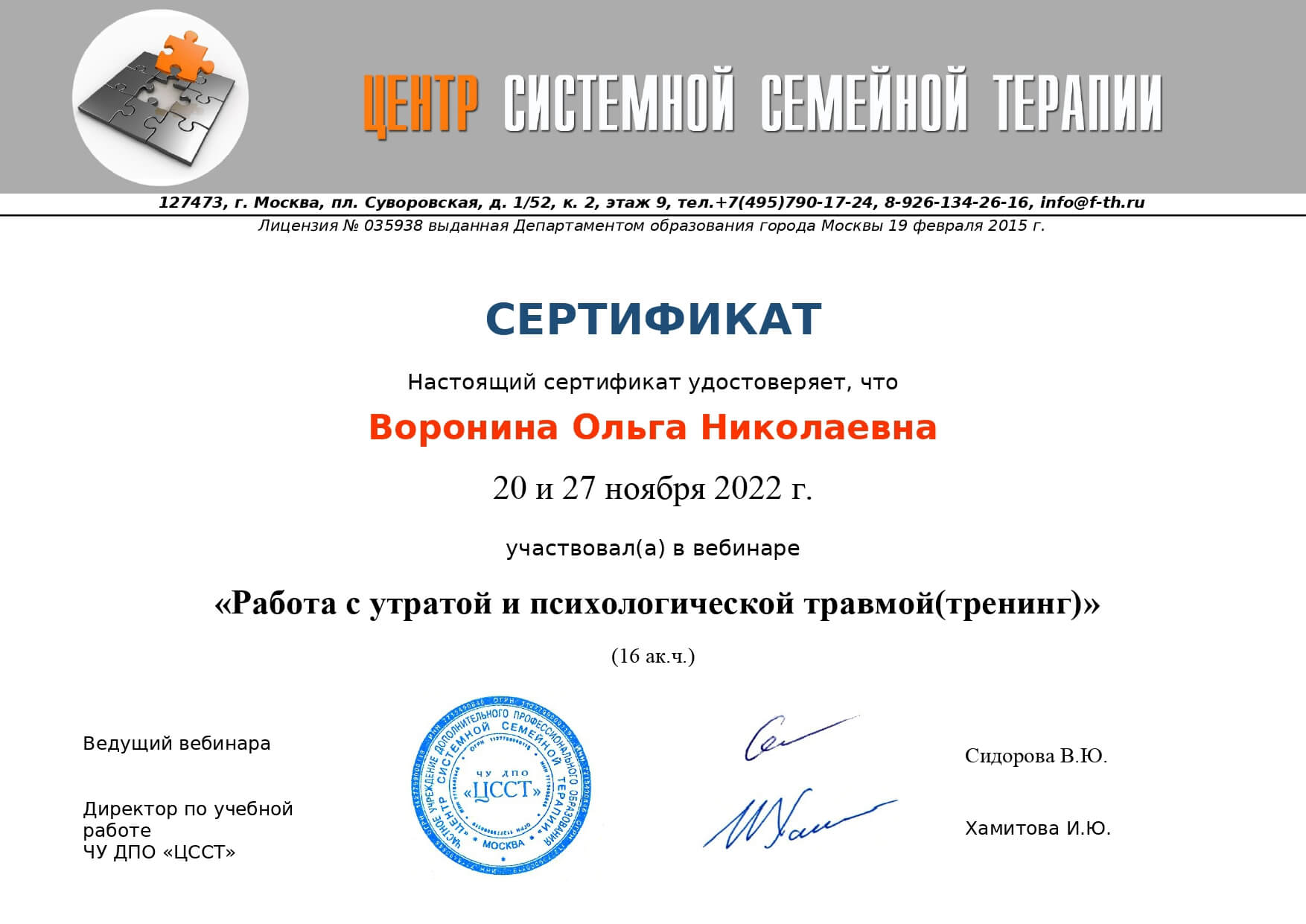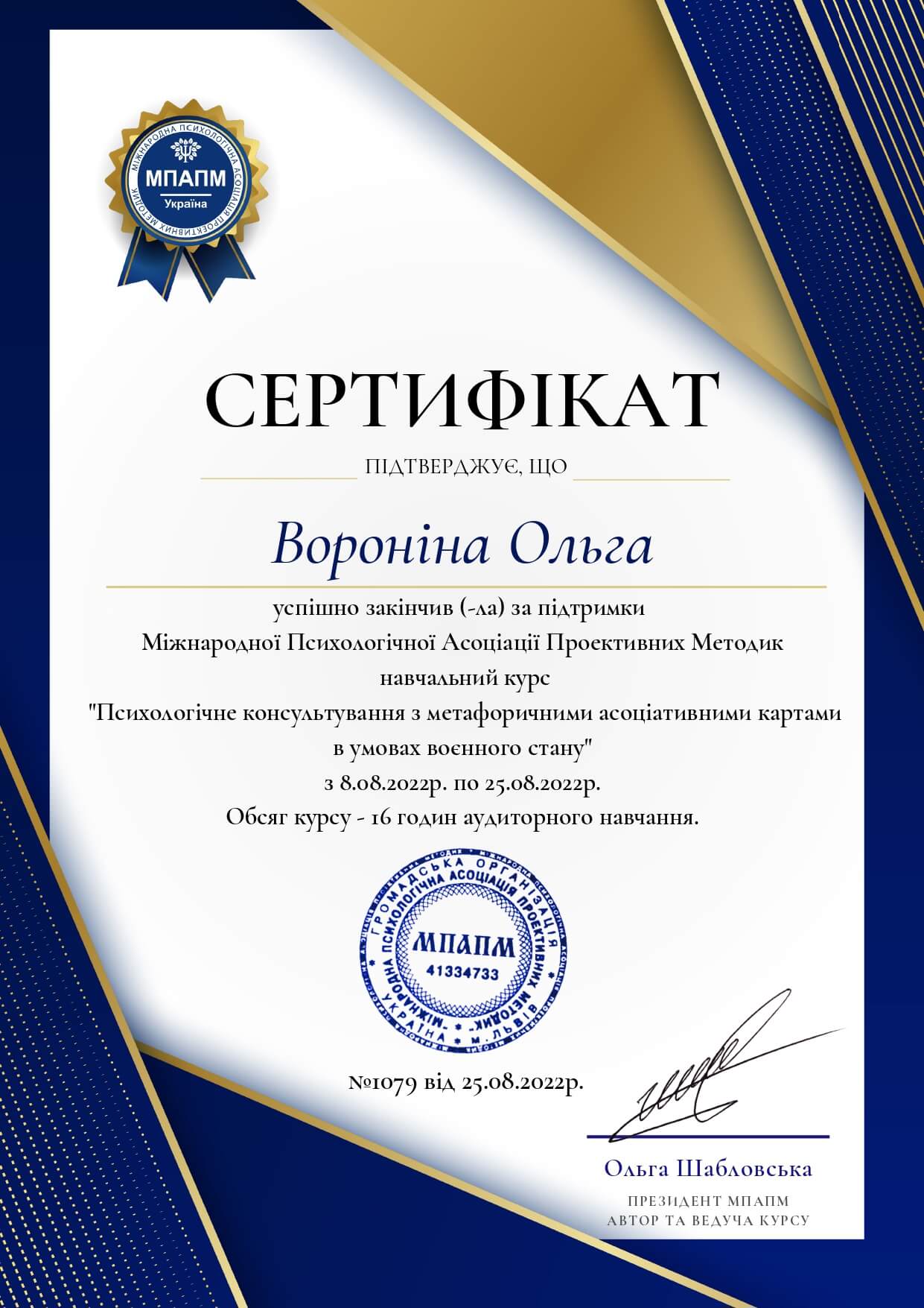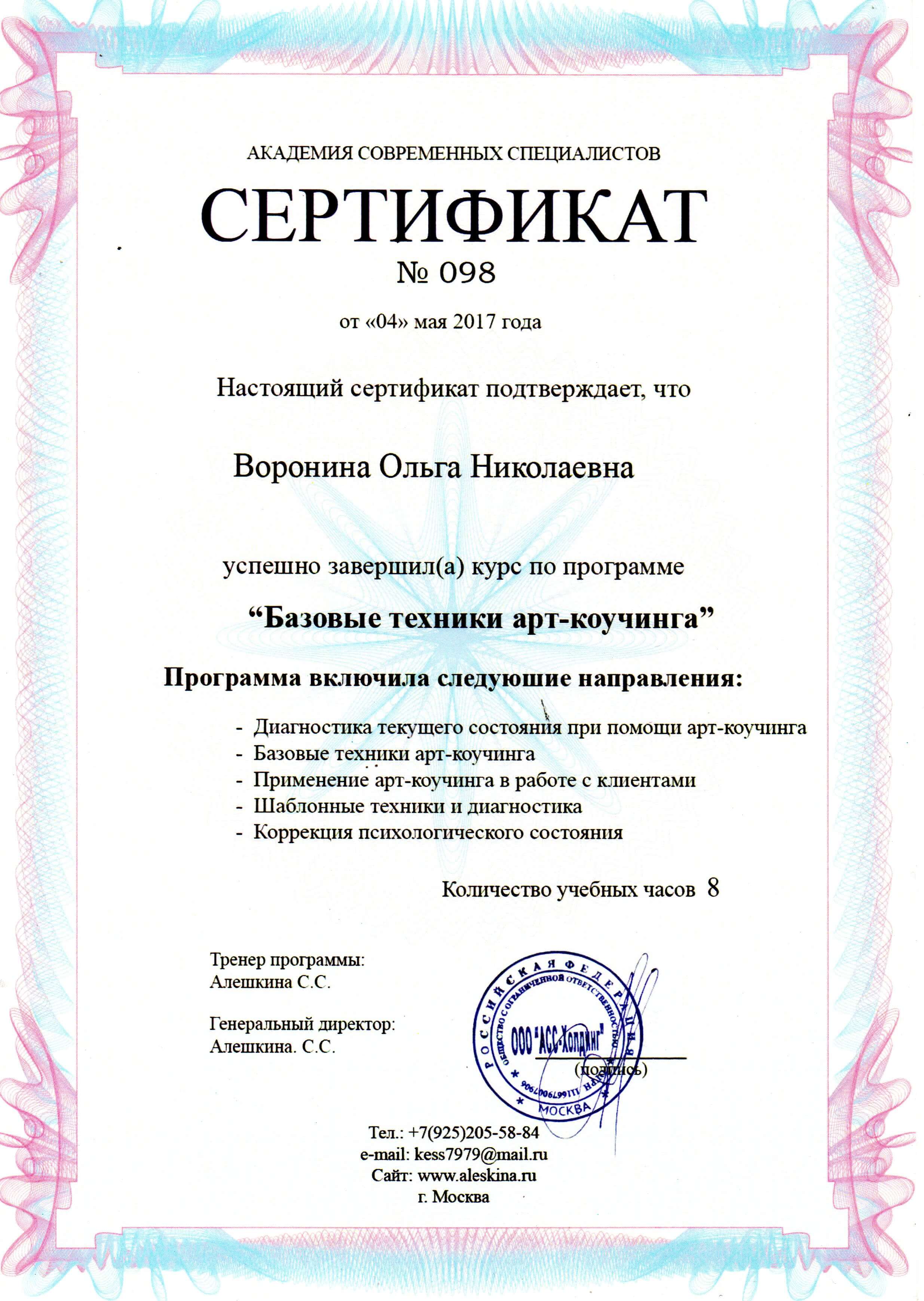 МГИ, ВСеукраинская тренинговая компания основа" РАбота с МАК"" РЕсурсная арт-терапия со сложными детьми", институт по повышению квалификации курс " Семейный психолог", международный цент по подготовке сказкотерапевтов