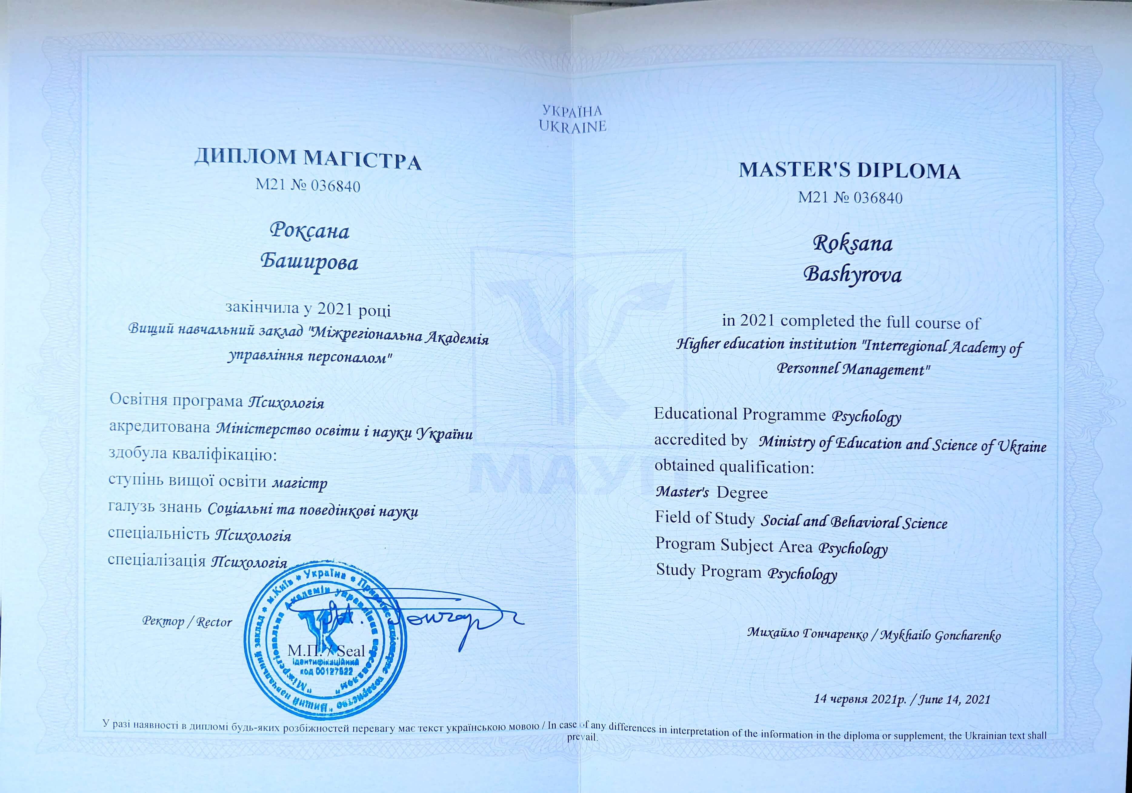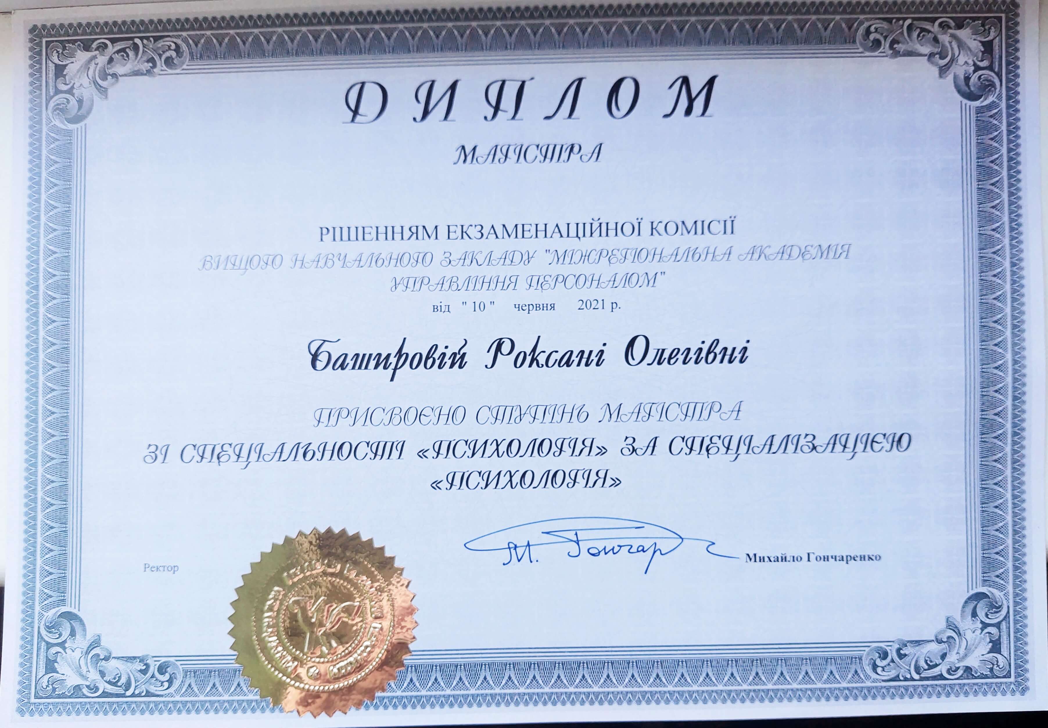 СПГУП (г. Санкт-Петербург) магистр по специальности "Психология"