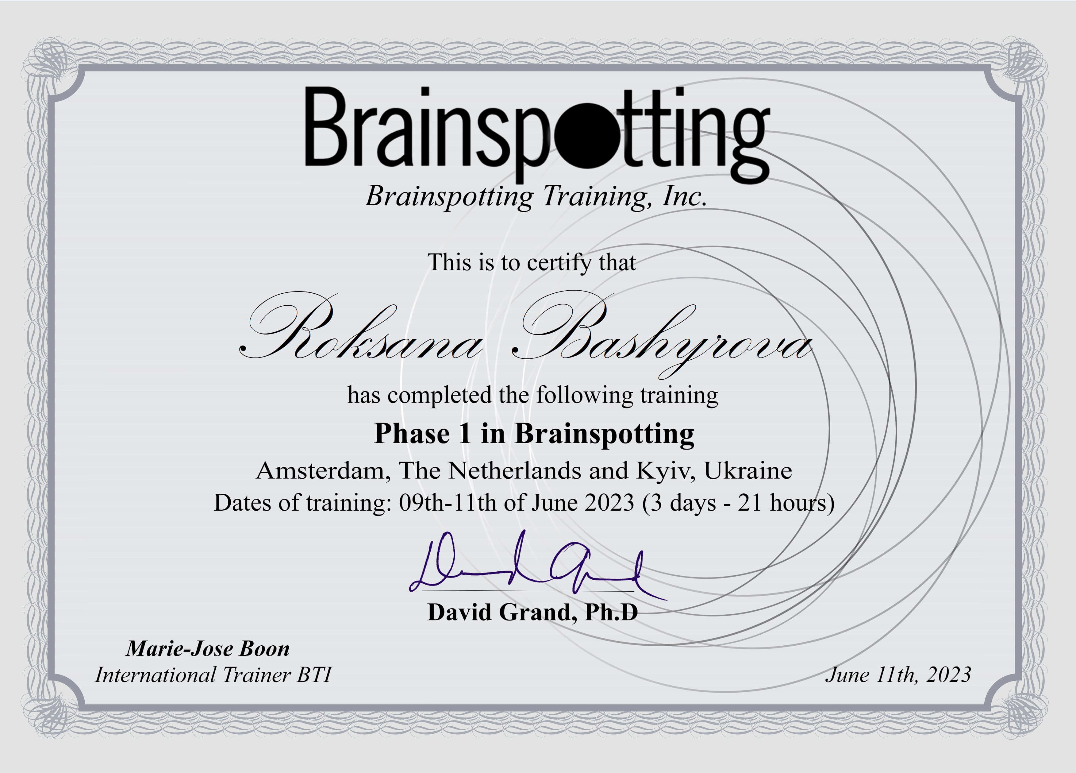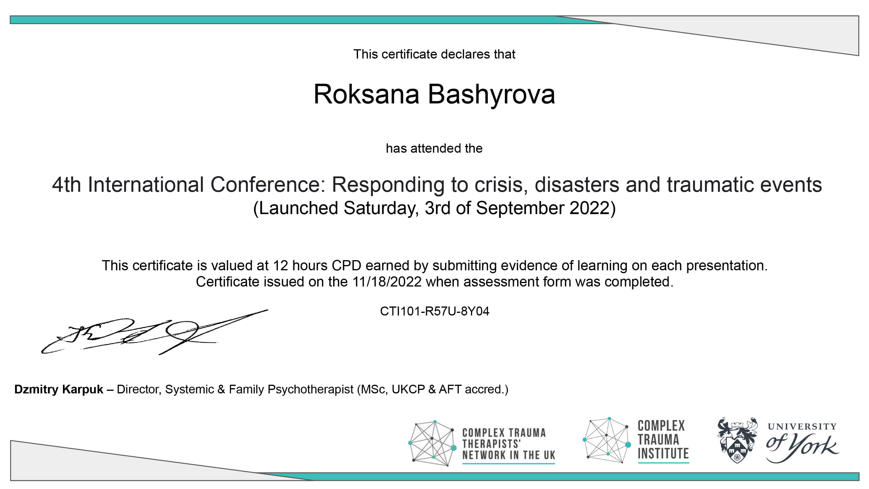 Киевское представительство Московского Гештальт Института обучение на 3 (супервизорской) ступени, успешно сертифицирована как супервизор и ведущий групп в октбяре 2019 г.