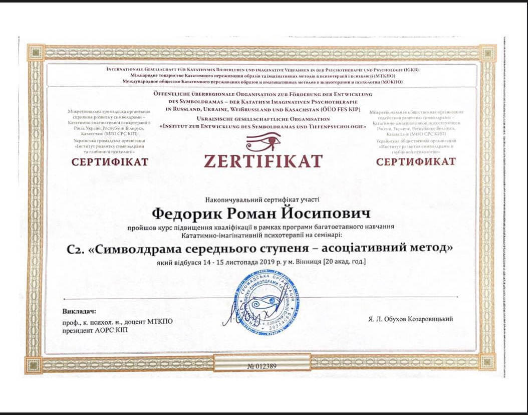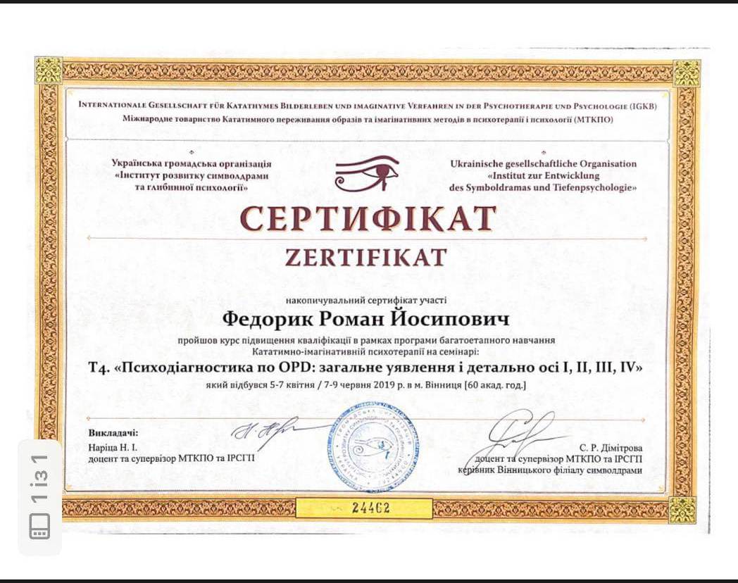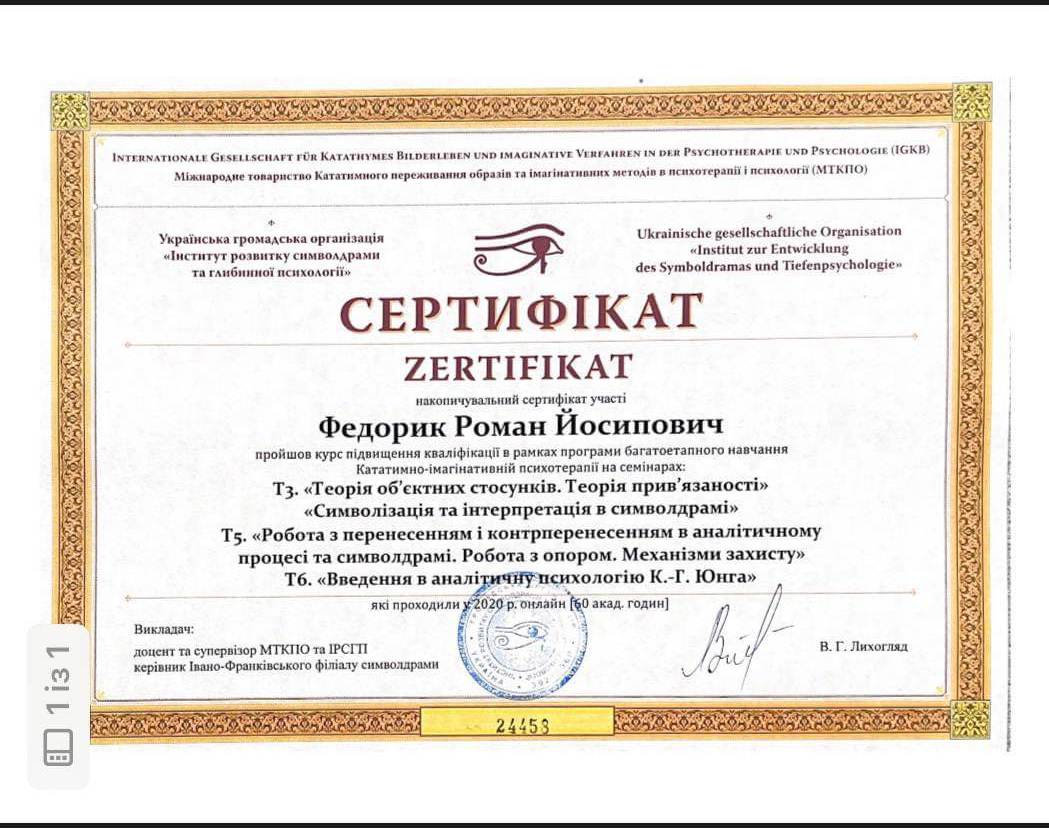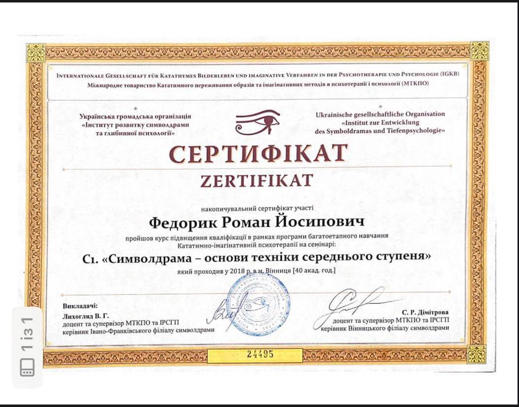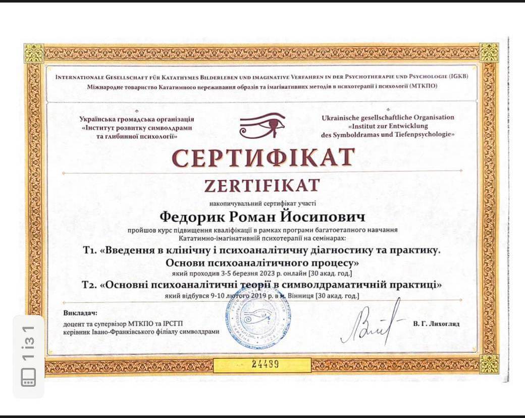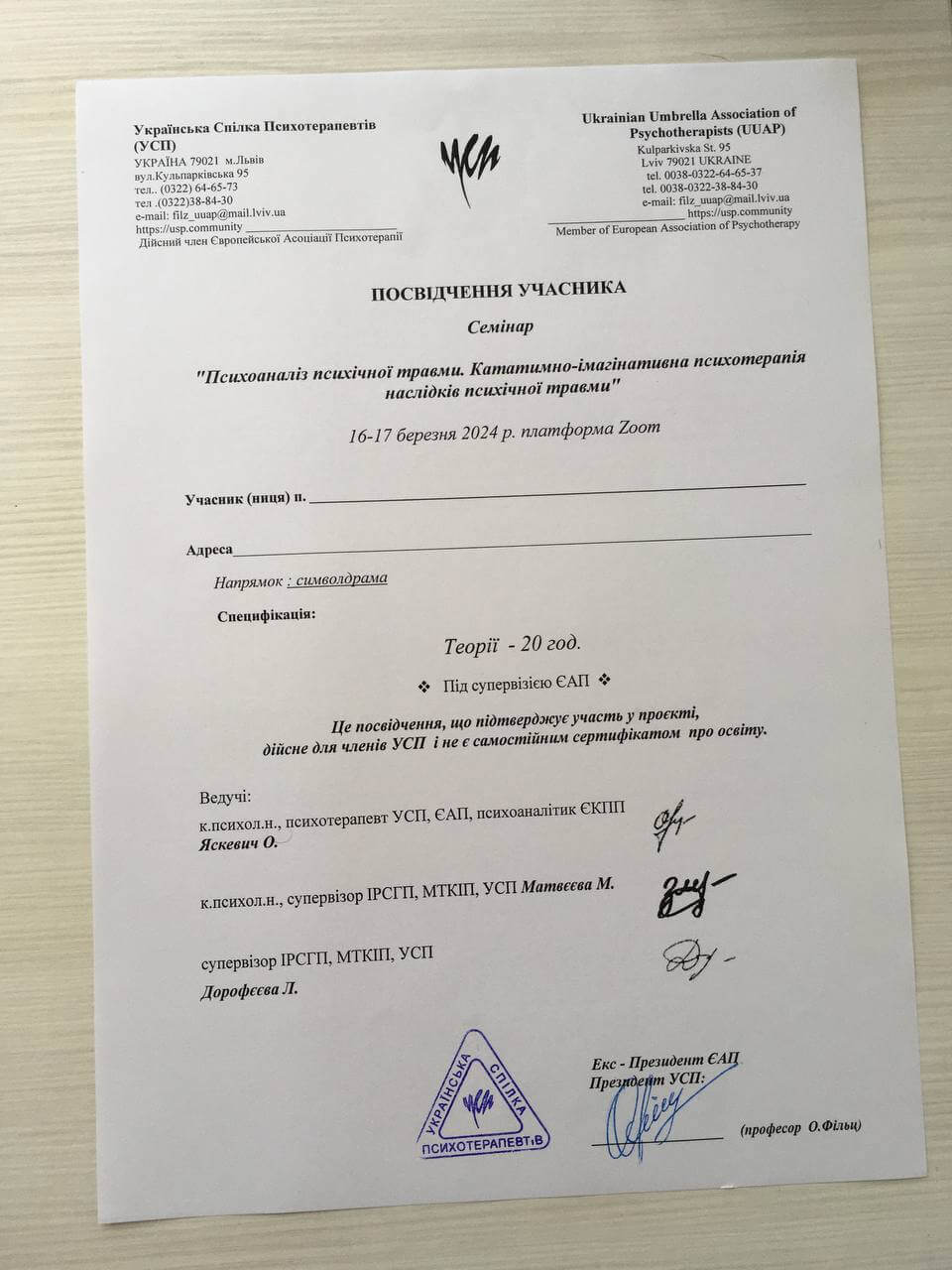 Участие в психотерапевтической группе; освоение техник практической работы; получение звания психотерапевта. - имеющаяся собственная психотерапия, супервизия и постоянные учения, для повышения профессиональной квалификации.