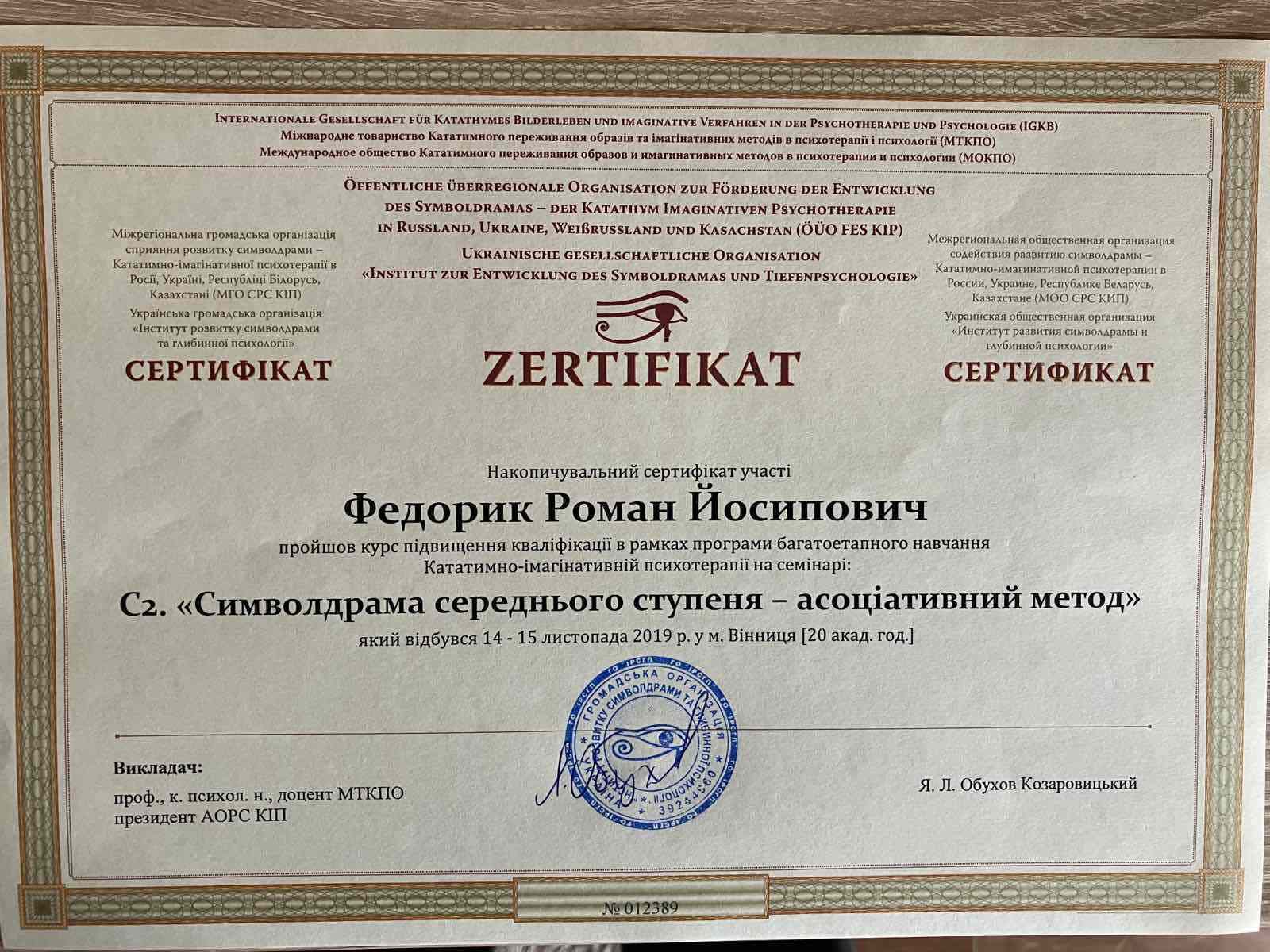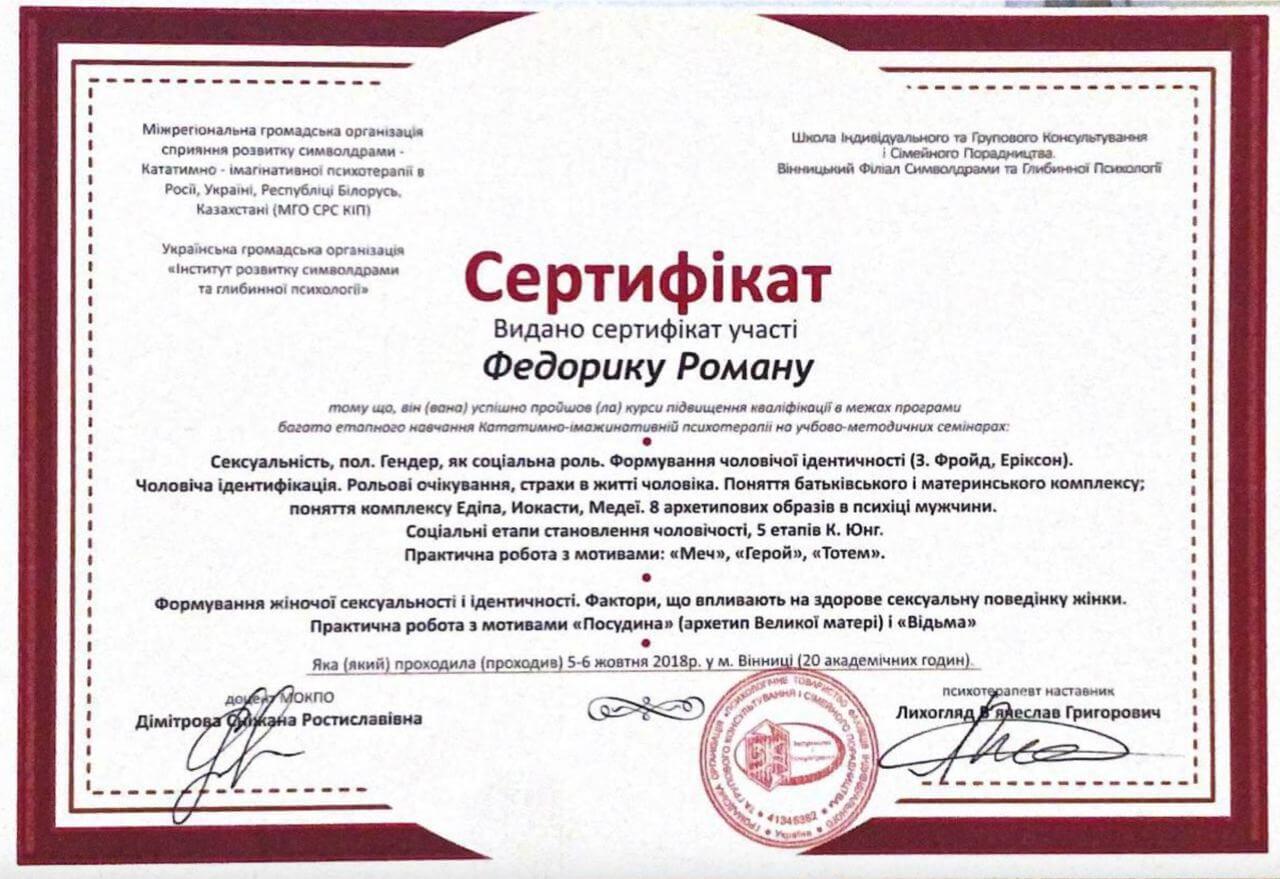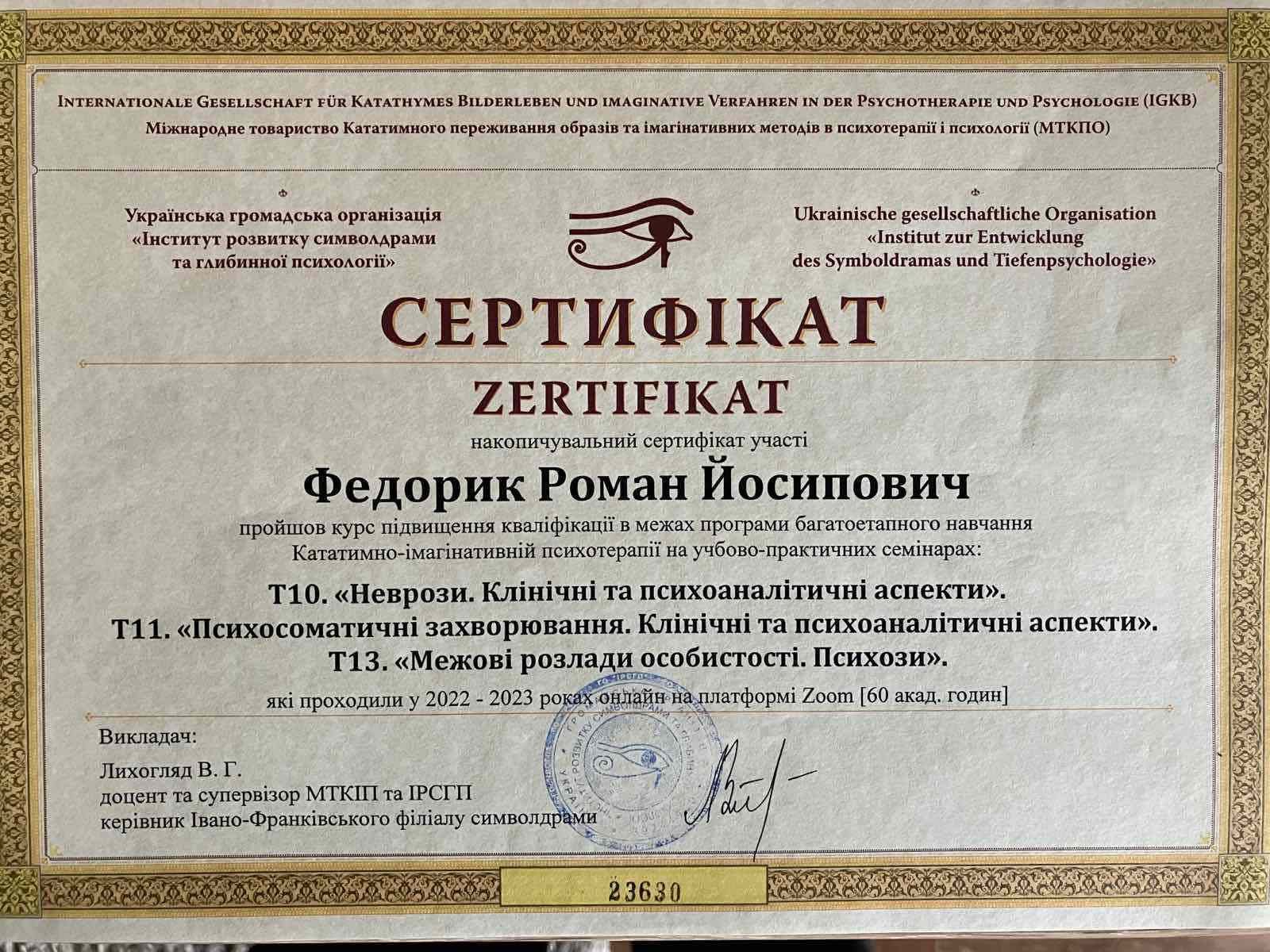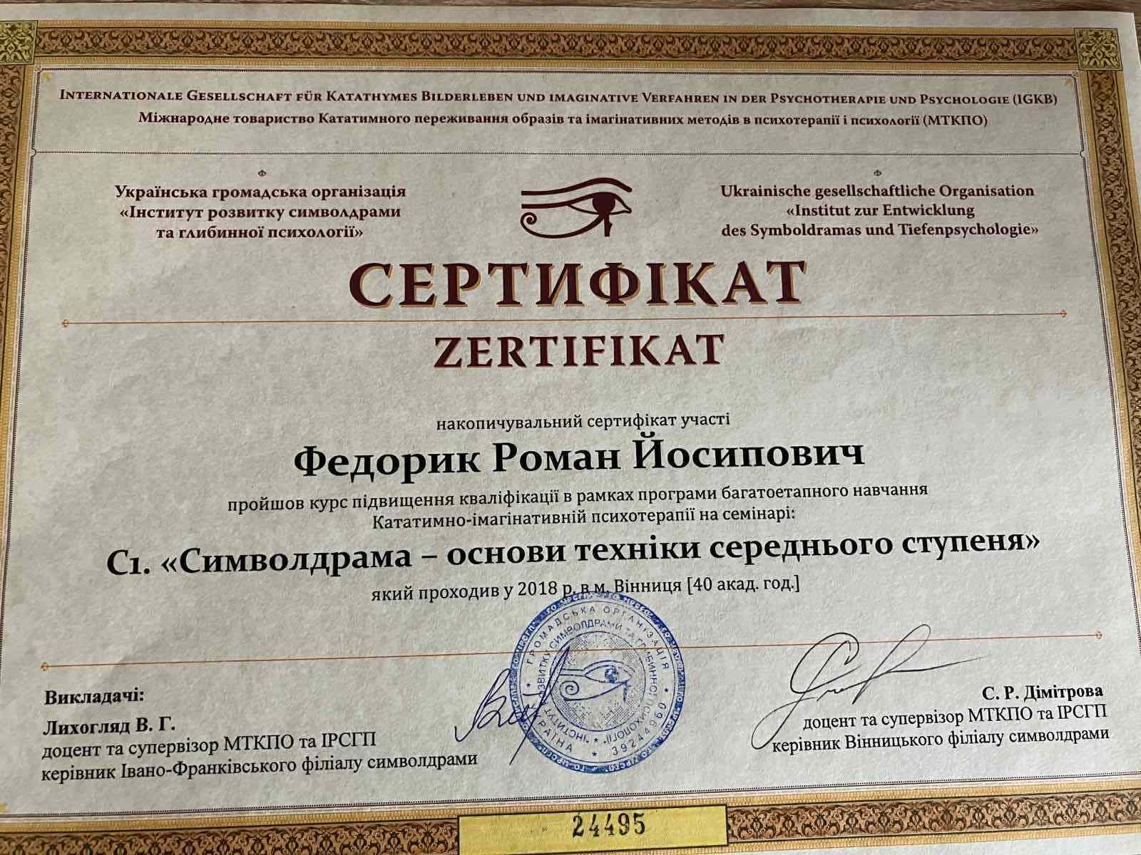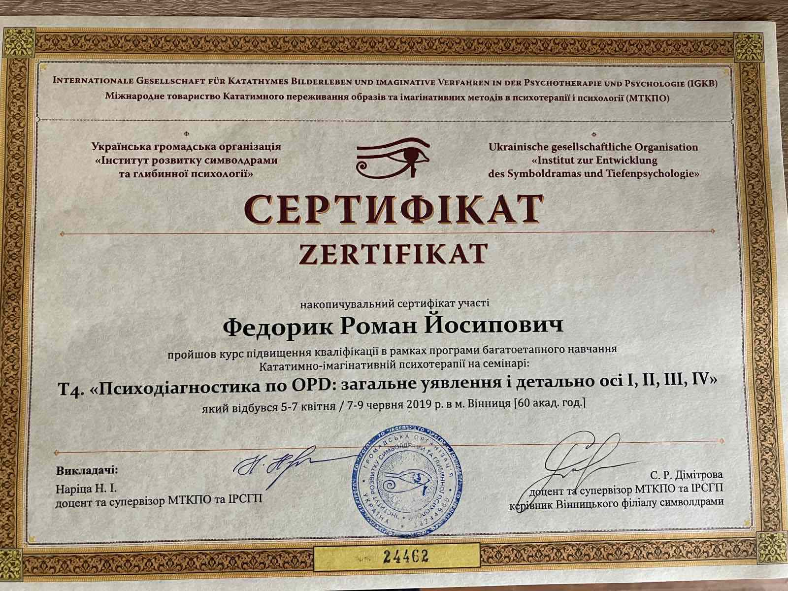 Участие в психотерапевтической группе; освоение техник практической работы; получение звания психотерапевта. - имеющаяся собственная психотерапия, супервизия и постоянные учения, для повышения профессиональной квалификации.