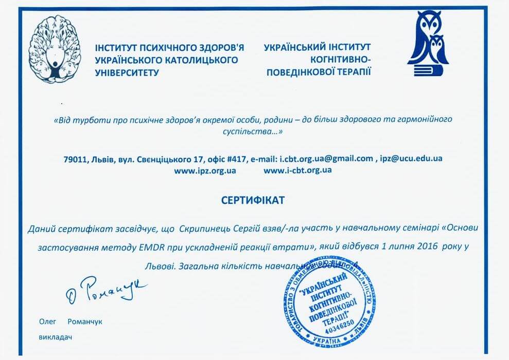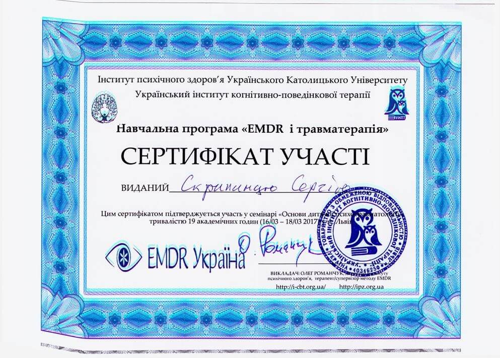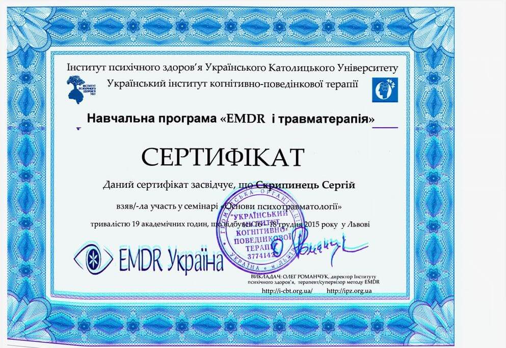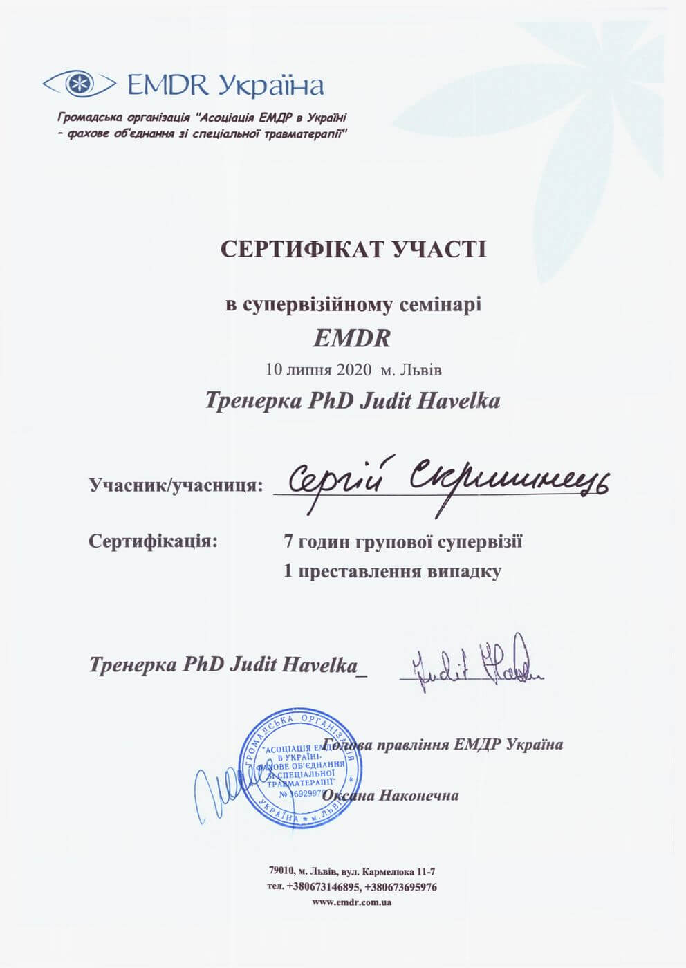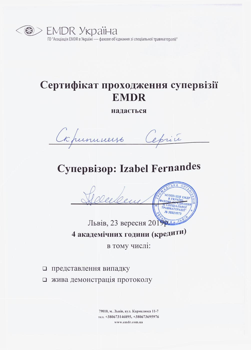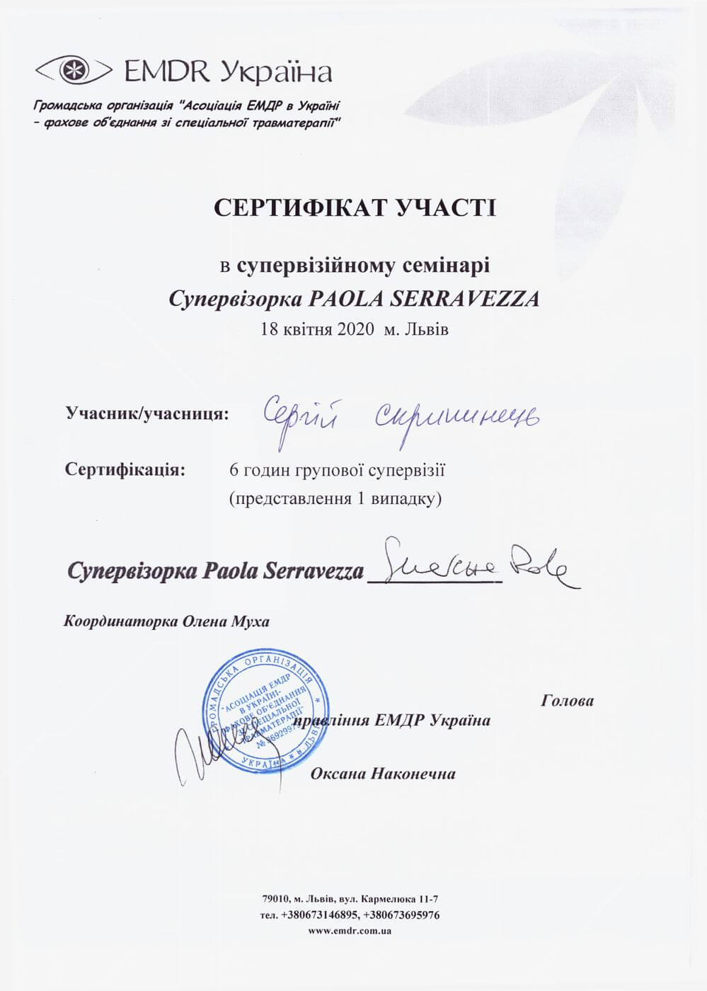Сертифікат проходження супервізії EMDR