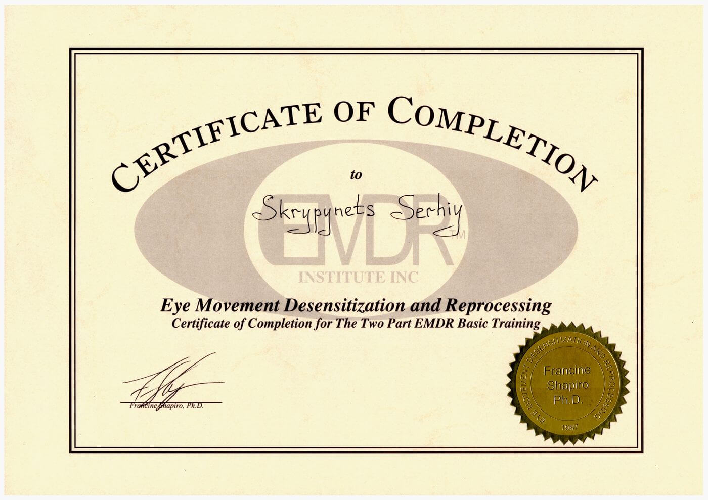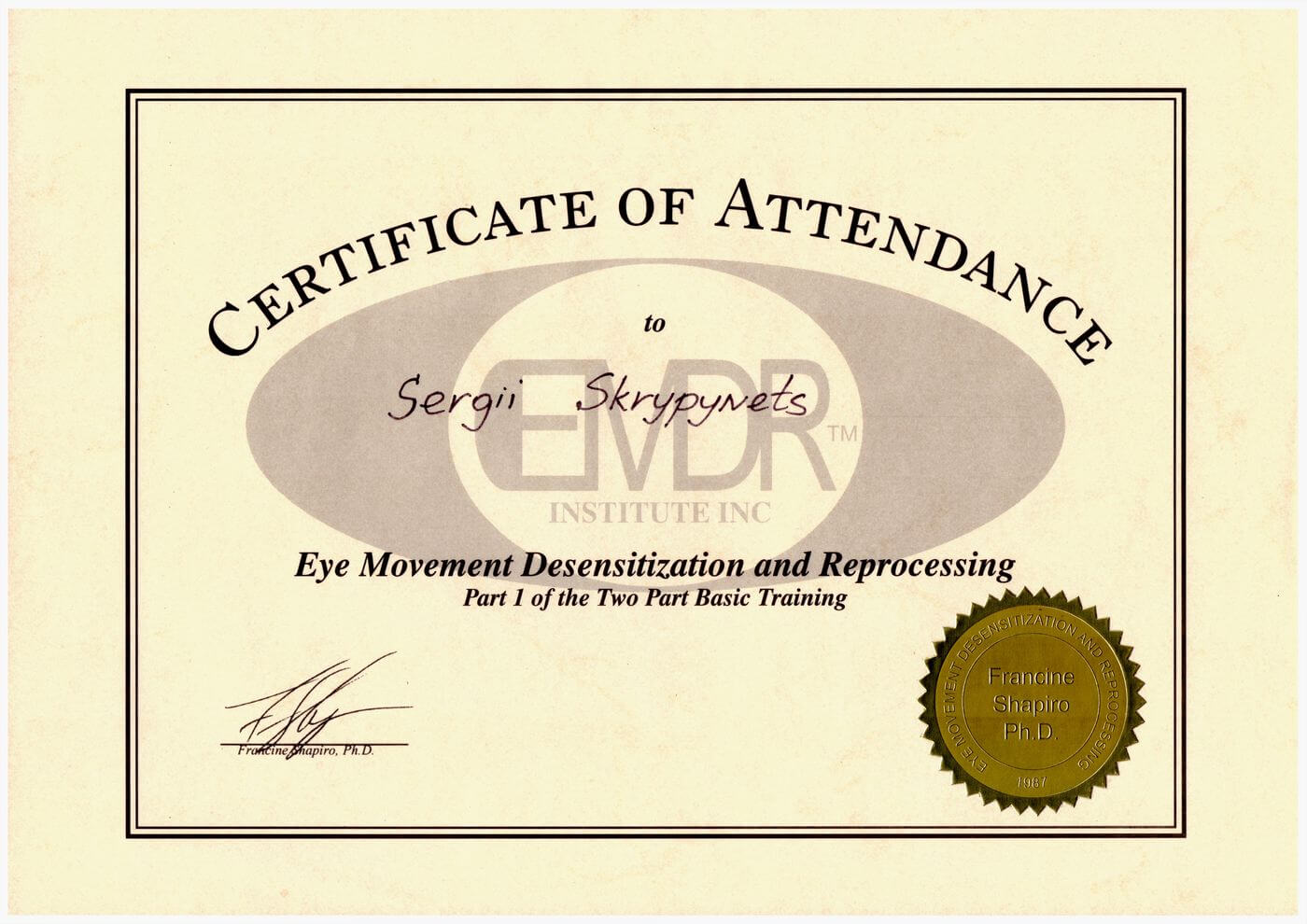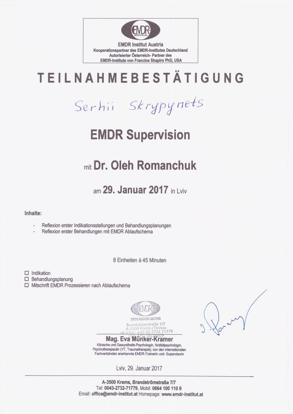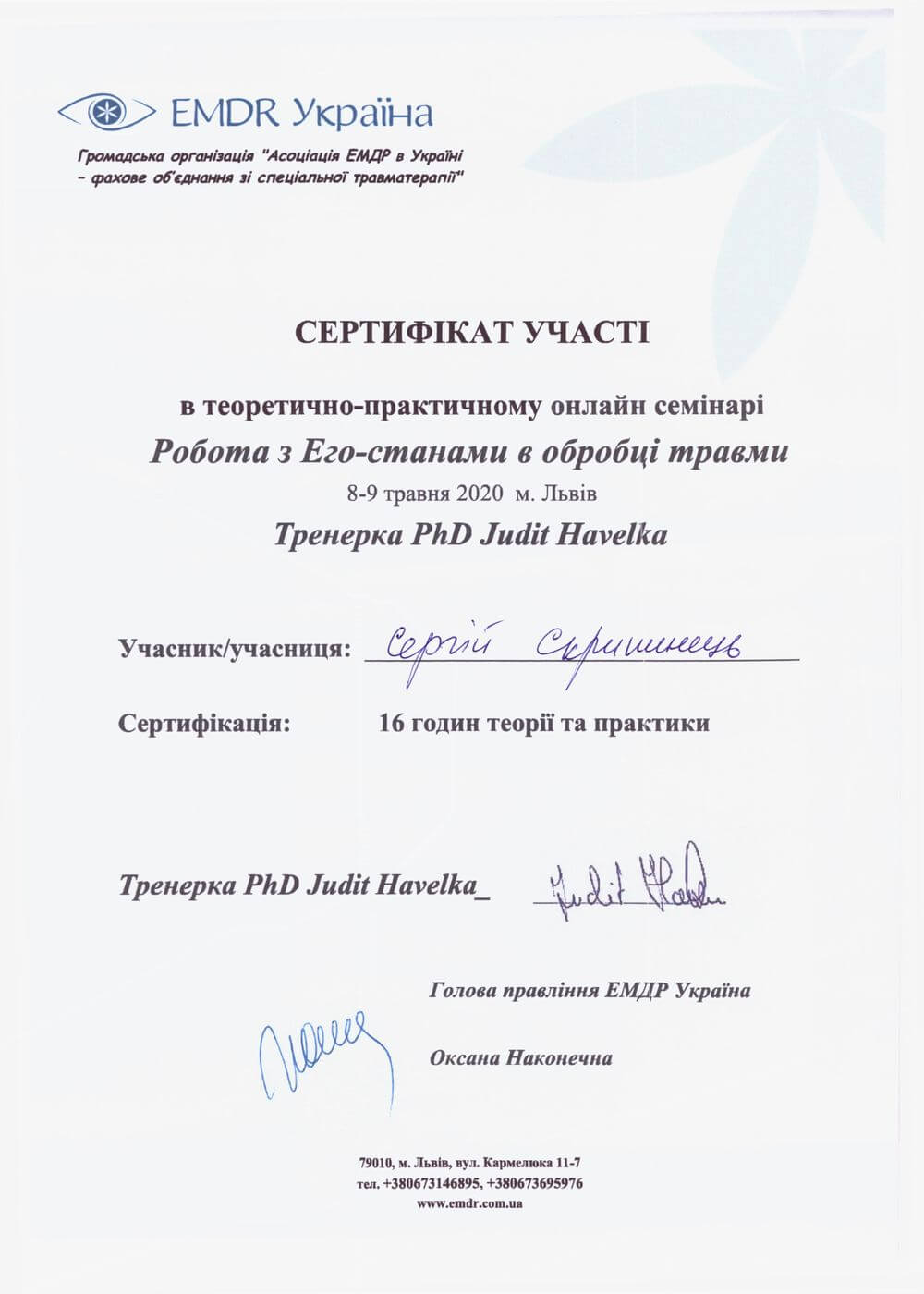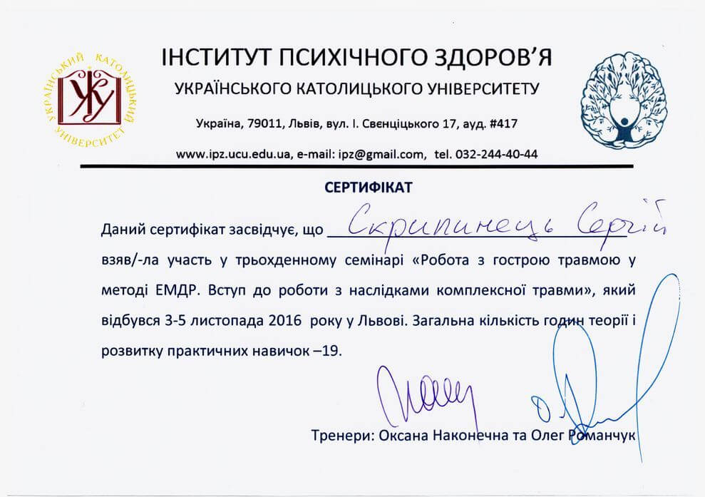 Сертифікат проходження супервізії EMDR