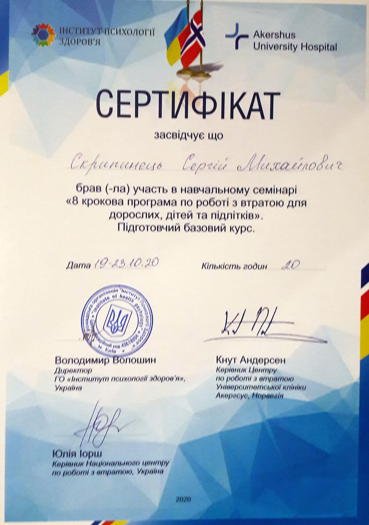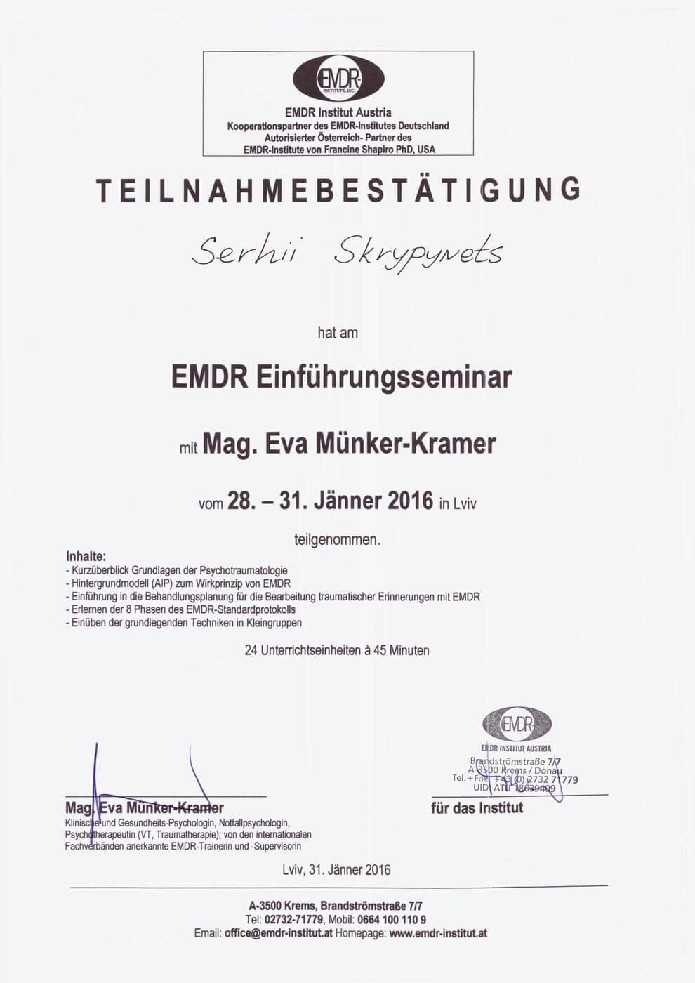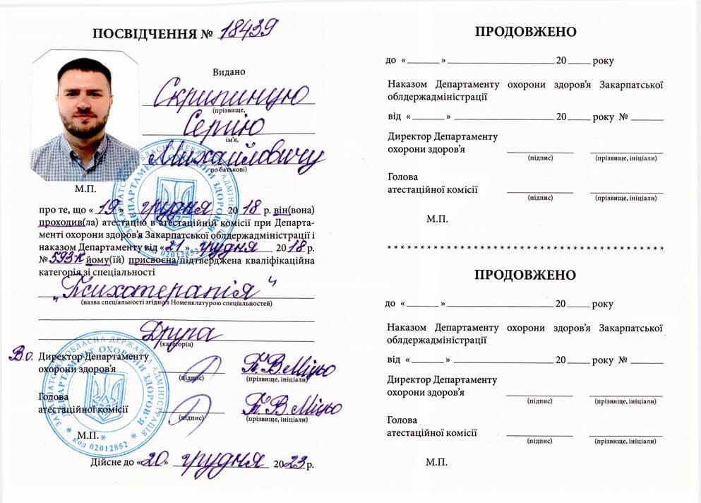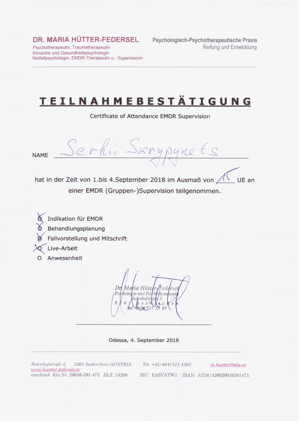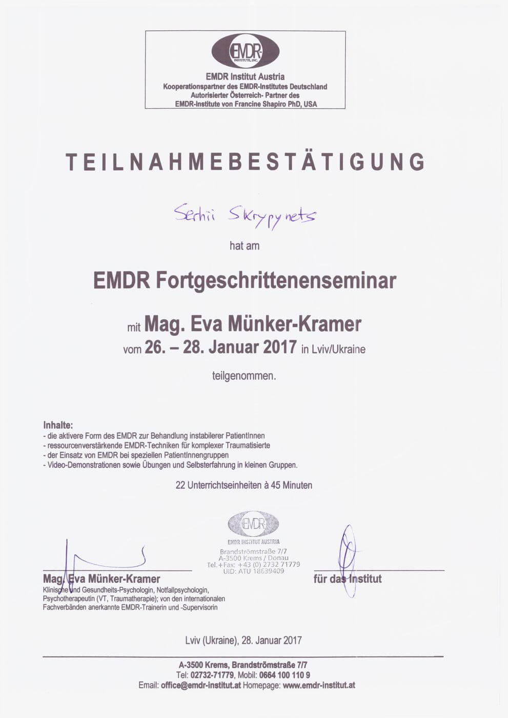 Сертифікат проходження супервізії EMDR