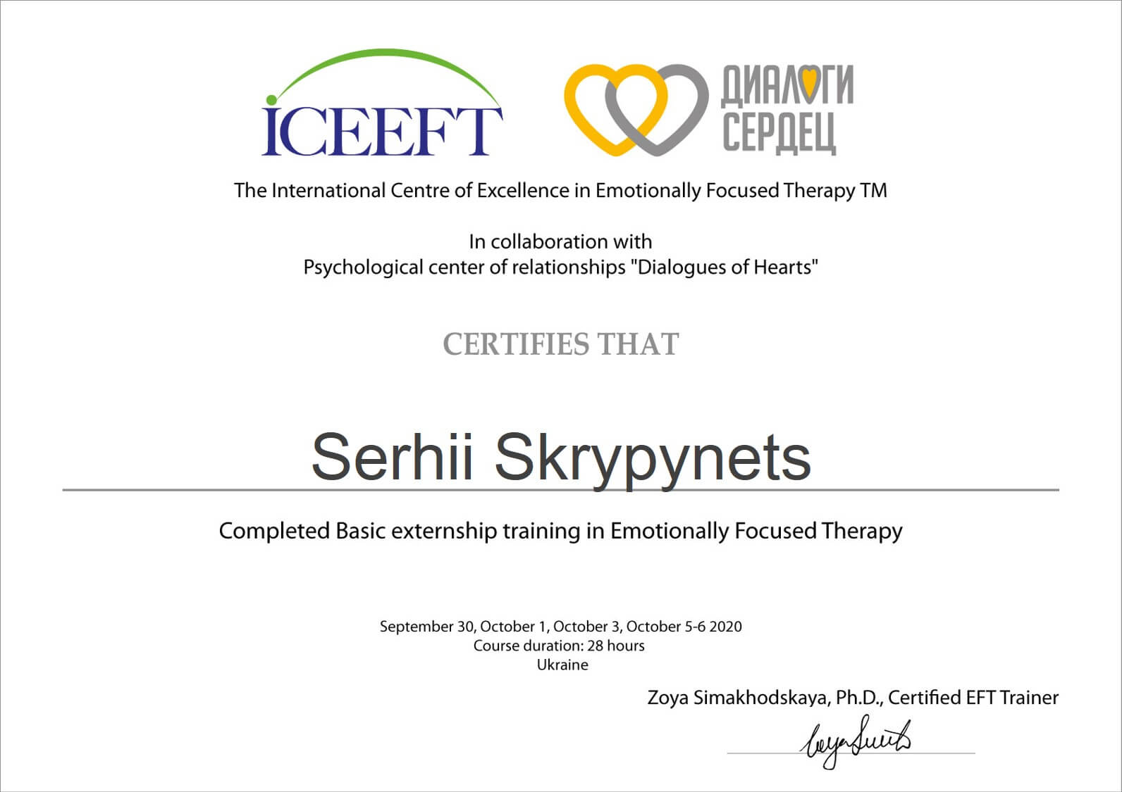 Базовий тренінг емоційно-фокусованої терапії пар (EFT) «Completed Basic externship training in Emotionally Focused Therapy», Зоя Сімаходська (2020)