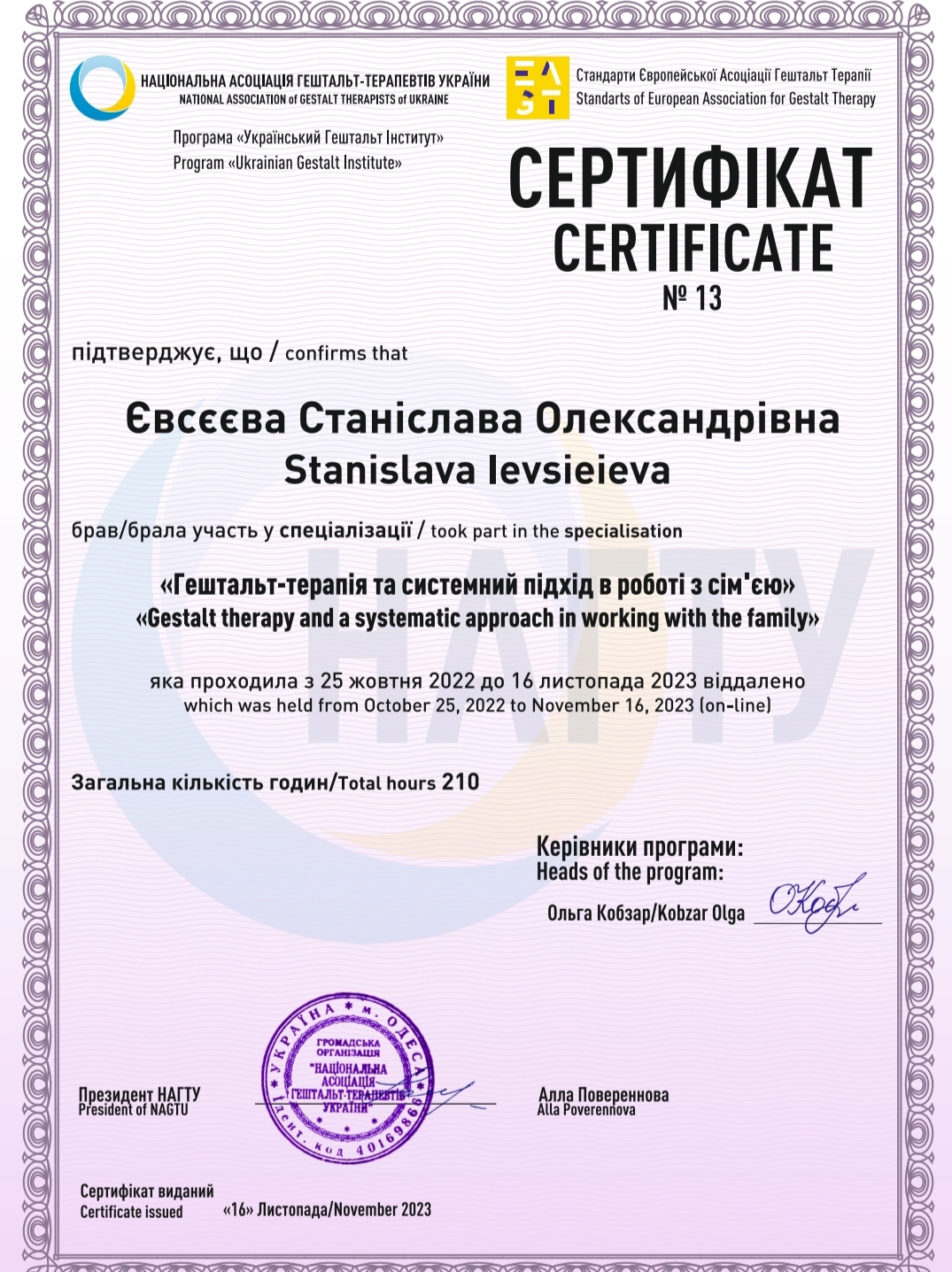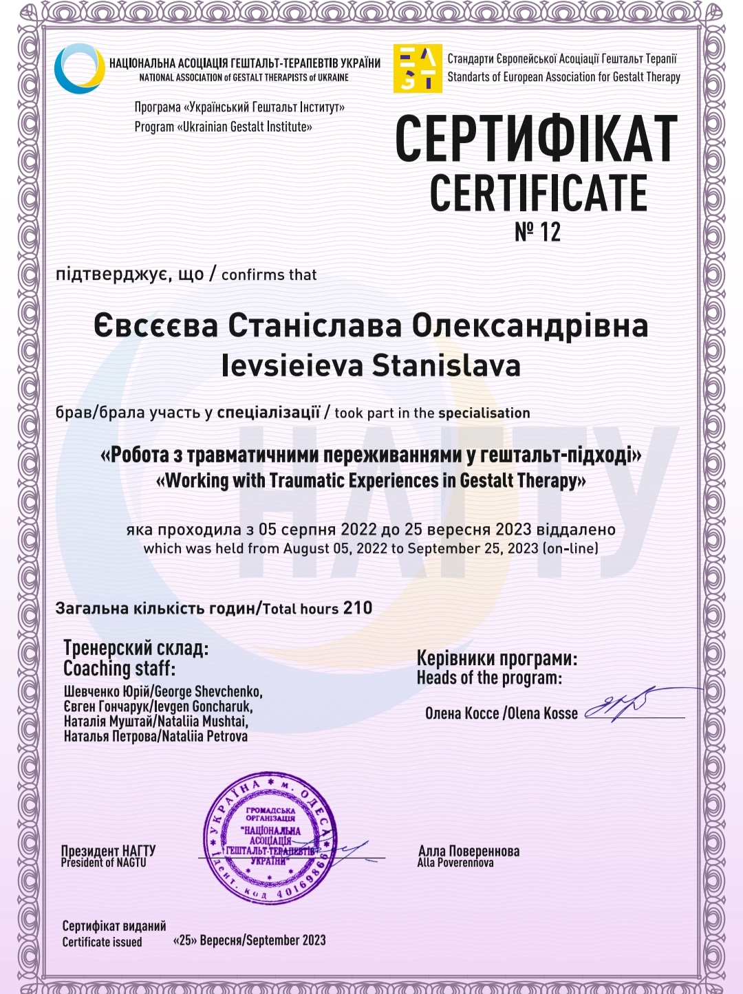 Учусь на 2 ступени Национальной Ассоциации Гештальт терапевтов Украины, сертификация в начале 2026 🖤