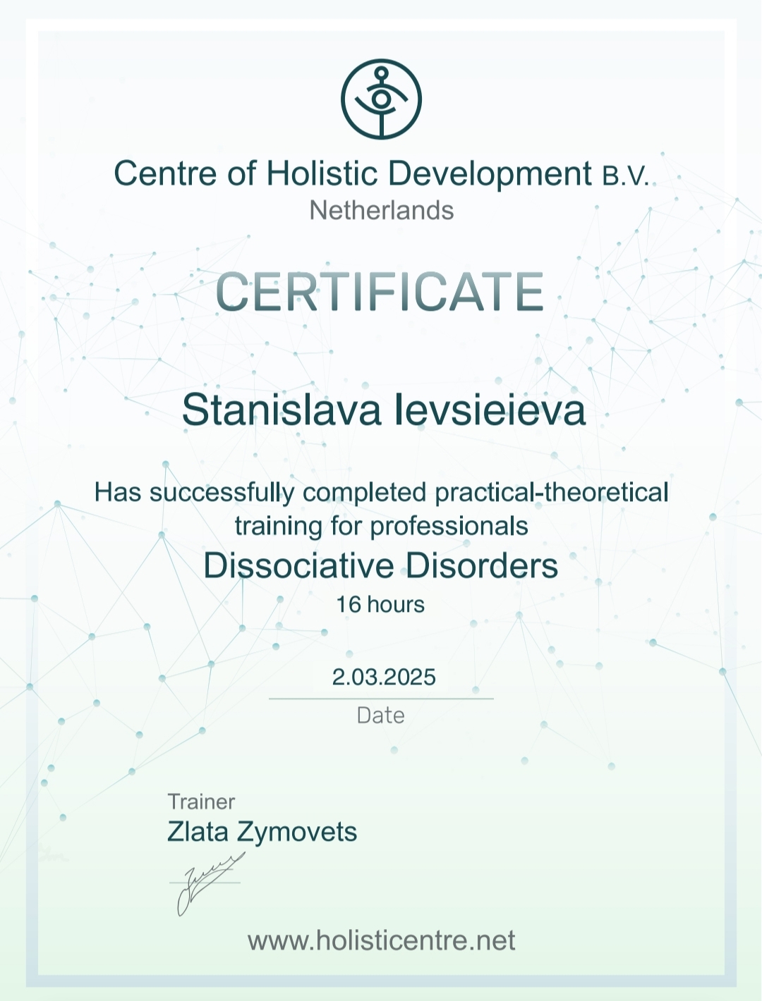 Сертифицирован как консультант по работе с военными. Методы работы при ПТСР для дальнейшей работы по поддержке и восстановлению психического здоровья военнослужащих и пострадавших от вооруженной агрессии 🖤