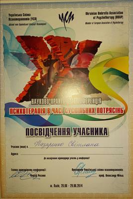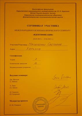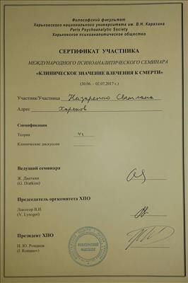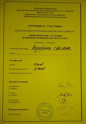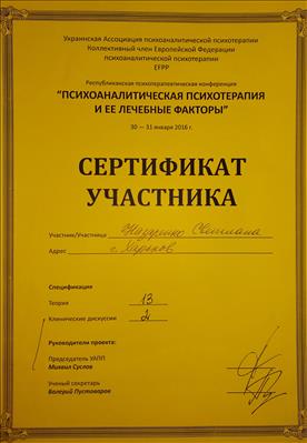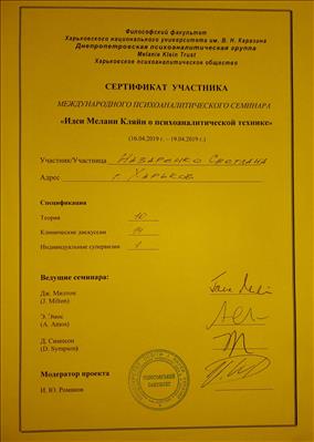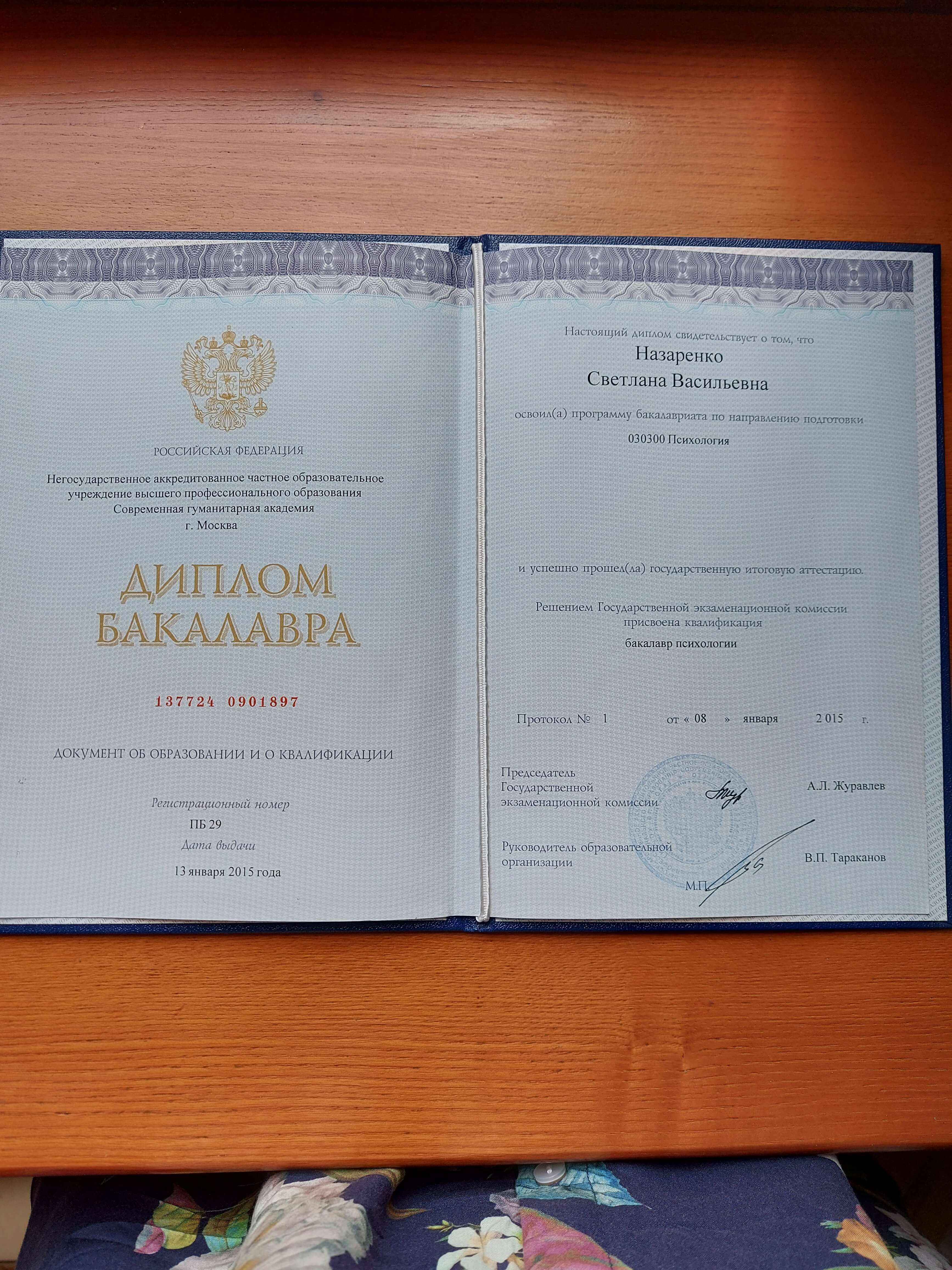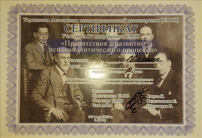 Высшее: практический психолог, магистратура. 5 летний проект, в рамках УСП - группа личного опыта с обучающим психоаналитиком.
