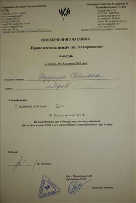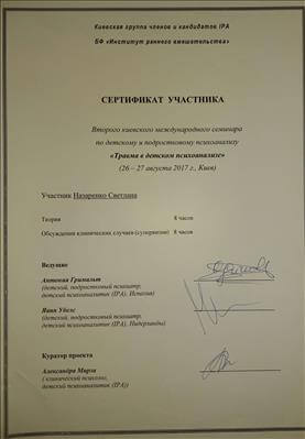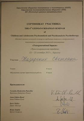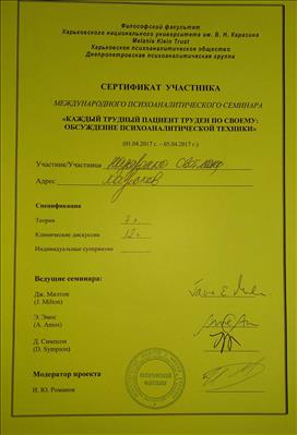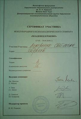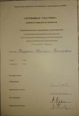 4летний обучающий проект EFPP - психоаналитический психотерапевт. Кляйнианский обучающий проект Melanie Klein Trust (Лондон). Немецкий проект по детям и подросткам. Теоретико-супервизионная психоаналитическая группа (постоянно). Детская теоретико-супервизионная группа (постоянно). Личный высокочастотный анализ ( более 1000 часов). Член этической комиссии в УСП.