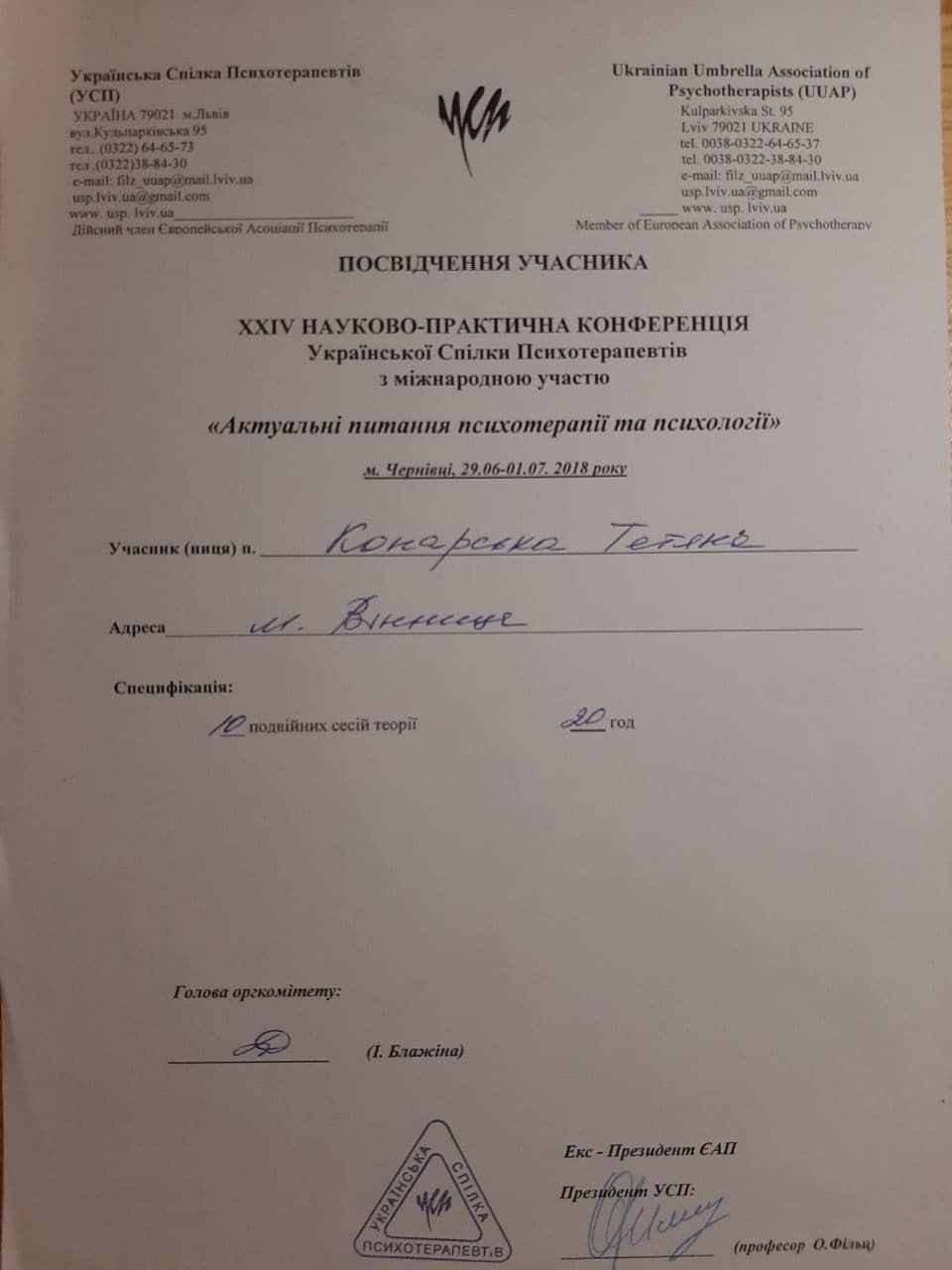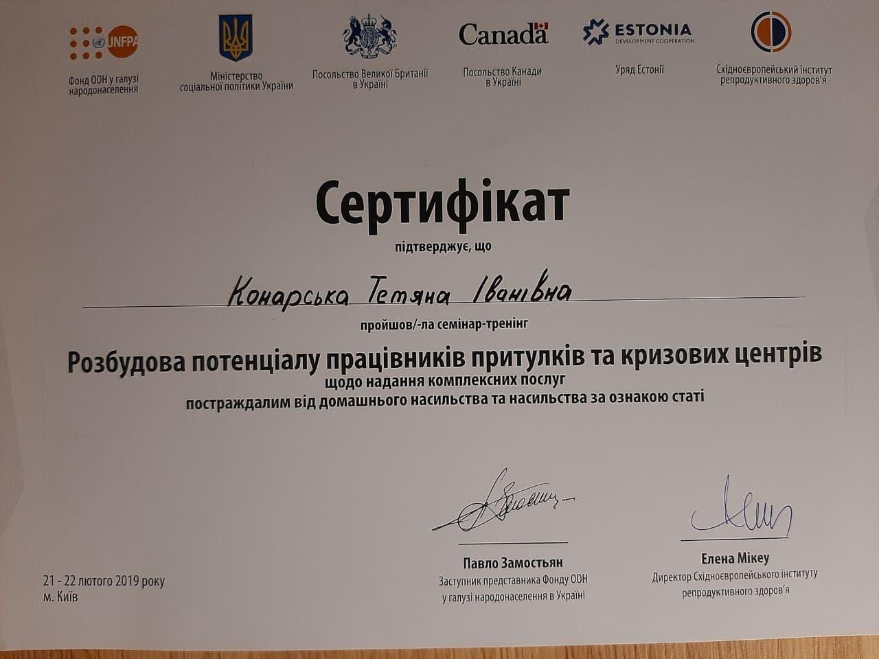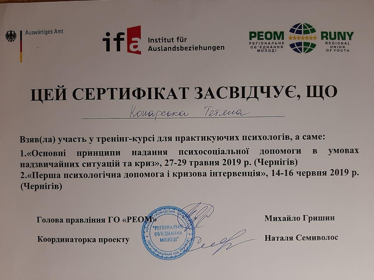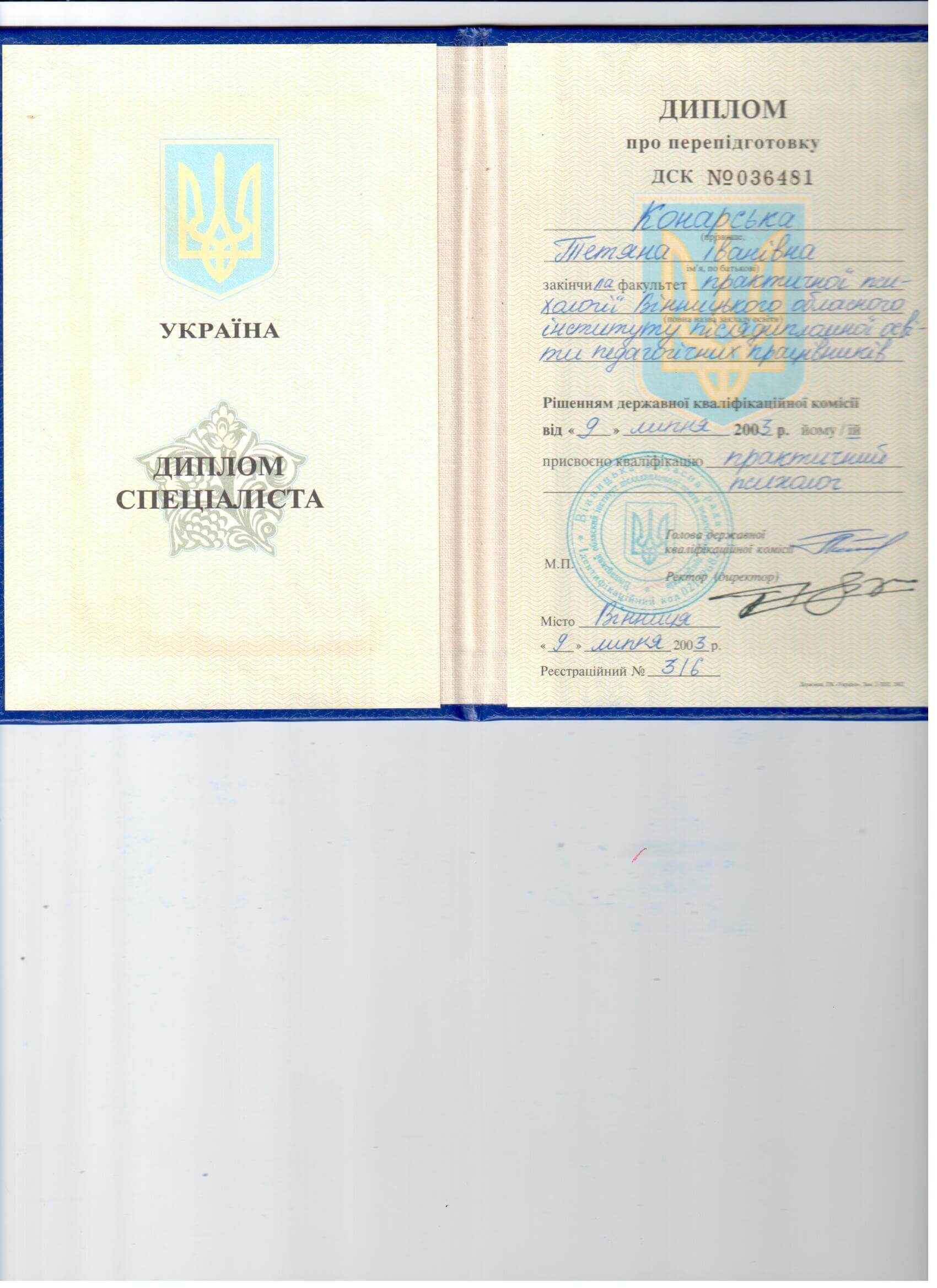 Винницкий медицинский институт - лечебное дело, врач- психофизиолог. Винницкий областной институт последипломного образования педагогов (второе высшее образование)- практический психолог. Закончила пятилетний проект по гештальт терапии, трехлетний Украино- Австрийский проект по EMDR (ДПДГ), курсы по ММРI-2, BFQ-2, HCS Integrity Check, тренинги по первой психологической помощи, принципах защиты в работе с уязвимыми категориями населения, предупреждение и работа с пострадавшими от домашнего и гендерно обусловленного насилия. Состою в Дивизионе психического здоровья Национальной психологической ассоциации. Возглавляю Винницкий филиал Украинского сообщества психотерапевтов.