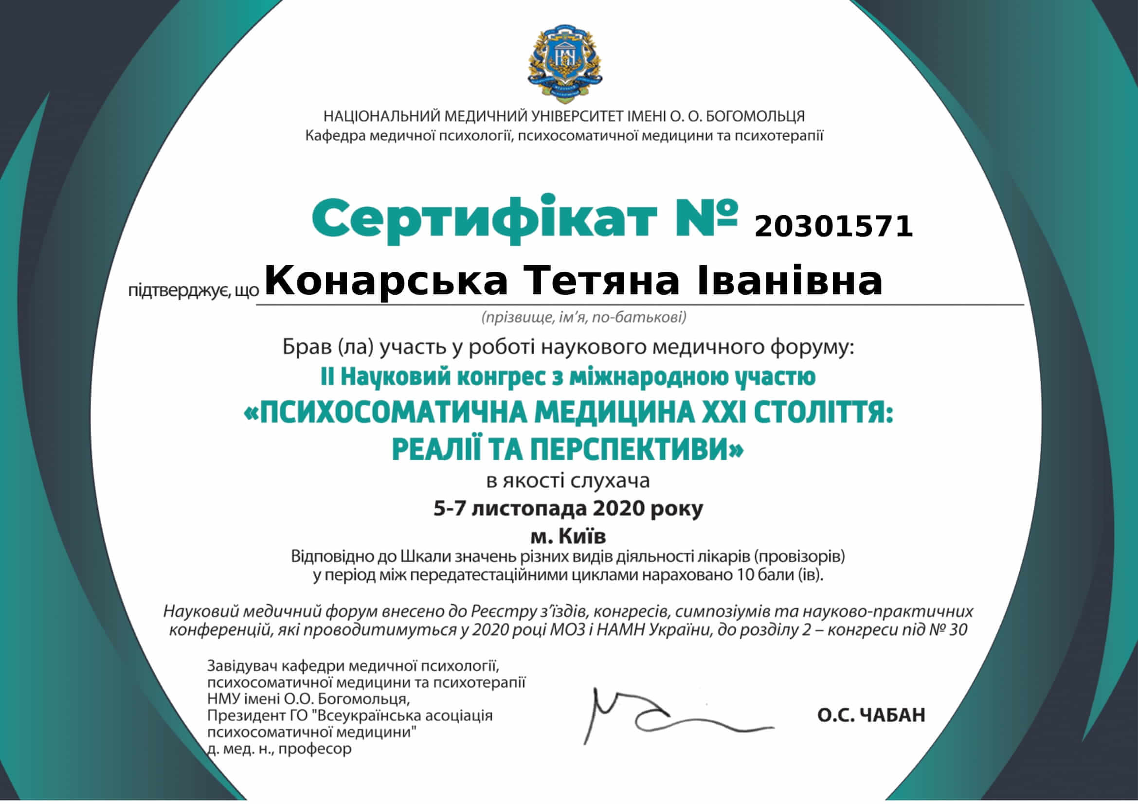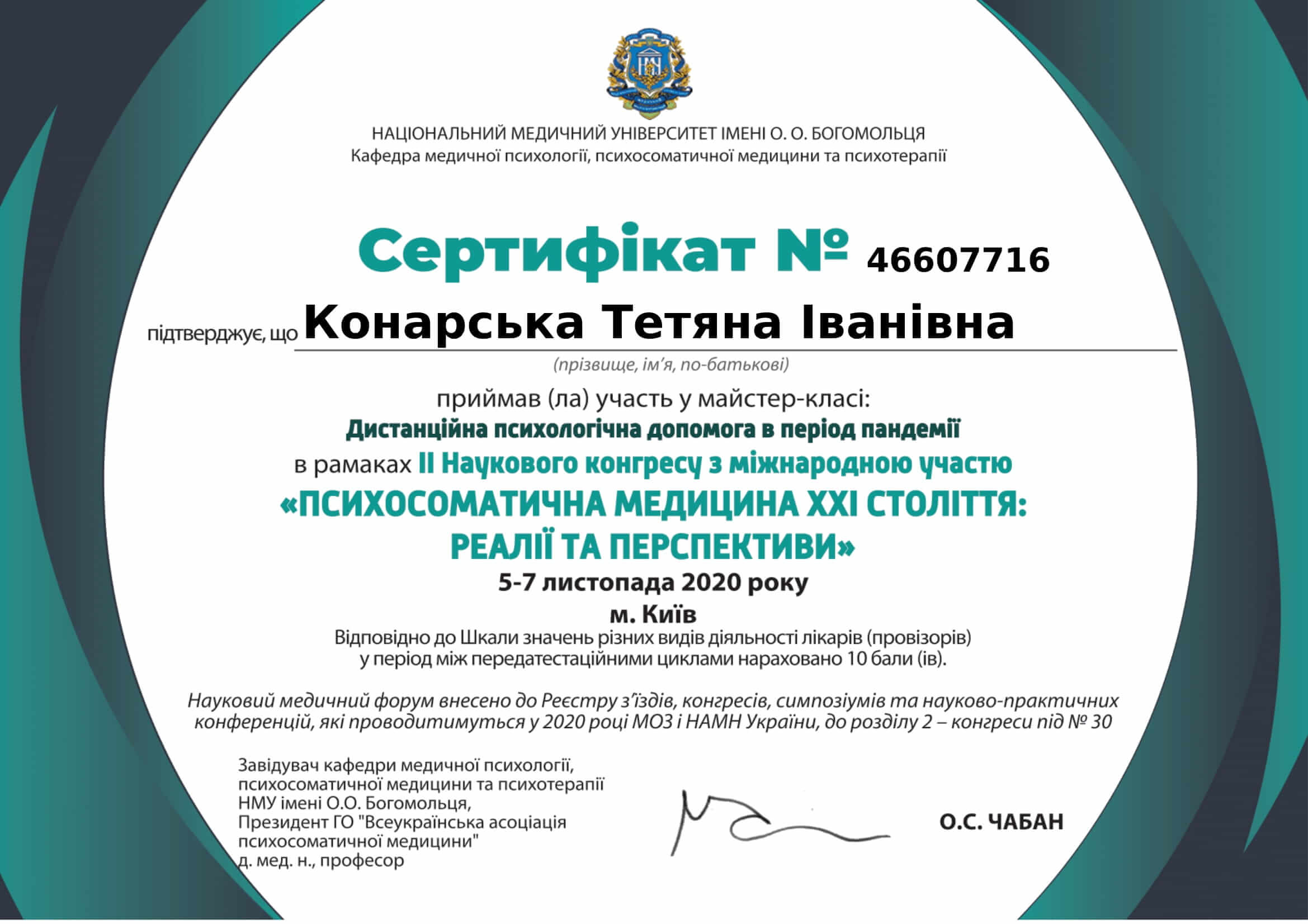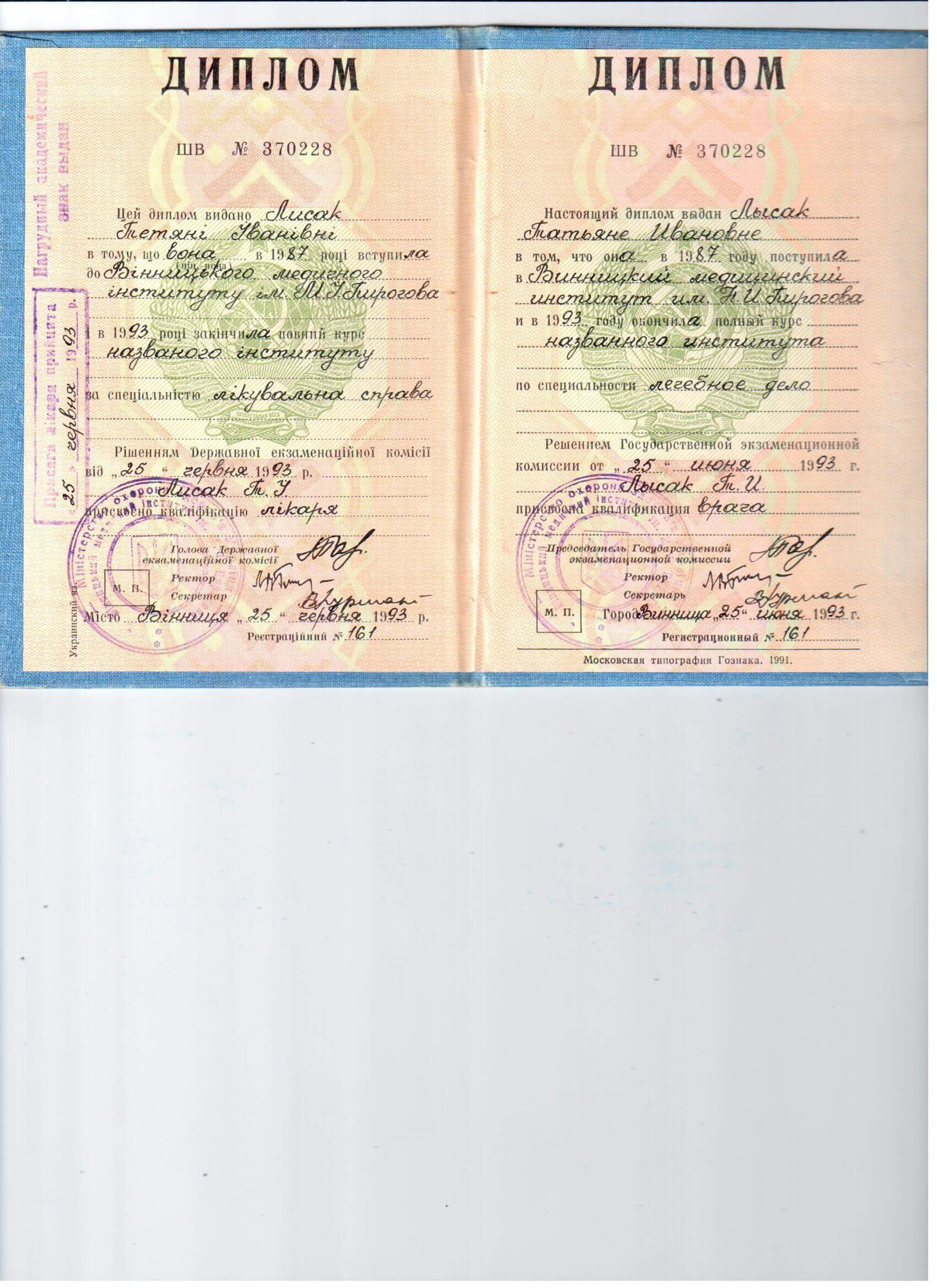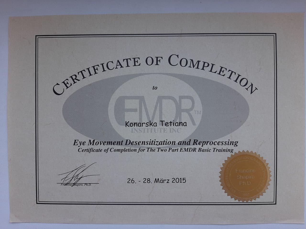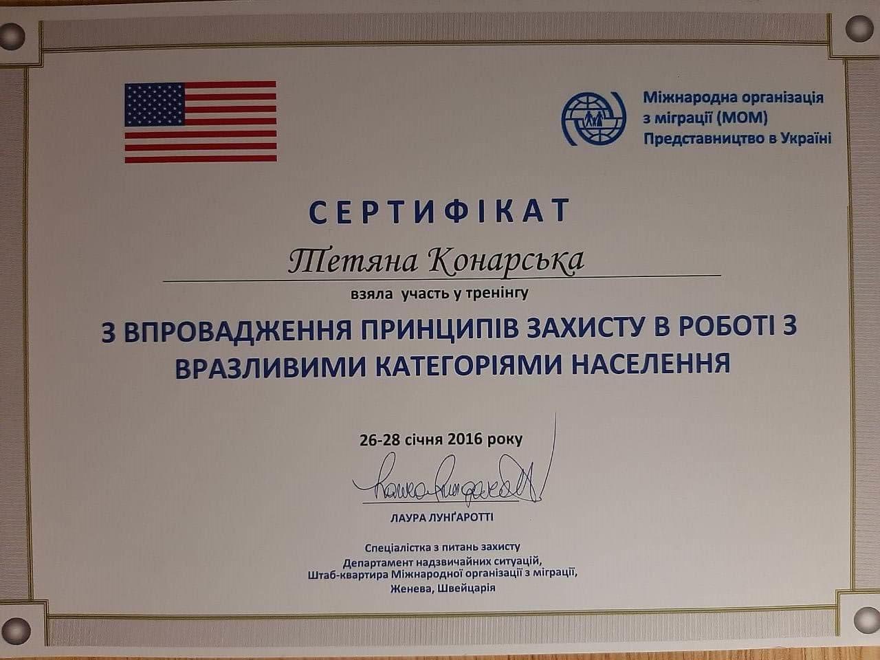 Винницкий медицинский институт - лечебное дело, врач- психофизиолог. Винницкий областной институт последипломного образования педагогов (второе высшее образование)- практический психолог. Закончила пятилетний проект по гештальт терапии, трехлетний Украино- Австрийский проект по EMDR (ДПДГ), курсы по ММРI-2, BFQ-2, HCS Integrity Check, тренинги по первой психологической помощи, принципах защиты в работе с уязвимыми категориями населения, предупреждение и работа с пострадавшими от домашнего и гендерно обусловленного насилия. Состою в Дивизионе психического здоровья Национальной психологической ассоциации. Возглавляю Винницкий филиал Украинского сообщества психотерапевтов.