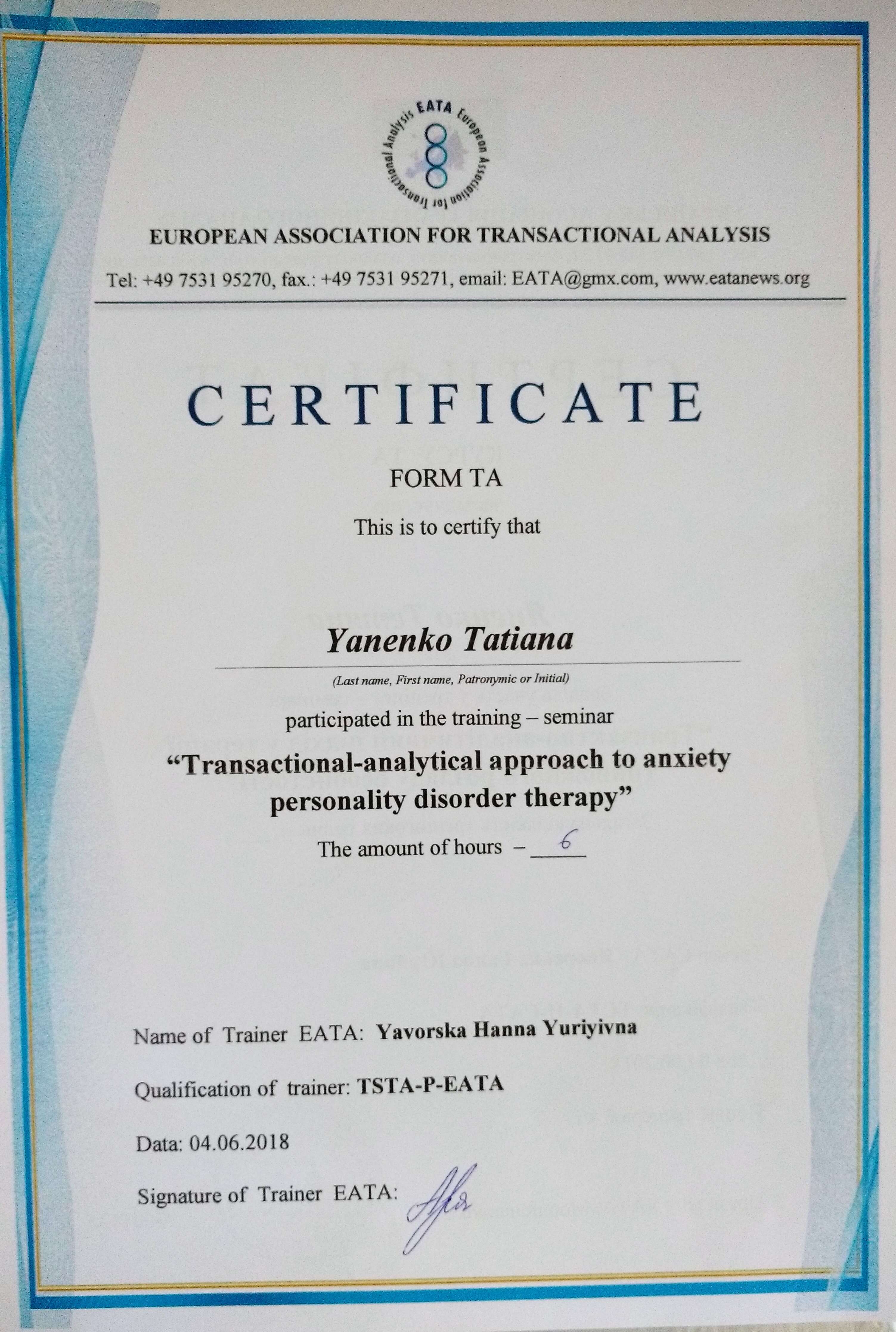 — 2018 г. Европейская ассоциация транзактного анализа «Транзактно-аналитический подход в терапии тревожного расстройства личности».