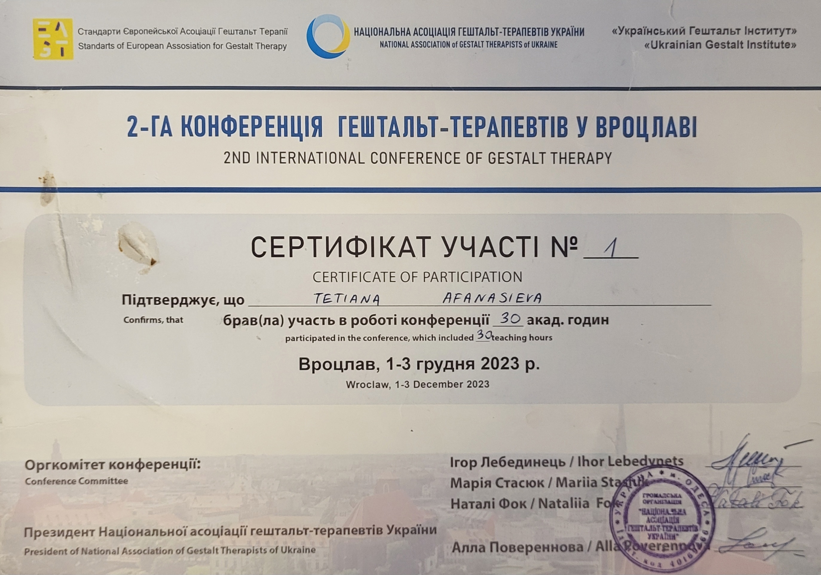 НАЦІОНАЛЬНА АСОЦІАЦІЯ ГЕШТАЛЬТ-ТЕРАПЕВТІВ УКРАЇНИ «Український Гештальт Інститут»